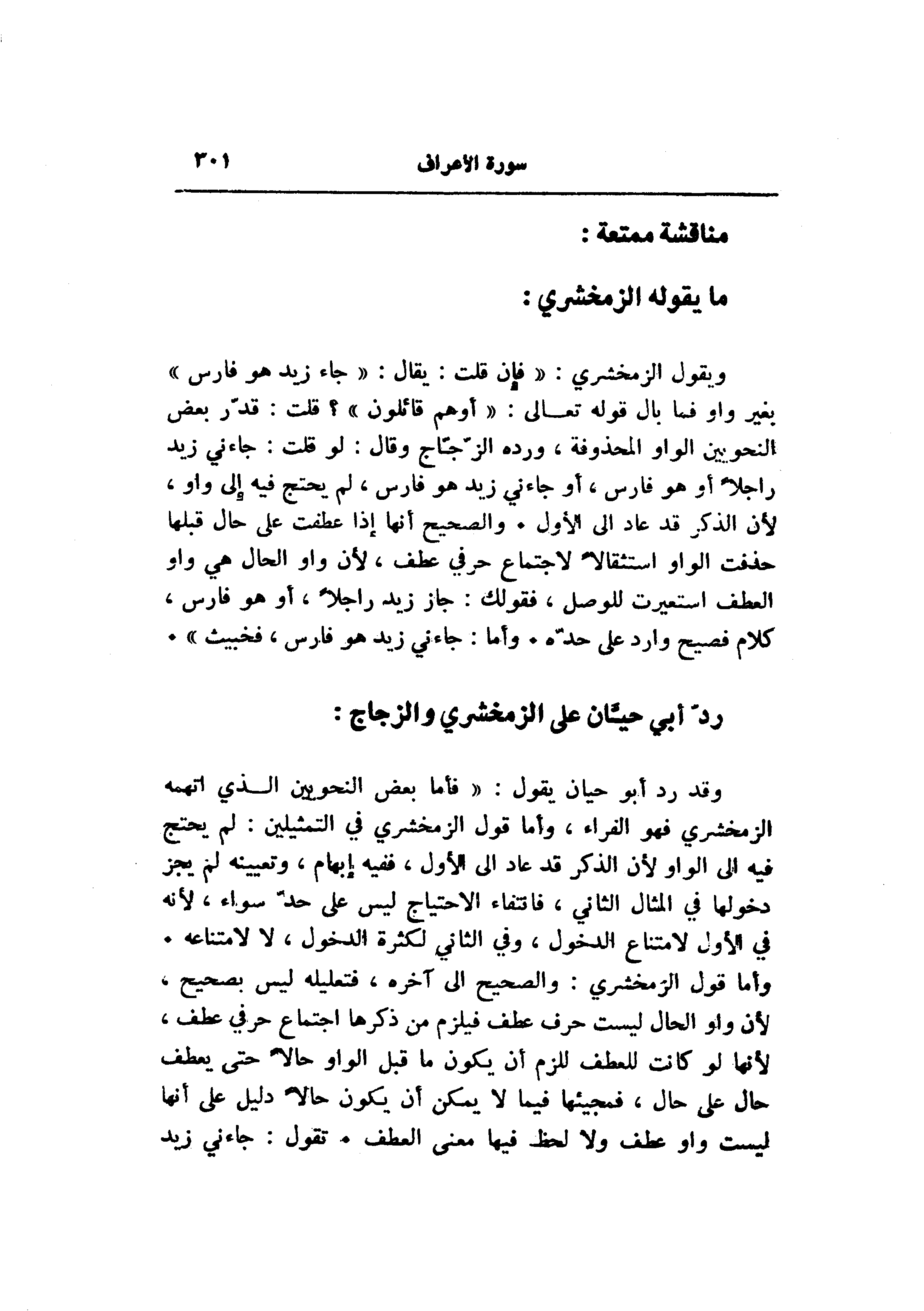 وقد رد أبو حيان يقول: «فأما بعض النحويين الذي اتهمه الزمخشري فهو الفراء، وأما قول الزمخشري في التمثيلين: لم يحتج فيه إلى الواو لأن الذكر قد عاد إلى الأول، ففيه إبهام، وتعيينه لم يجز دخولها في المثال الثاني، فانتفاء الاحتياج ليس على حدّ سواء، لأنه في الأول لامتناع الدخول، وفي الثاني لكثرة الدخول، ولا لامتناعه.