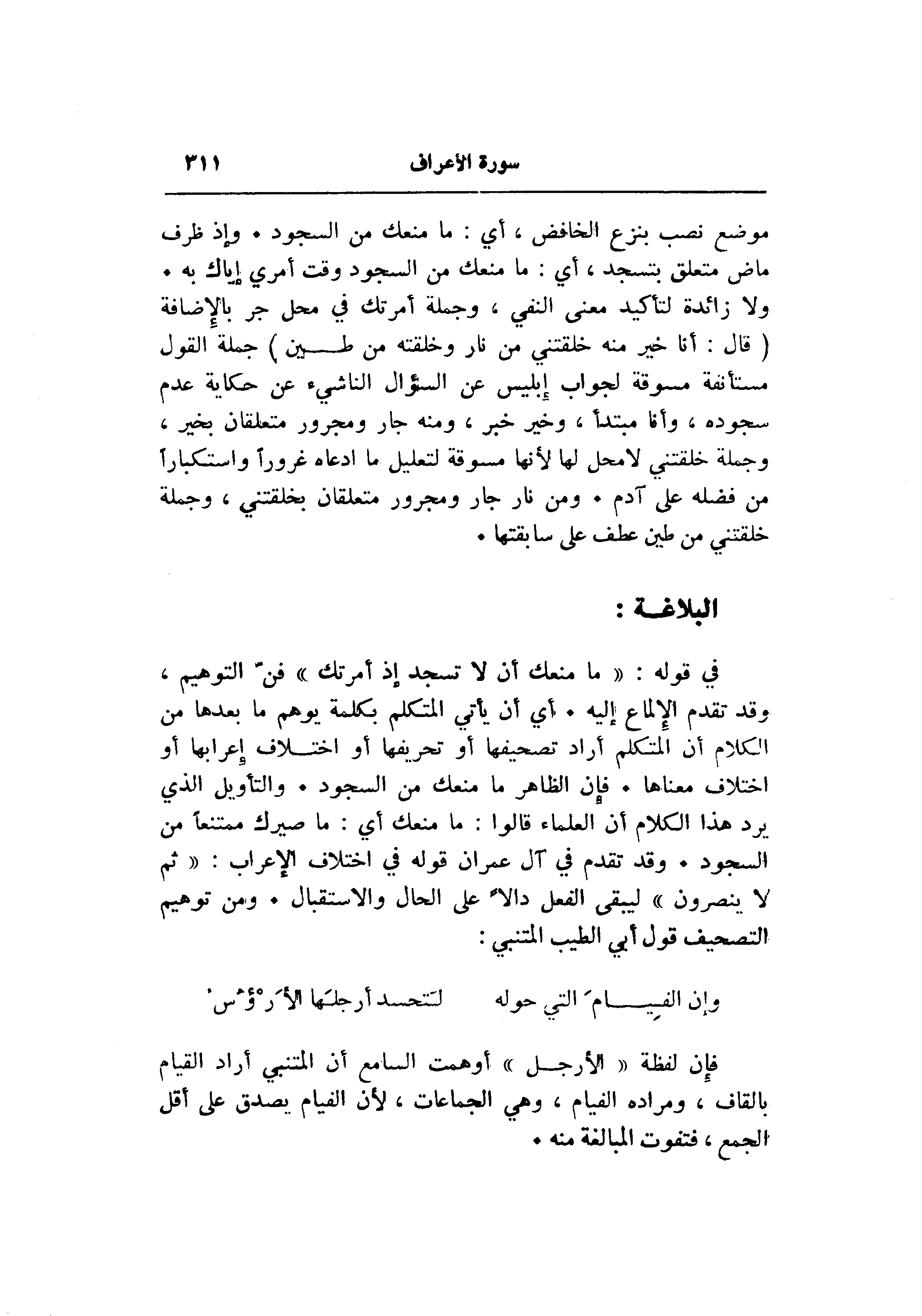 في قوله: «ما منعك أن لا تسجد إذ أمرتك» فنّ التوهيم، وقد تقدم الإلماع إليه. أي أن يأتي المتكلم بكلمة يوهم ما بعدها من الكلام أن المتكلم أراد تصحيفها أو تحريفها أو اختلاف إعرابها أو اختلاف معناها. فإن الظاهر ما منعك من السجود. والتأويل الذي يرد هذا الكلام أن العلماء قالوا: ما منعك أي: ما صيرك ممتنعا من السجود. وقد تقدم في آل عمران قوله في اختلاف الإعراب: «ثم لا ينصرون» ليبقى الفعل دالا على الحال والاستقبال. ومن توهيم التصحيف قول أبي الطيب المتنبي: