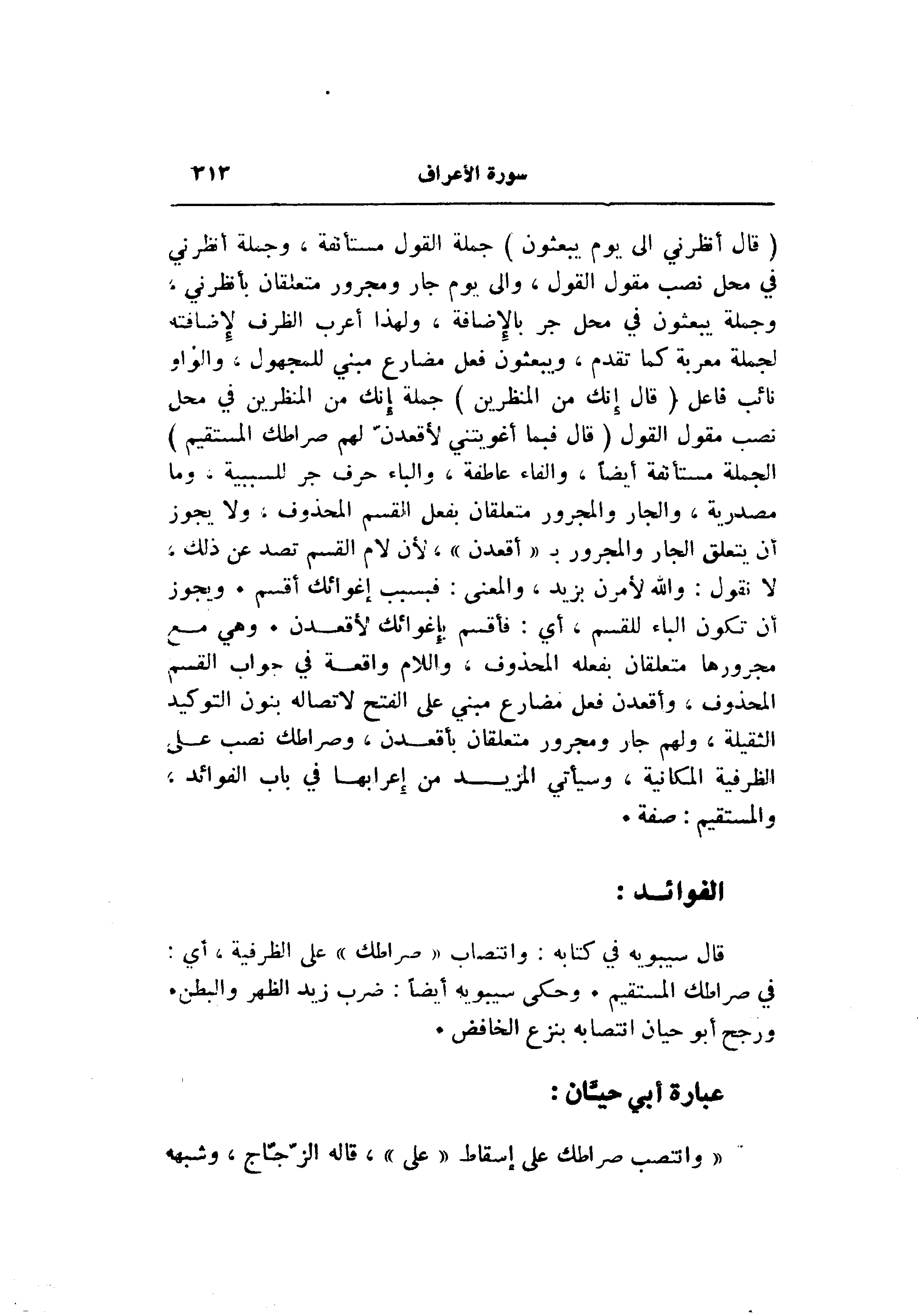 (قالَ أَنْظِرْنِي إِلى يَوْمِ يُبْعَثُونَ) جملة القول مستأنفة، وجملة أنظرني في محل نصب مقول القول، والى يوم جار ومجرور متعلقان بأنظرني، وجملة يبعثون في محل جر بالإضافة، ولهذا أعرب الظرف لإضافته لجملة معربة كما تقدم، ويبعثون فعل مضارع مبني للمجهول، والواو نائب فاعل (قالَ إِنَّكَ مِنَ الْمُنْظَرِينَ) جملة إنك من المنظرين في محل نصب مقول القول (قالَ فَبِما أَغْوَيْتَنِي لَأَقْعُدَنَّ لَهُمْ صِراطَكَ الْمُسْتَقِيمَ) الجملة مستأنفة أيضا، والفاء عاطفة، والباء حرف جر للسببية، وما مصدرية، والجار والمجرور متعلقان بفعل القسم المحذوف، ولا يجوز أن يتعلق الجار والمجرور ب «أقعدن» ، لأن لام القسم تصد عن ذلك، لا نقول: والله لأمرن بزيد، والمعنى: فبسبب إغوائك أقسم. ويجوز أن تكون الباء للقسم، أي: فأقسم بإغوائك لأقعدن. وهي مع مجرورها متعلقان بفعله المحذوف، واللام واقعة في جواب القسم المحذوف، وأقعدن فعل مضارع مبني على الفتح لاتصاله بنون التوكيد الثقيلة، ولهم جار ومجرور متعلقان بأقعدن، وصراطك نصب على الظرفية المكانية، وسيأتي المزيد من إعرابها في باب الفوائد، والمستقيم: صفة.