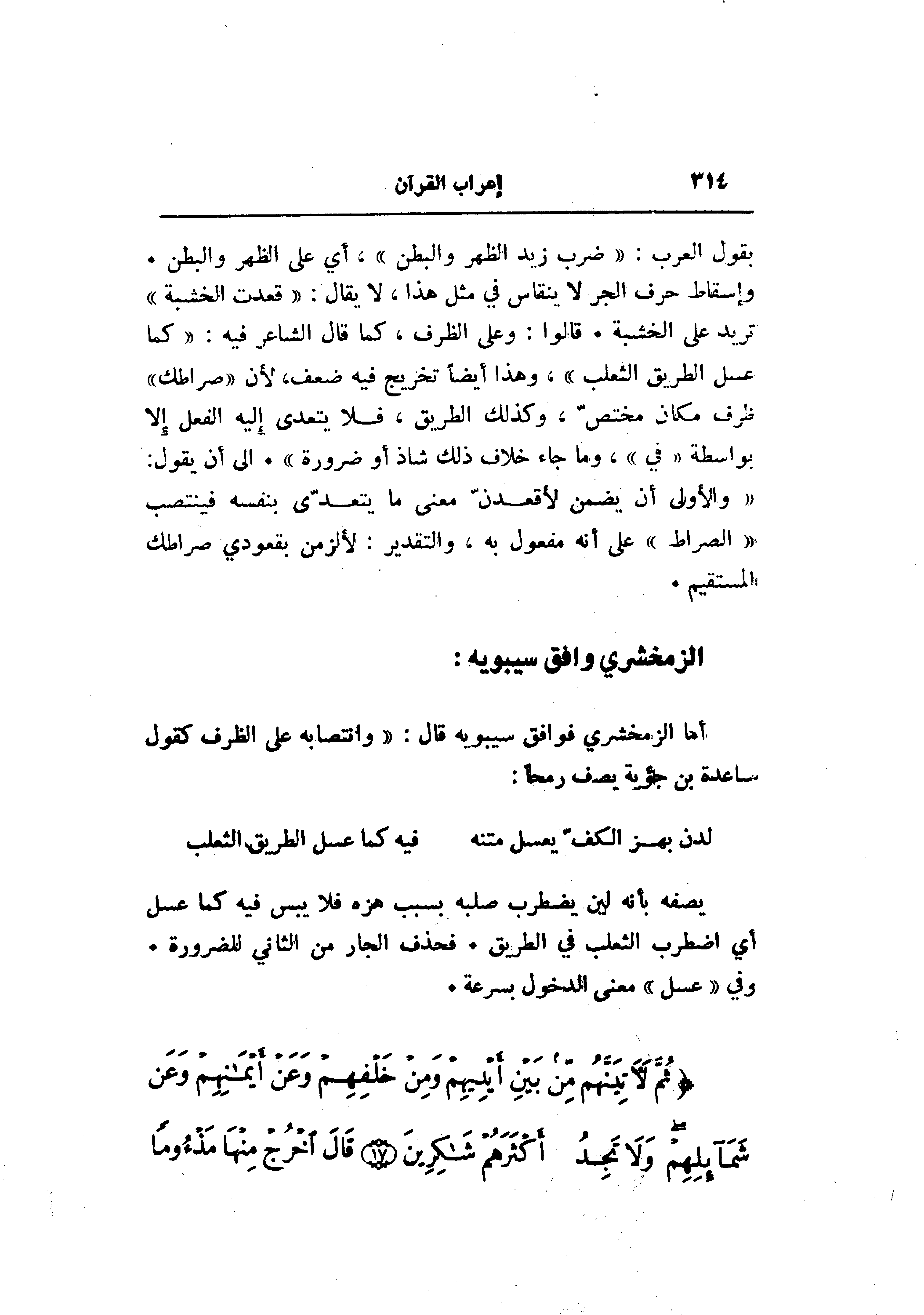 وإسقاط حرف الجر لا ينقاس في مثل هذا، لا يقال: «قعدت الخشبة» تريد على الخشبة. قالوا: وعلى الظرف، كما قال الشاعر فيه: «كما عسل الطريق الثعلب» ، وهذا أيضا تخريج فيه ضعف، لأن «صراطك» ظرف مكان مختصّ، وكذلك الطريق، فلا يتعدى إليه الفعل إلا بواسطة «في» ، وما جاء خلاف ذلك شاذ أو ضرورة» . الى أن يقول: