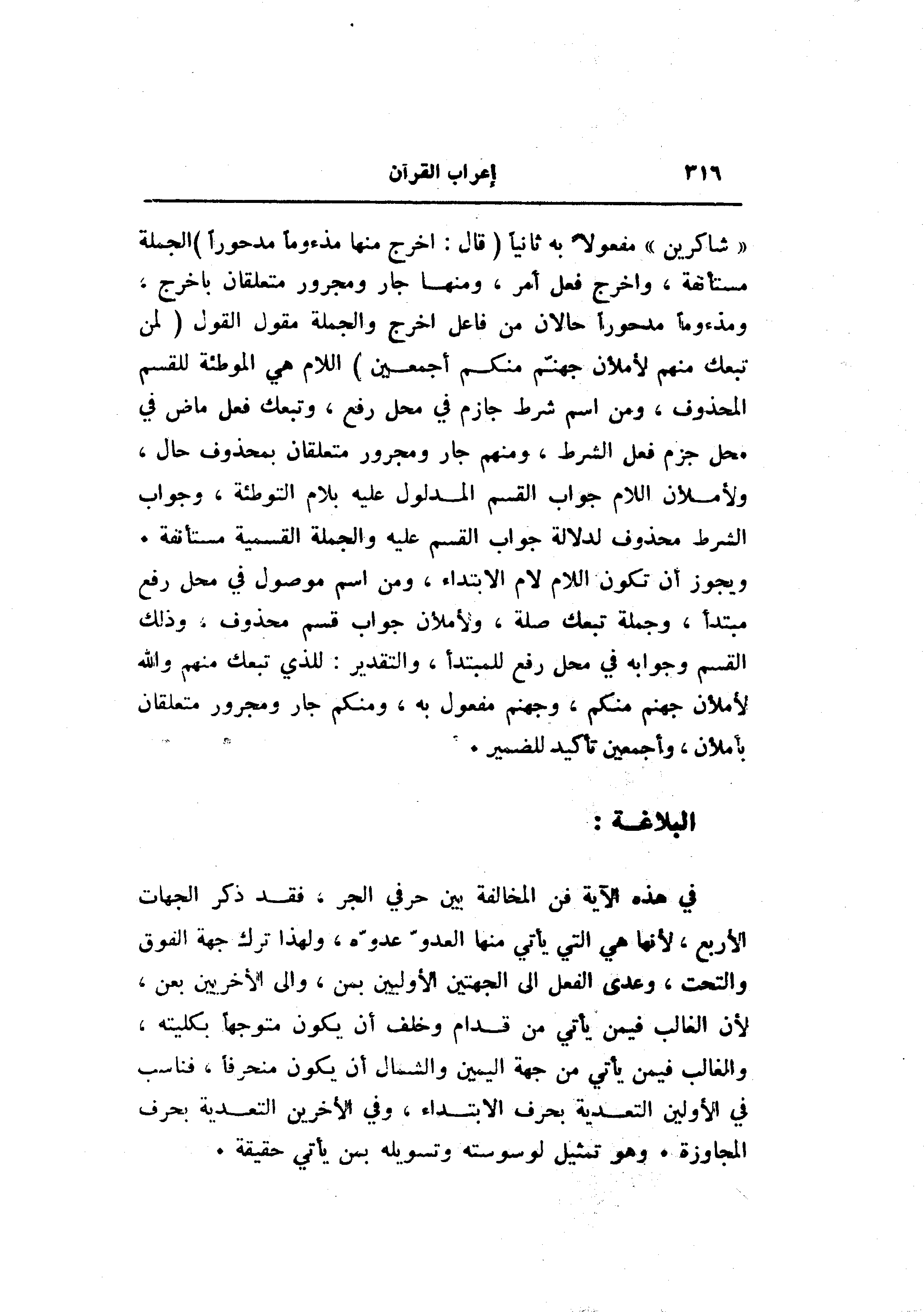 «شاكرين» مفعولا به ثانيا (قالَ: اخْرُجْ مِنْها مَذْؤُماً مَدْحُوراً) الجملة مستأنفة، وأخرج فعل أمر، ومنها جار ومجرور متعلقان باخرج، ومذءوما مدحورا حالان من فاعل اخرج والجملة مقول القول (لَمَنْ تَبِعَكَ مِنْهُمْ لَأَمْلَأَنَّ جَهَنَّمَ مِنْكُمْ أَجْمَعِينَ) اللام هي الموطئة للقسم المحذوف، ومن اسم شرط جازم في محل رفع، وتبعك فعل ماض في محل جزم فعل الشرط، ومنهم جار ومجرور متعلقان بمحذوف حال، ولأملأن اللام جواب القسم المدلول عليه بلام التوطئة، وجواب الشرط محذوف لدلالة جواب القسم عليه والجملة القسمية مستأنفة.