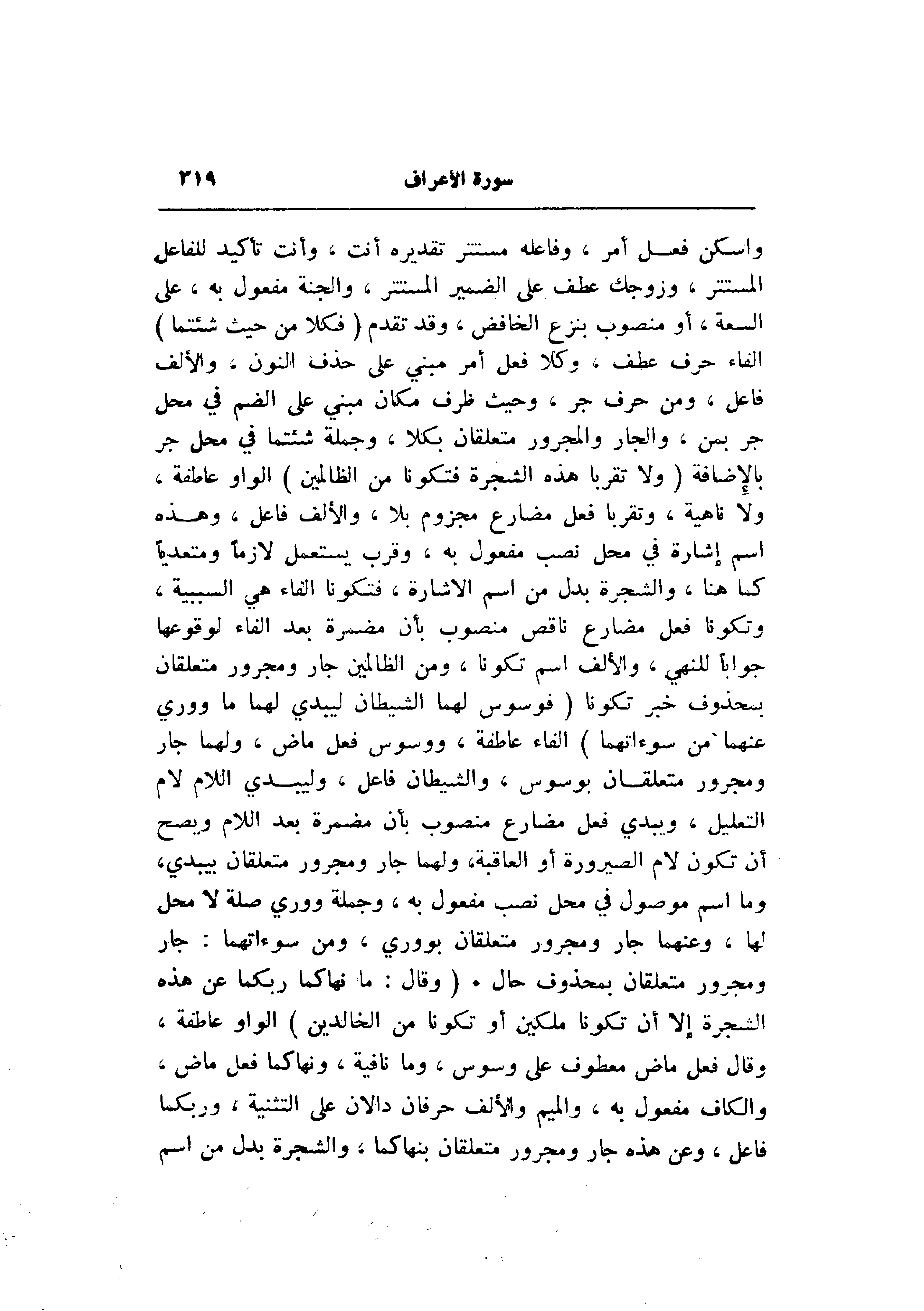 واسكن فعل أمر، وفاعله مستتر تقديره أنت، وأنت تأكيد للفاعل المستتر، وزوجك عطف على الضمير المستتر، والجنة مفعول به، على السعة، أو منصوب بنزع الخافض، وقد تقدم (فَكُلا مِنْ حَيْثُ شِئْتُما) الفاء حرف عطف، وكلا فعل أمر مبني على حذف النون، والألف فاعل، ومن حرف جر، وحيث ظرف مكان مبني على الضم في محل جر بمن، والجار والمجرور متعلقان بكلا، وجملة شئتما في محل جر بالإضافة (وَلا تَقْرَبا هذِهِ الشَّجَرَةَ فَتَكُونا مِنَ الظَّالِمِينَ) الواو عاطفة، ولا ناهية، وتقربا فعل مضارع مجزوم بلا، والألف فاعل، وهذه اسم إشارة في محل نصب مفعول به، وقرب يستعمل لازما ومتعديا كما هنا، والشجرة بدل من اسم الاشارة، فتكونا الفاء هي السببية، وتكونا فعل مضارع ناقص منصوب بأن مضمرة بعد الفاء لوقوعها جوابا للنهي، والألف اسم تكونا، ومن الظالمين جار ومجرور متعلقان بمحذوف خبر تكونا (فَوَسْوَسَ لَهُمَا الشَّيْطانُ لِيُبْدِيَ لَهُما ما وُورِيَ عَنْهُما مِنْ سَوْآتِهِما) الفاء عاطفة، ووسوس فعل ماض، ولهما جار ومجرور متعلقان بوسوس، والشيطان فاعل، وليبدي اللام لام التعليل، ويبدي فعل مضارع منصوب بأن مضمرة بعد اللام ويصح أن تكون لام الصيرورة أو العاقبة، ولهما جار ومجرور متعلقان بيبدي، وما اسم موصول في محل نصب مفعول به، وجملة ووري صلة لا محل لها، وعنهما جار ومجرور متعلقان بووري، ومن سوءاتهما: جار ومجرور متعلقان بمحذوف حال. (وَقالَ: ما نَهاكُما رَبُّكُما عَنْ هذِهِ الشَّجَرَةِ إِلَّا أَنْ تَكُونا مَلَكَيْنِ أَوْ تَكُونا مِنَ الْخالِدِينَ) الواو عاطفة، وقال فعل ماض معطوف على وسوس، وما نافية، ونهاكما فعل ماض، والكاف مفعول به، والميم والألف حرفان دالان على التثنية، وربكما فاعل، وعن هذه جار ومجرور متعلقان بنهاكما، والشجرة بدل من اسم