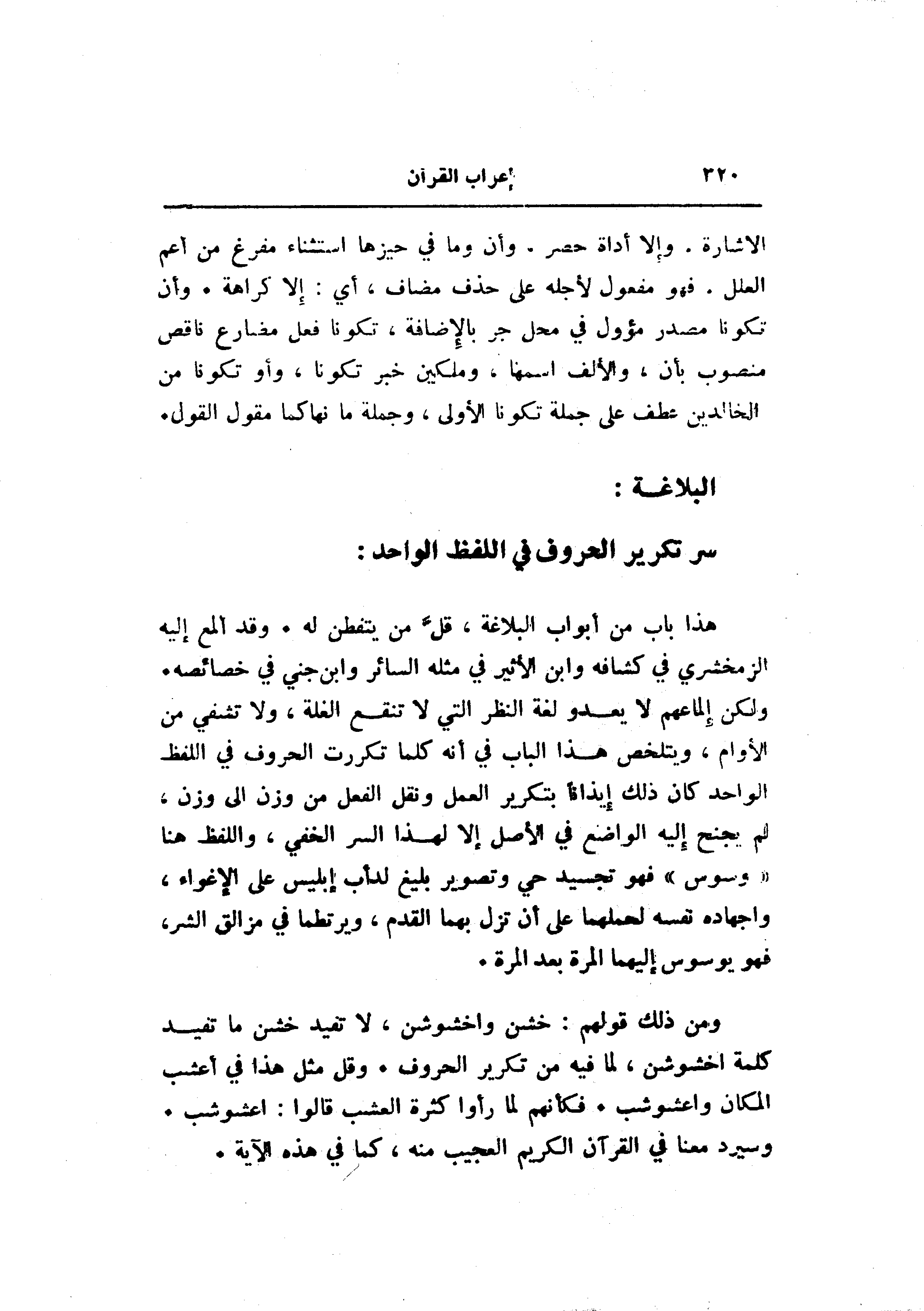 ومن ذلك قولهم: خشن واخشوشن، لا تفيد خشن ما تفيد كلمة اخشوشن، لما فيه من تكرير الحروف. وقل مثل هذا في أعشب المكان واعشوشب. فكأنهم لما رأوا كثرة العشب قالوا: اعشوشب.