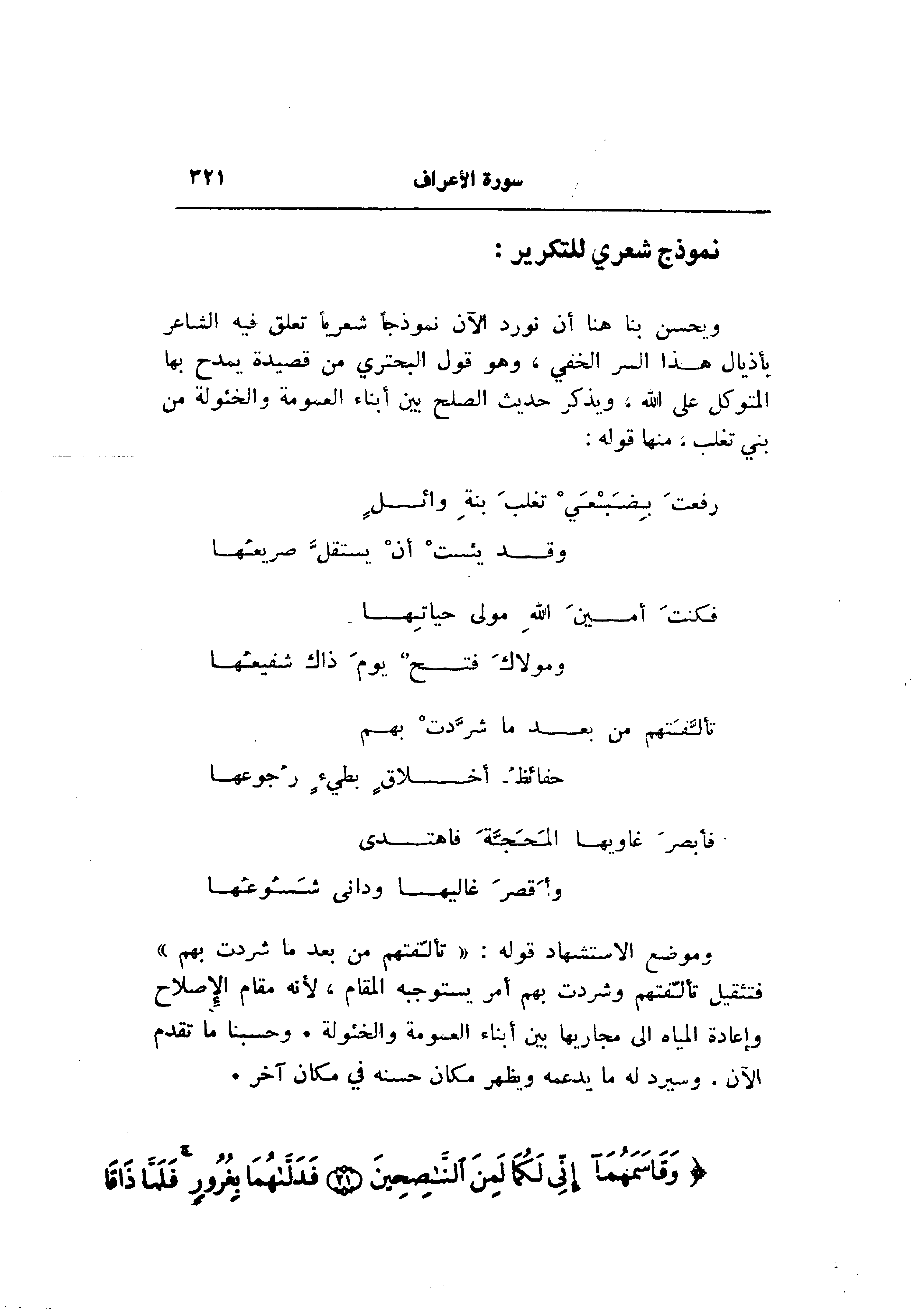 وموضع الاستشهاد قوله: «تألّفتهم من بعد ما شردت بهم» فتثقيل تألّفتهم وشردت بهم أمر يستوجبه المقام، لأنه مقام الإصلاح وإعادة المياه الى مجاريها بين أبناء العمومة والخئولة. وحسبنا ما تقدم الآن. وسيرد له ما يدعمه ويظهر مكان حسنه في مكان آخر.
