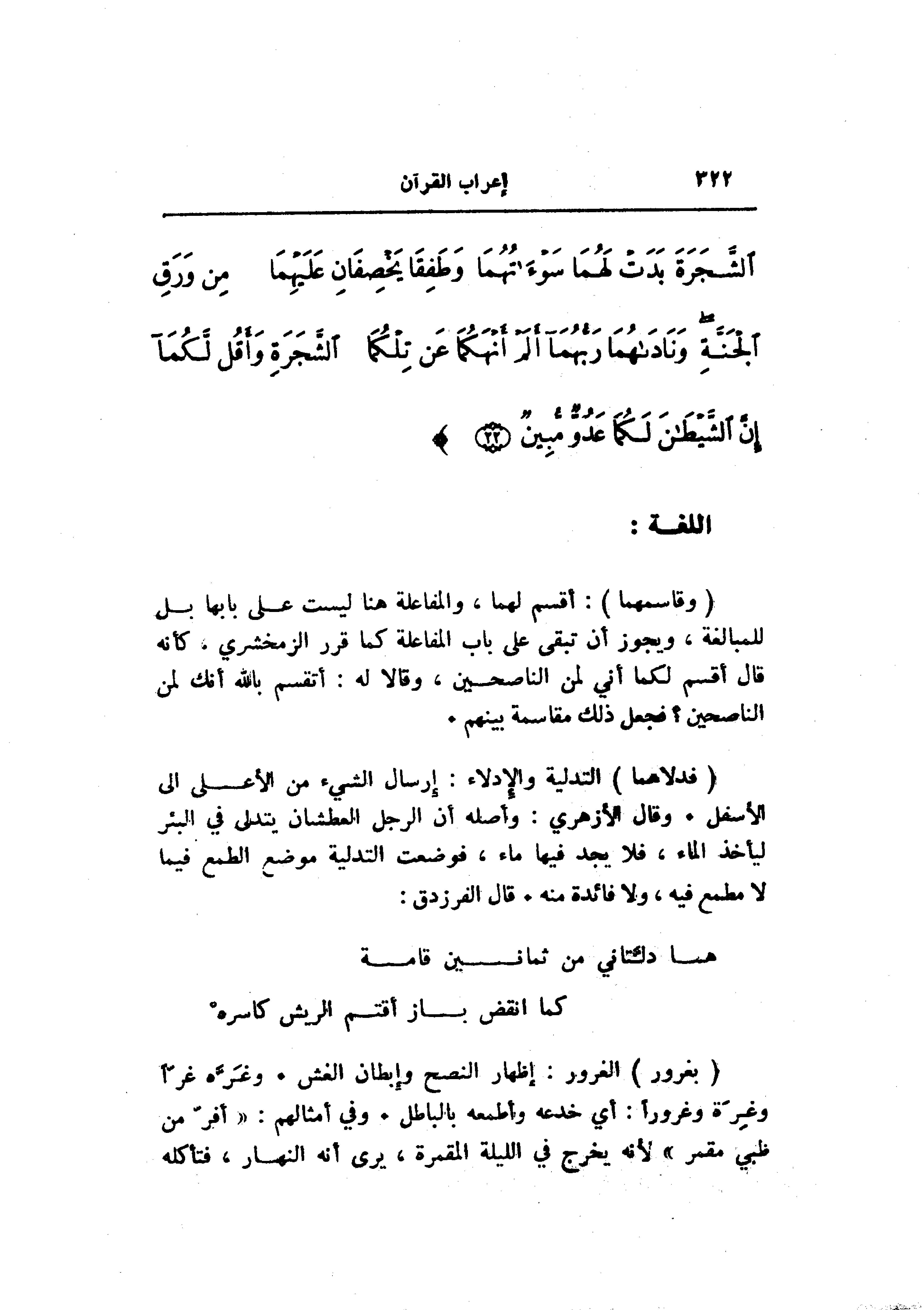 (وَقاسَمَهُما) : أقسم لهما، والمفاعلة هنا ليست على بابها بل للمبالغة، ويجوز أن تبقى على باب المفاعلة كما قرر الزمخشري، كأنه قال أقسم لكما أني لمن الناصحين، وقالا له: أتقسم بالله أنك لمن الناصحين؟ فجعل ذلك مقاسمة بينهم.