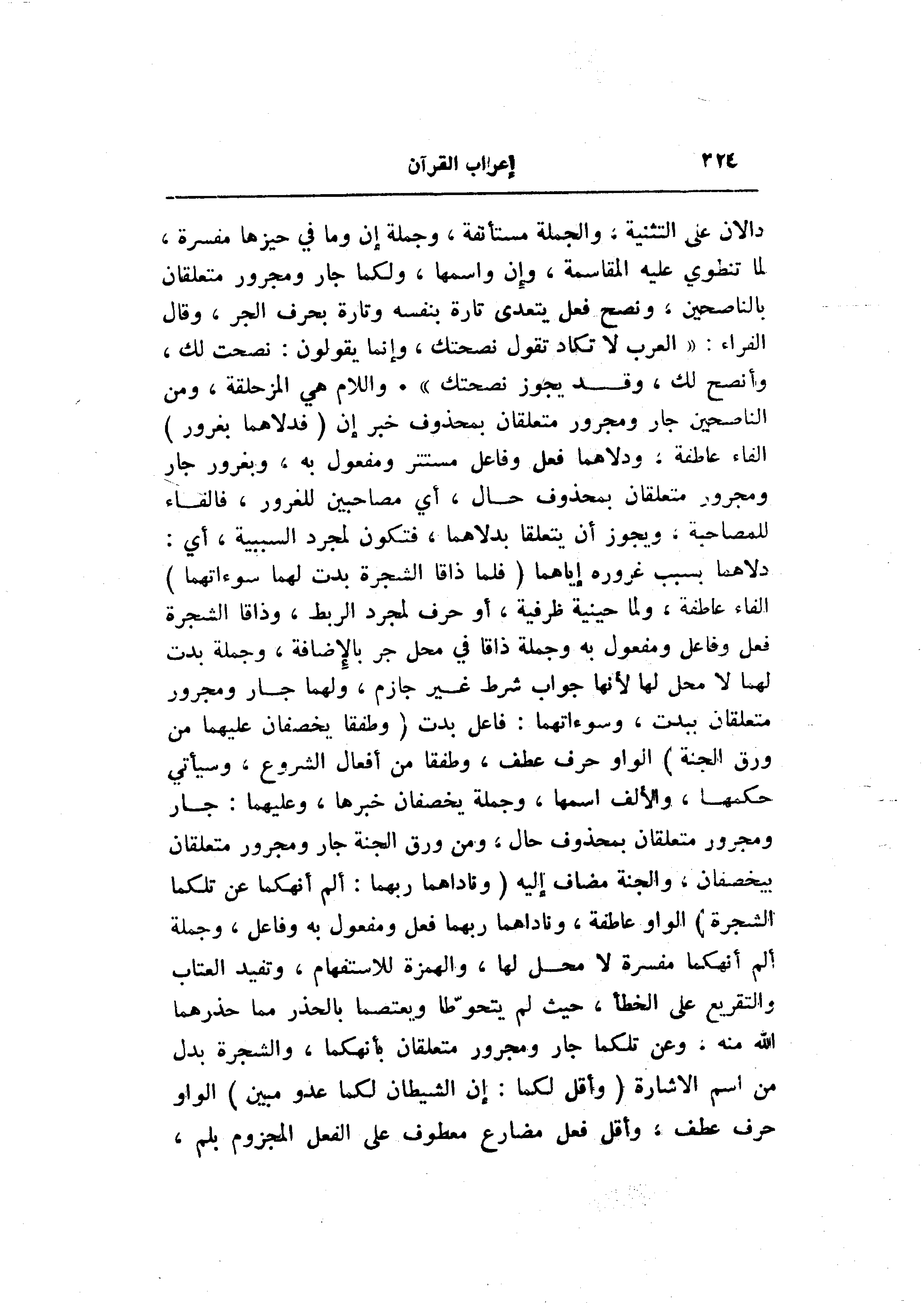 دلاهما بسبب غروره إياهما (فَلَمَّا ذاقَا الشَّجَرَةَ بَدَتْ لَهُما سَوْآتُهُما) الفاء عاطفة، ولما حينية ظرفية، أو حرف لمجرد الربط، وذاقا الشجرة فعل وفاعل ومفعول به وجملة ذاقا في محل جر بالإضافة، وجملة بدت لهما لا محل لها لأنها جواب شرط غير جازم، ولهما جار ومجرور متعلقان ببدت، وسوءاتهما: فاعل بدت (وَطَفِقا يَخْصِفانِ عَلَيْهِما مِنْ وَرَقِ الْجَنَّةِ) الواو حرف عطف، وطفقا من أفعال الشروع، وسيأتي حكمها، والألف اسمها، وجملة يخصفان خبرها، وعليهما: جار ومجرور متعلقان بمحذوف حال، ومن ورق الجنة جار ومجرور متعلقان بيخصفان، والجنة مضاف إليه (وَناداهُما رَبُّهُما: أَلَمْ أَنْهَكُما عَنْ تِلْكُمَا الشَّجَرَةِ) الواو عاطفة، وناداهما ربهما فعل ومفعول به وفاعل، وجملة ألم أنهكما مفسرة لا محل لها، والهمزة للاستفهام، وتفيد العتاب والتقريع على الخطأ، حيث لم يتحوّطا ويعتصما بالحذر مما حذرهما الله منه، وعن تلكما جار ومجرور متعلقان بأنهكما، والشجرة بدل من اسم الاشارة (وَأَقُلْ لَكُما: إِنَّ الشَّيْطانَ لَكُما عَدُوٌّ مُبِينٌ) الواو حرف عطف، وأقل فعل مضارع معطوف على الفعل المجزوم بلم،