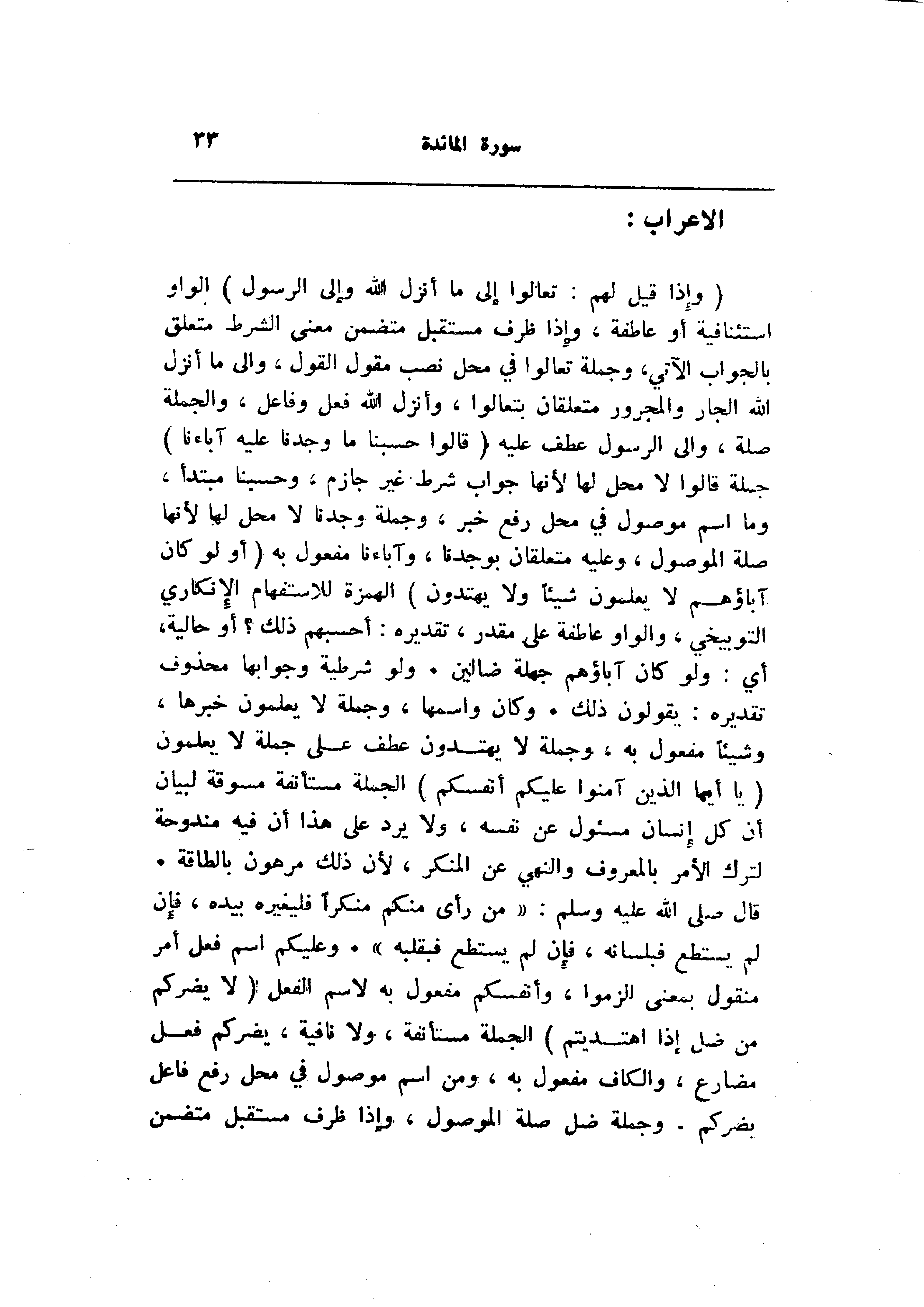 (وَإِذا قِيلَ لَهُمْ: تَعالَوْا إِلى ما أَنْزَلَ اللَّهُ وَإِلَى الرَّسُولِ) الواو استئنافية أو عاطفة، وإذا ظرف مستقبل متضمن معنى الشرط متعلق بالجواب الآتي، وجملة تعالوا في محل نصب مقول القول، والى ما أنزل الله الجار والمجرور متعلقان بتعالوا، وأنزل الله فعل وفاعل، والجملة صلة، والى الرسول عطف عليه (قالُوا حَسْبُنا ما وَجَدْنا عَلَيْهِ آباءَنا) جملة قالوا لا محل لها لأنها جواب شرط غير جازم، وحسبنا مبتدأ، وما اسم موصول في محل رفع خبر، وجملة وجدنا لا محل لها لأنها صلة الموصول، وعليه متعلقان بوجدنا، وآباءنا مفعول به (أَوَلَوْ كانَ آباؤُهُمْ لا يَعْلَمُونَ شَيْئاً وَلا يَهْتَدُونَ) الهمزة للاستفهام الإنكاري التوبيخي، والواو عاطفة على مقدر، تقديره: أحسبهم ذلك؟ أو حالية، أي: ولو كان آباؤهم جهلة ضالين. ولو شرطية وجوابها محذوف تقديره: يقولون ذلك. وكان واسمها، وجملة لا يعلمون خبرها، وشيئا مفعول به، وجملة لا يهتدون عطف على جملة لا يعلمون (يا أَيُّهَا الَّذِينَ آمَنُوا عَلَيْكُمْ أَنْفُسَكُمْ) الجملة مستأنفة مسوقة لبيان أن كل إنسان مسئول عن نفسه، ولا يرد على هذا أن فيه مندوحة لترك الأمر بالمعروف والنهي عن المنكر، لأن ذلك مرهون بالطاقة.