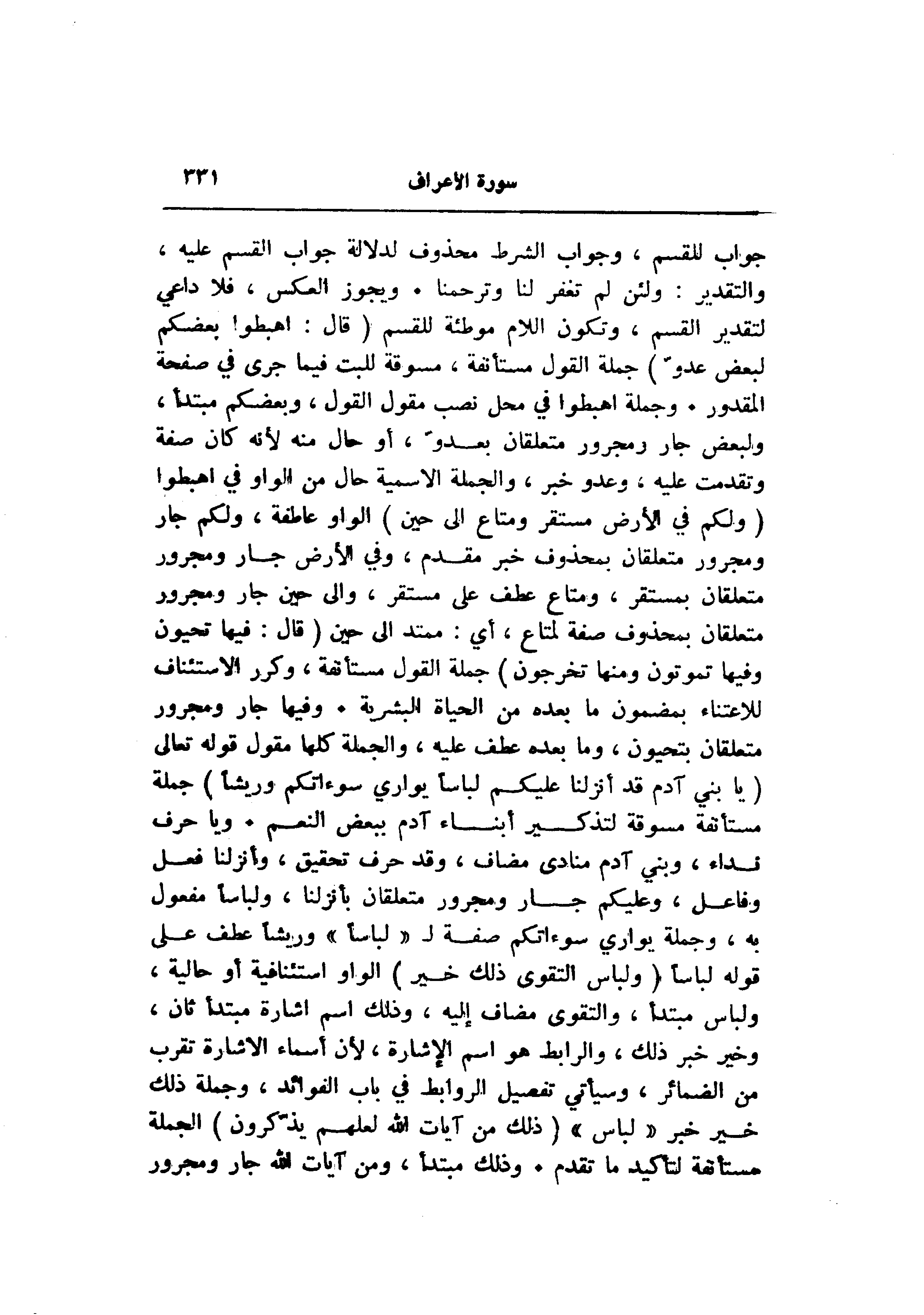 جواب للقسم، وجواب الشرط محذوف لدلالة جواب القسم عليه، والتقدير: ولئن لم تغفر لنا وترحمنا. ويجوز العكس، فلا داعي لتقدير القسم، وتكون اللام موطئة للقسم (قالَ: اهْبِطُوا بَعْضُكُمْ لِبَعْضٍ عَدُوٌّ) جملة القول مستأنفة، مسوقة للبت فيما جرى في صفحة المقدور. وجملة اهبطوا في محل نصب مقول القول، وبعضكم مبتدأ، ولبعض جار ومجرور متعلقان بعدوّ، أو حال منه لأنه كان صفة وتقدمت عليه، وعدو خبر، والجملة الاسمية حال من الواو في اهبطوا (وَلَكُمْ فِي الْأَرْضِ مُسْتَقَرٌّ وَمَتاعٌ إِلى حِينٍ) الواو عاطفة، ولكم جار ومجرور متعلقان بمحذوف خبر مقدم، وفي الأرض جار ومجرور متعلقان بمستقر، ومتاع عطف على مستقر، والى حين جار ومجرور متعلقان بمحذوف صفة لمتاع، أي: ممتد الى حين (قالَ: فِيها تَحْيَوْنَ وَفِيها تَمُوتُونَ وَمِنْها تُخْرَجُونَ) جملة القول مستأنفة، وكرر الاستئناف للاعتناء بمضمون ما بعده من الحياة البشرية. وفيها جار ومجرور متعلقان بتحيون، وما بعده عطف عليه، والجملة كلها مقول قوله تعالى (يا بَنِي آدَمَ قَدْ أَنْزَلْنا عَلَيْكُمْ لِباساً يُوارِي سَوْآتِكُمْ وَرِيشاً) جملة مستأنفة مسوقة لتذكير أبناء آدم ببعض النعم. ويا حرف نداء، وبني آدم منادى مضاف، وقد حرف تحقيق، وأنزلنا فعل وفاعل، وعليكم جار ومجرور متعلقان بأنزلنا، ولباسا مفعول به، وجملة يواري سوءاتكم صفة ل «لباسا» وريشا عطف على قوله لباسا (وَلِباسُ التَّقْوى ذلِكَ خَيْرٌ) الواو استئنافية أو حالية، ولباس مبتدأ، والتقوى مضاف إليه، وذلك اسم اشارة مبتدأ ثان، وخير خبر ذلك، والرابط هو اسم الإشارة، لأن أسماء الاشارة تقرب من الضمائر، وسيأتي تفصيل الروابط في باب الفوائد، وجملة ذلك خير خبر «لباس» ، (ذلِكَ مِنْ آياتِ اللَّهِ لَعَلَّهُمْ يَذَّكَّرُونَ) الجملة مستأنفة لتأكيد ما تقدم. وذلك مبتدأ، ومن آيات الله جار ومجرور