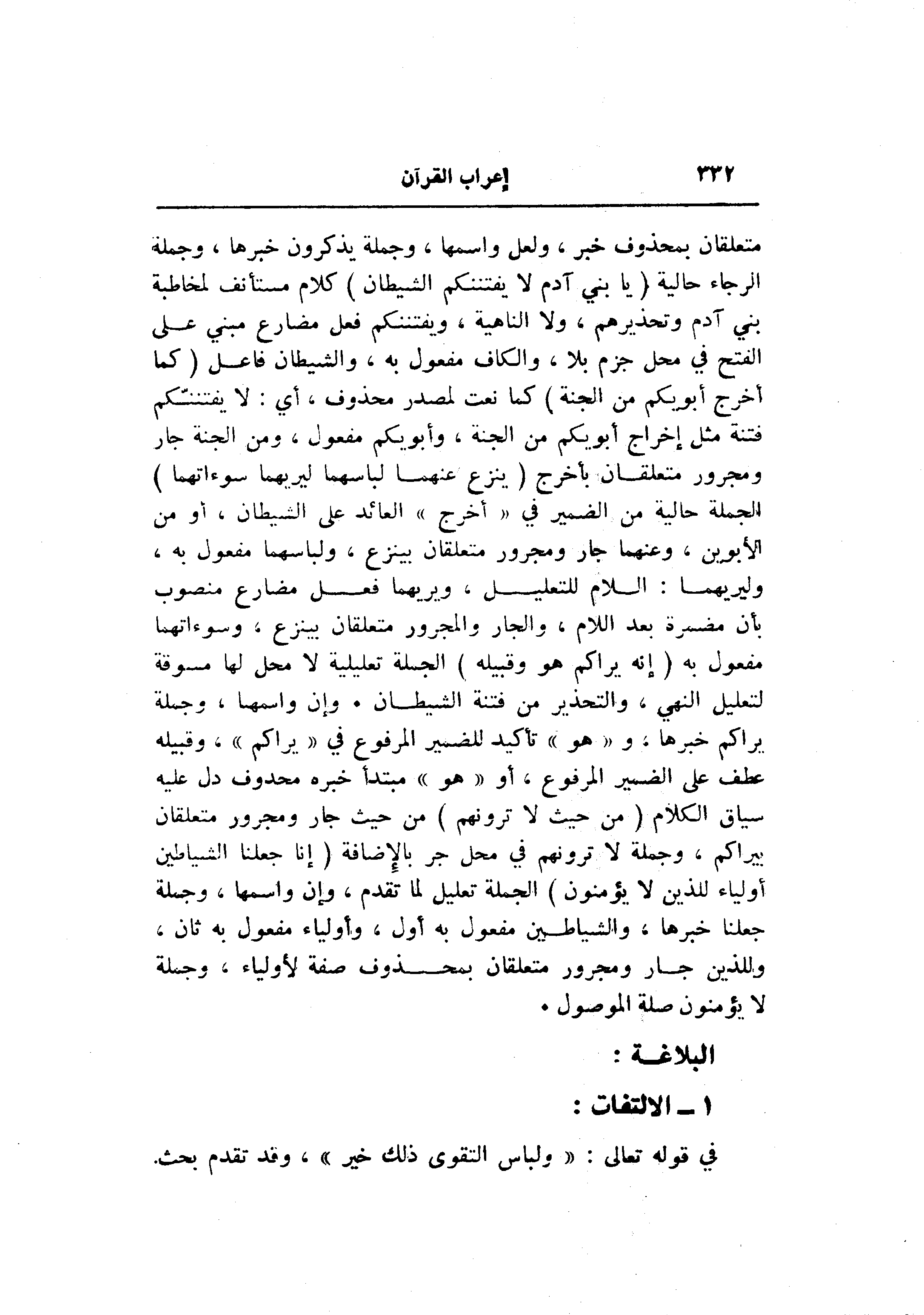 متعلقان بمحذوف خبر، ولعل واسمها، وجملة يذكرون خبرها، وجملة الرجاء حالية (يا بَنِي آدَمَ لا يَفْتِنَنَّكُمُ الشَّيْطانُ) كلام مستأنف لمخاطبة بني آدم وتحذيرهم، ولا الناهية، ويفتننكم فعل مضارع مبني على الفتح في محل جزم بلا، والكاف مفعول به، والشيطان فاعل (كَما أَخْرَجَ أَبَوَيْكُمْ مِنَ الْجَنَّةِ) كما نعت لمصدر محذوف، أي: لا يفتننّكم فتنة مثل إخراج أبويكم من الجنة، وأبويكم مفعول، ومن الجنة جار ومجرور متعلقان بأخرج (يَنْزِعُ عَنْهُما لِباسَهُما لِيُرِيَهُما سَوْآتِهِما) الجملة حالية من الضمير في «أخرج» العائد على الشيطان، أو من الأبوين، وعنهما جار ومجرور متعلقان بينزع، ولباسهما مفعول به، وليريهما: اللام للتعليل، ويريهما فعل مضارع منصوب بأن مضمرة بعد اللام، والجار والمجرور متعلقان بينزع، وسوءاتهما مفعول به (إِنَّهُ يَراكُمْ هُوَ وَقَبِيلُهُ) الجملة تعليلية لا محل لها مسوقة لتعليل النهي، والتحذير من فتنة الشيطان. وإن واسمها، وجملة يراكم خبرها، و «هو» تأكيد للضمير المرفوع، في «يراكم» ، وقبيله عطف على الضمير المرفوع، أو «هو» مبتدأ خبره محذوف دل عليه سياق الكلام (مِنْ حَيْثُ لا تَرَوْنَهُمْ) من حيث جار ومجرور متعلقان بيراكم، وجملة لا ترونهم في محل جر بالإضافة (إِنَّا جَعَلْنَا الشَّياطِينَ أَوْلِياءَ لِلَّذِينَ لا يُؤْمِنُونَ) الجملة تعليل لما تقدم، وإن واسمها، وجملة جعلنا خبرها، والشياطين مفعول به أول، وأولياء مفعول به ثان، وللذين جار ومجرور متعلقان بمحذوف صفة لأولياء، وجملة لا يؤمنون صلة الموصول.