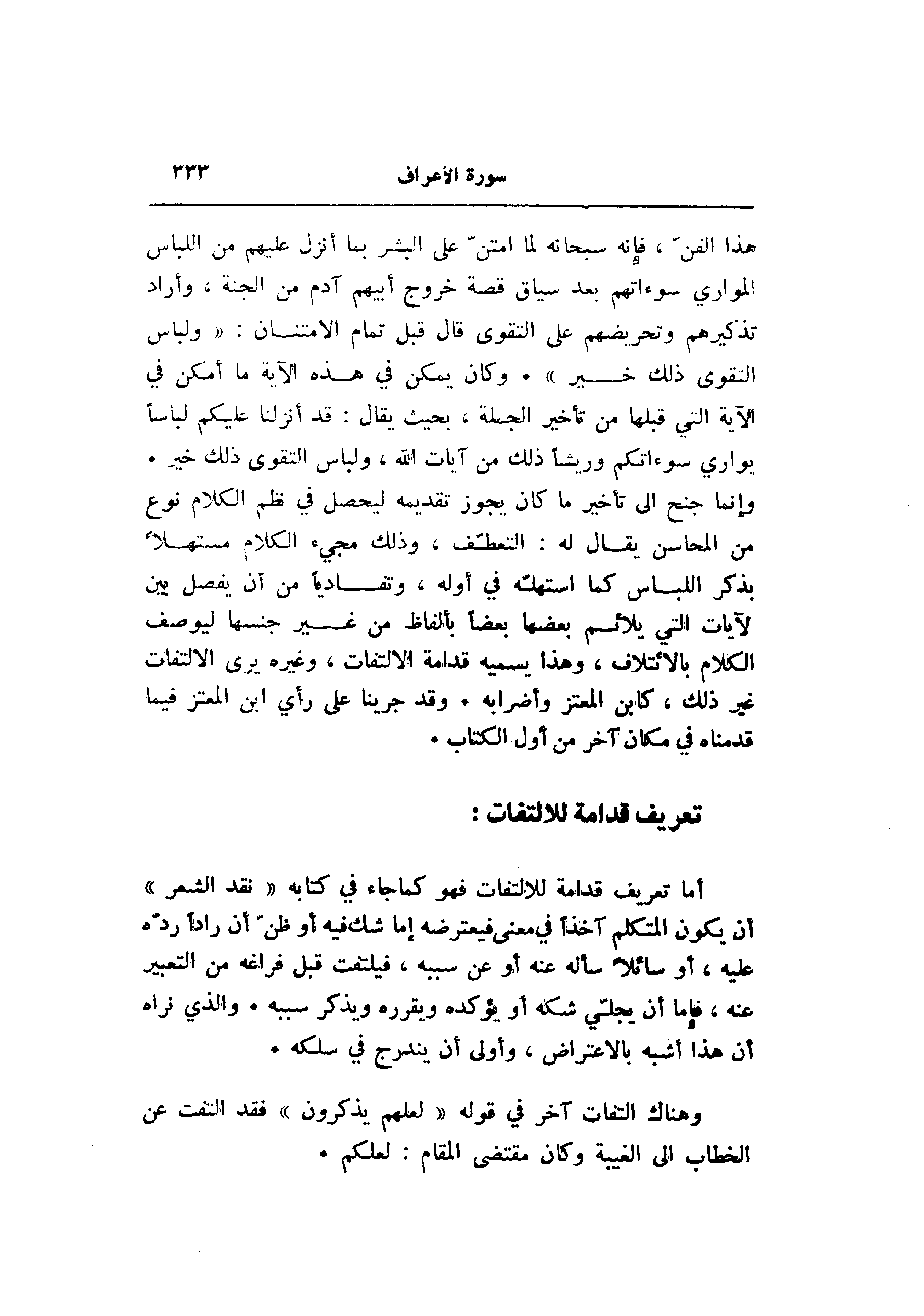 وإنما جنح الى تأخير ما كان يجوز تقديمه ليحصل في نظم الكلام نوع من المحاسن يقال له: التعطّف، وذلك مجيء الكلام مستهلا بذكر اللباس كما استهلّه في أوله، وتفاديا من أن يفصل بين لآيات التي يلائم بعضها بعضا بألفاظ من غير جنسها ليوصف الكلام بالائتلاف، وهذا يسميه قدامة الالتفات، وغيره يرى الالتفات غير ذلك، كابن المعتز وأضرابه. وقد جرينا على رأي ابن المعتز فيما قدمناه في مكان آخر من أول الكتاب.