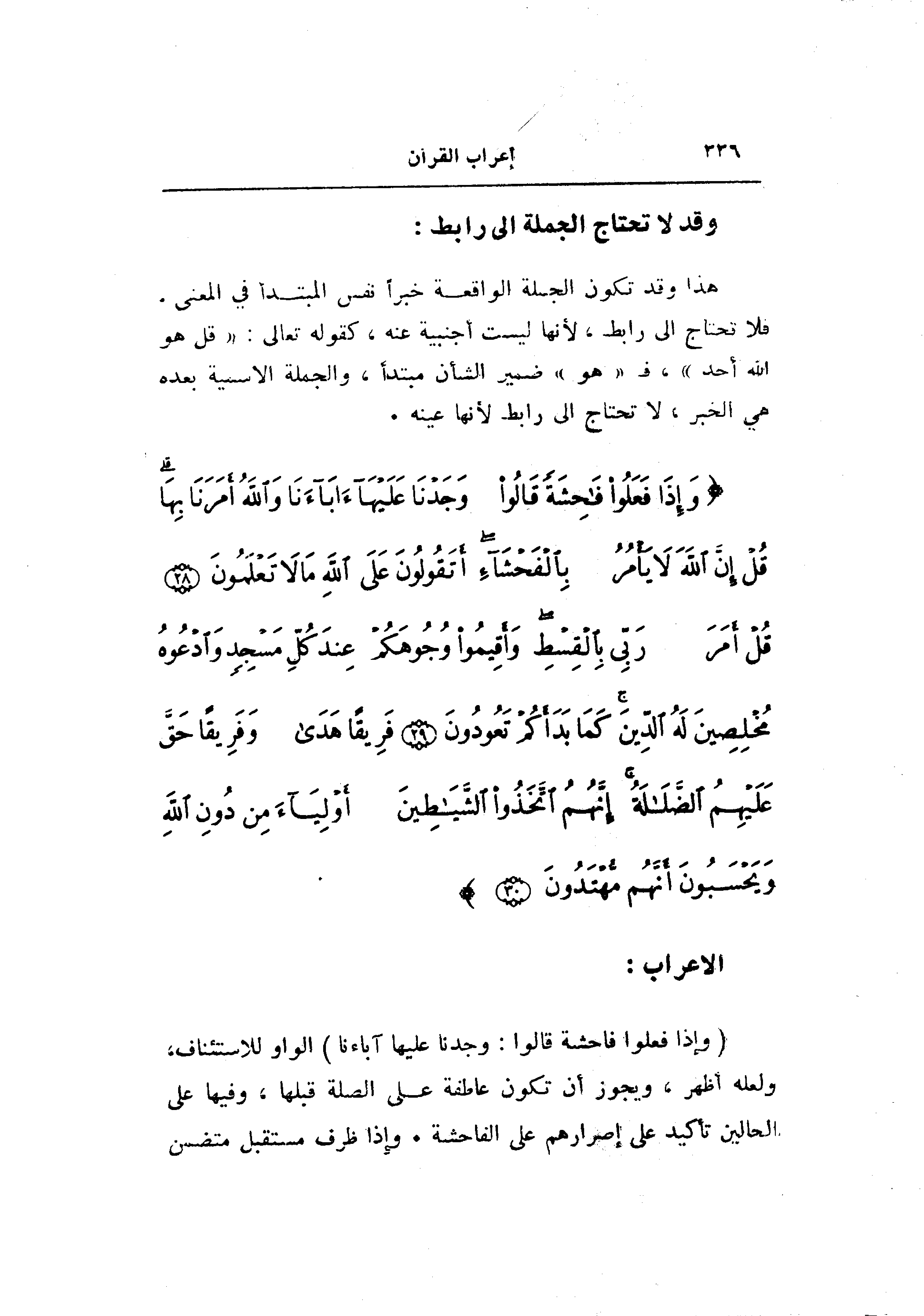 (وَإِذا فَعَلُوا فاحِشَةً قالُوا: وَجَدْنا عَلَيْها آباءَنا) الواو للاستئناف، ولعله أظهر، ويجوز أن تكون عاطفة على الصلة قبلها، وفيها على الحالين تأكيد على إصرارهم على الفاحشة، وإذا ظرف مستقبل متضمن