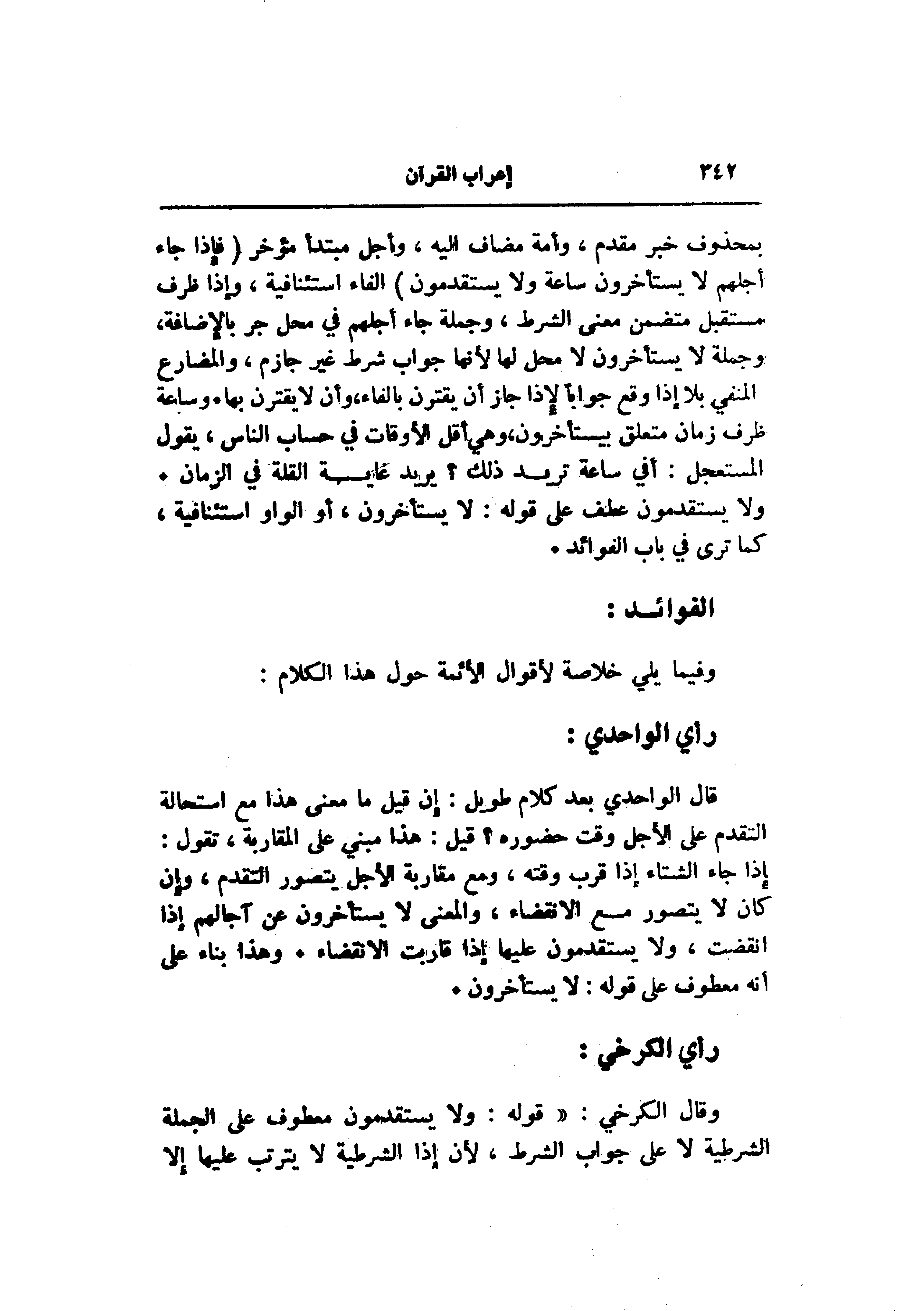 وقال الكرخي: «قوله: ولا يستقدمون معطوف على الجملة الشرطية لا على جواب الشرط، لأن إذا الشرطية لا يترتب عليها إلا