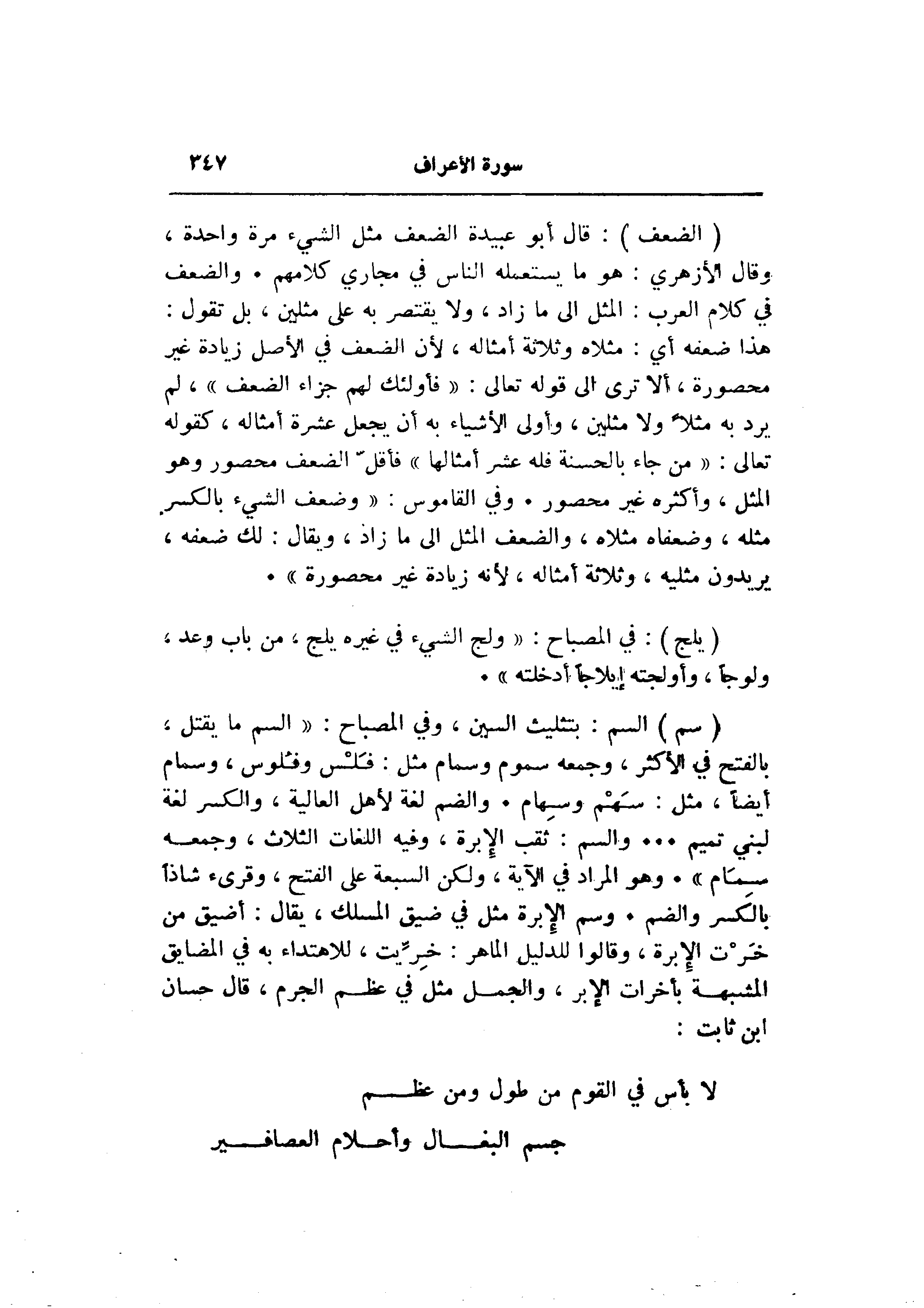 (سَمِّ) السم: بتثليث السين، وفي المصباح: «السم ما يقتل، بالفتح في الأكثر، وجمعه سموم وسمام مثل: فليس وفلوس، وسمام أيضا، مثل: سهم وسهام. والضم لغة لأهل العالية، والكسر لغة لبني تميم ... والسم: ثقب الإبرة، وفيه اللغات الثلاث، وجمعه سمام» . وهو المراد في الآية، ولكن السبعة على الفتح، وقرئ شاذا بالكسر والضم. وسم الإبرة مثل في ضيق المسلك، يقال: أضيق من خرت الإبرة، وقالوا للدليل الماهر: خرّيت، للاهتداء به في المضايق المشبهة بأخرات الإبر، والجمل مثل في عظم الجرم، قال حسان ابن ثابت: