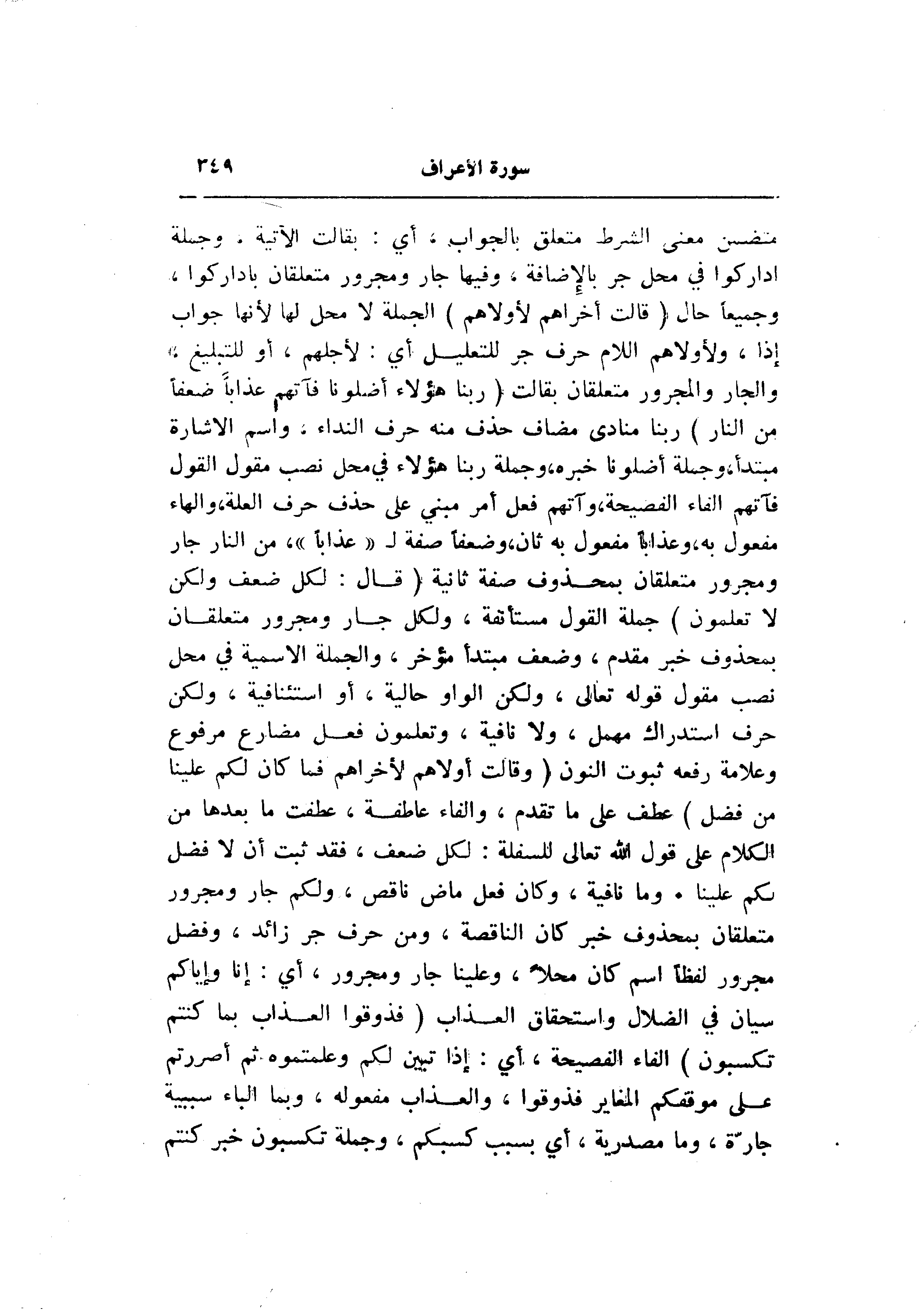 متضمن معنى الشرط متعلق بالجواب، أي: بقالت الآتية، وجملة اداركوا في محل جر بالإضافة، وفيها جار ومجرور متعلقان باداركوا، وجميعا حال (قالَتْ أُخْراهُمْ لِأُولاهُمْ) الجملة لا محل لها لأنها جواب إذا، ولأولاهم اللام حرف جر للتعليل أي: لأجلهم، أو للتبليغ، والجار والمجرور متعلقان بقالت (رَبَّنا هؤُلاءِ أَضَلُّونا فَآتِهِمْ عَذاباً ضِعْفاً مِنَ النَّارِ) ربنا منادى مضاف حذف منه حرف النداء، واسم الاشارة مبتدأ، وجملة أضلونا خبره، وجملة ربنا هؤلاء في محل نصب مقول القول فآتهم الفاء الفصيحة، وآتهم فعل أمر مبني على حذف حرف العلة، والهاء مفعول به، وعذابا مفعول به ثان، وضعفا صفة ل «عذابا» ، من النار جار ومجرور متعلقان بمحذوف صفة ثانية (قالَ: لِكُلٍّ ضِعْفٌ وَلكِنْ لا تَعْلَمُونَ)