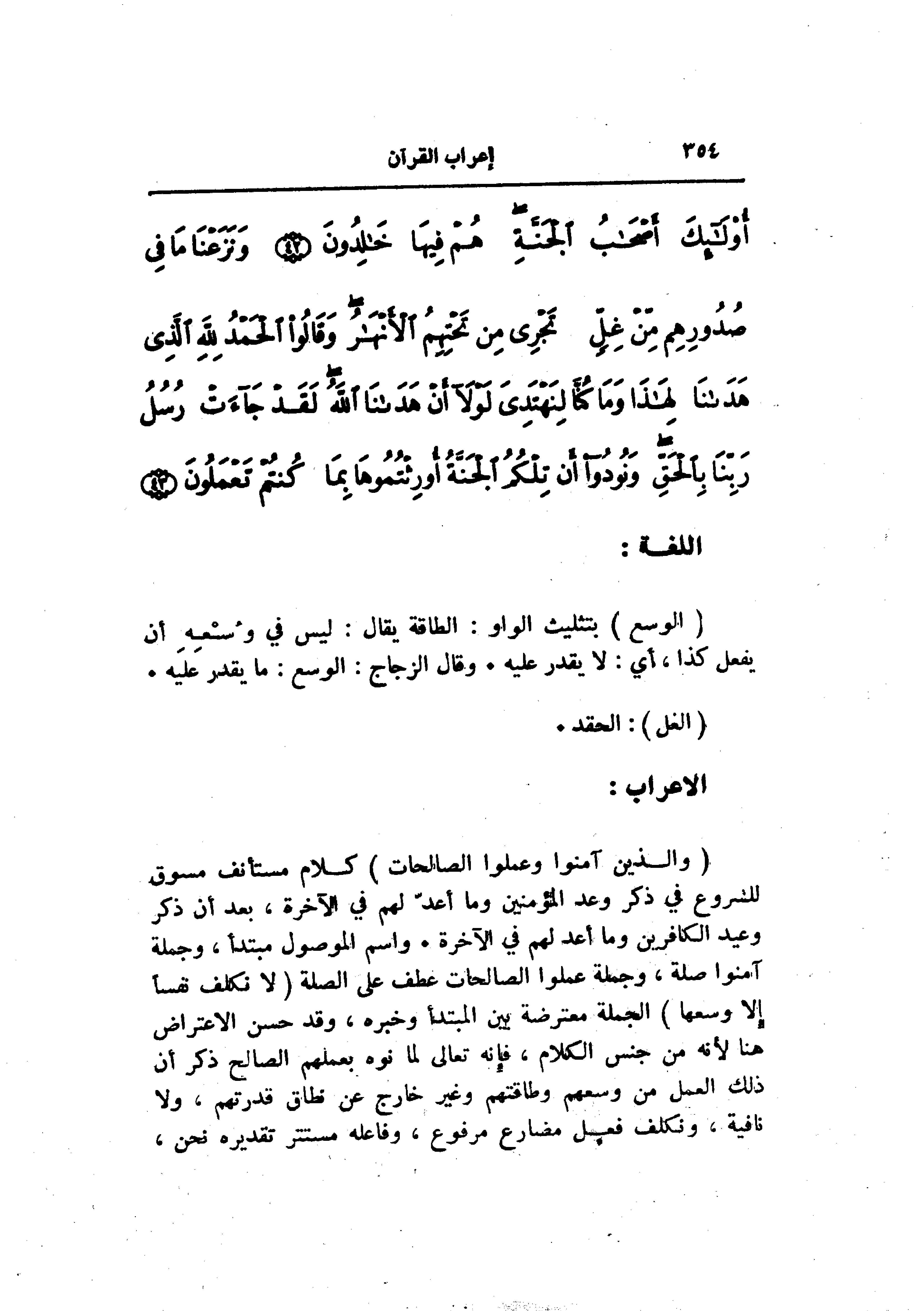 (وَالَّذِينَ آمَنُوا وَعَمِلُوا الصَّالِحاتِ) كلام مستأنف مسوق للشروع في ذكر وعد المؤمنين وما أعدّ لهم في الآخرة، بعد أن ذكر وعيد الكافرين وما أعد لهم في الآخرة. واسم الموصول مبتدأ، وجملة آمنوا صلة، وجملة عملوا الصالحات عطف على الصلة (لا نُكَلِّفُ نَفْساً إِلَّا وُسْعَها) الجملة معترضة بين المبتدأ وخبره، وقد حسن الاعتراض هنا لأنه من جنس الكلام، فإنه تعالى لما نوه بعملهم الصالح ذكر أن ذلك العمل من وسعهم وطاقتهم وغير خارج عن نطاق قدرتهم، ولا نافية، ونكلف فعل مضارع مرفوع، وفاعله مستتر تقديره نحن،