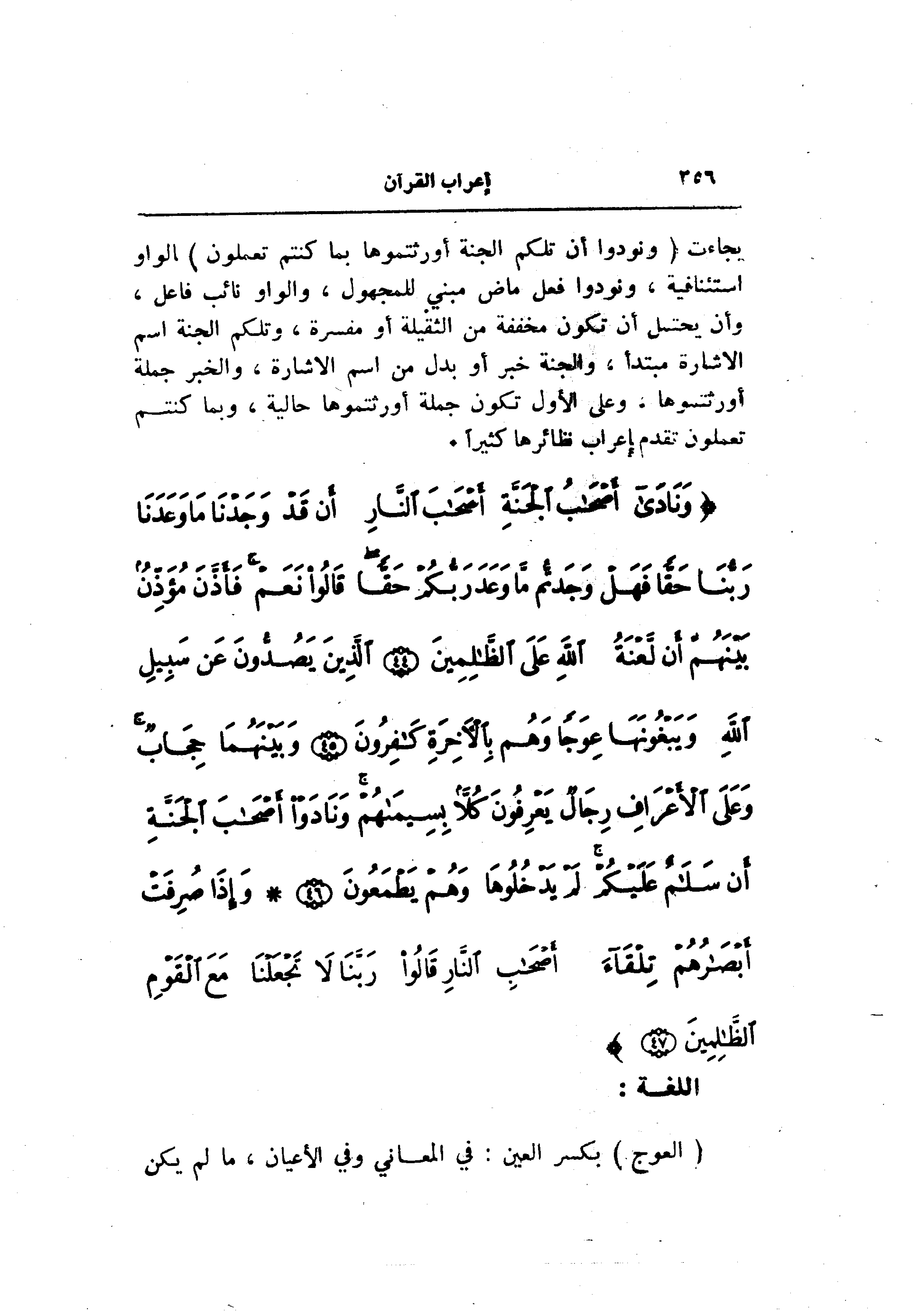 بجاءت (وَنُودُوا أَنْ تِلْكُمُ الْجَنَّةُ أُورِثْتُمُوها بِما كُنْتُمْ تَعْمَلُونَ) الواو استئنافية، ونودوا فعل ماض مبني للمجهول، والواو نائب فاعل، وأن يحتمل أن تكون مخففة من الثقيلة أو مفسرة، وتلكم الجنة اسم الاشارة مبتدأ، والجنة خبر أو بدل من اسم الاشارة، والخبر جملة أورثتموها. وعلى الأول تكون جملة أورثتموها حالية، وبما كنتم تعملون تقدم إعراب نظائرها كثيرا.