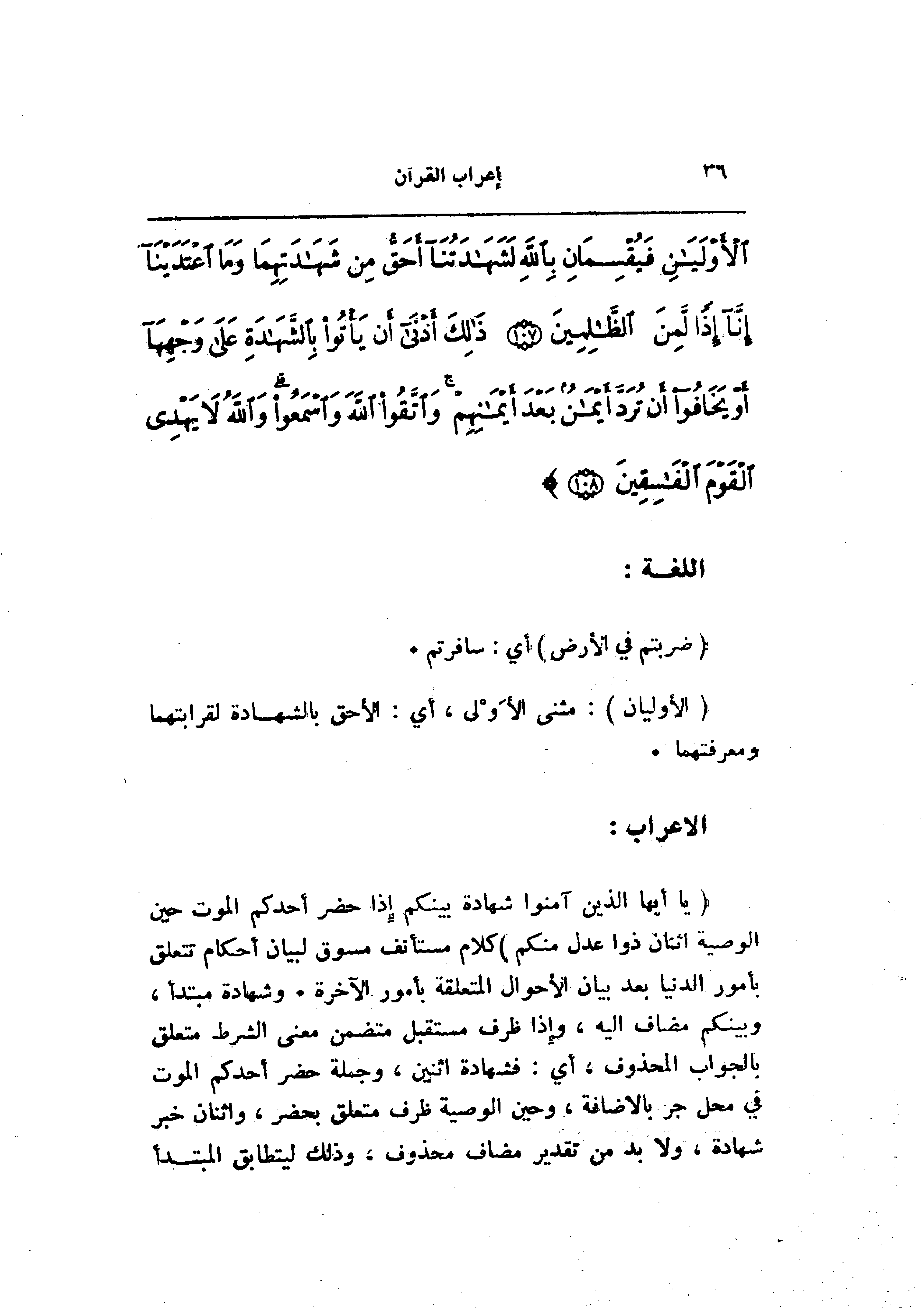 (يا أَيُّهَا الَّذِينَ آمَنُوا شَهادَةُ بَيْنِكُمْ إِذا حَضَرَ أَحَدَكُمُ الْمَوْتُ حِينَ الْوَصِيَّةِ اثْنانِ ذَوا عَدْلٍ مِنْكُمْ) كلام مستأنف مسوق لبيان أحكام تتعلق بأمور الدنيا بعد بيان الأحوال المتعلقة بأمور الآخرة. وشهادة مبتدأ، وبينكم مضاف اليه، وإذا ظرف مستقبل متضمن معنى الشرط متعلق بالجواب المحذوف، أي: فشهادة اثنين، وجملة حضر أحدكم الموت في محل جر بالاضافة، وحين الوصية ظرف متعلق بحضر، واثنان خبر شهادة، ولا بد من تقدير مضاف محذوف، وذلك ليتطابق المبتدأ