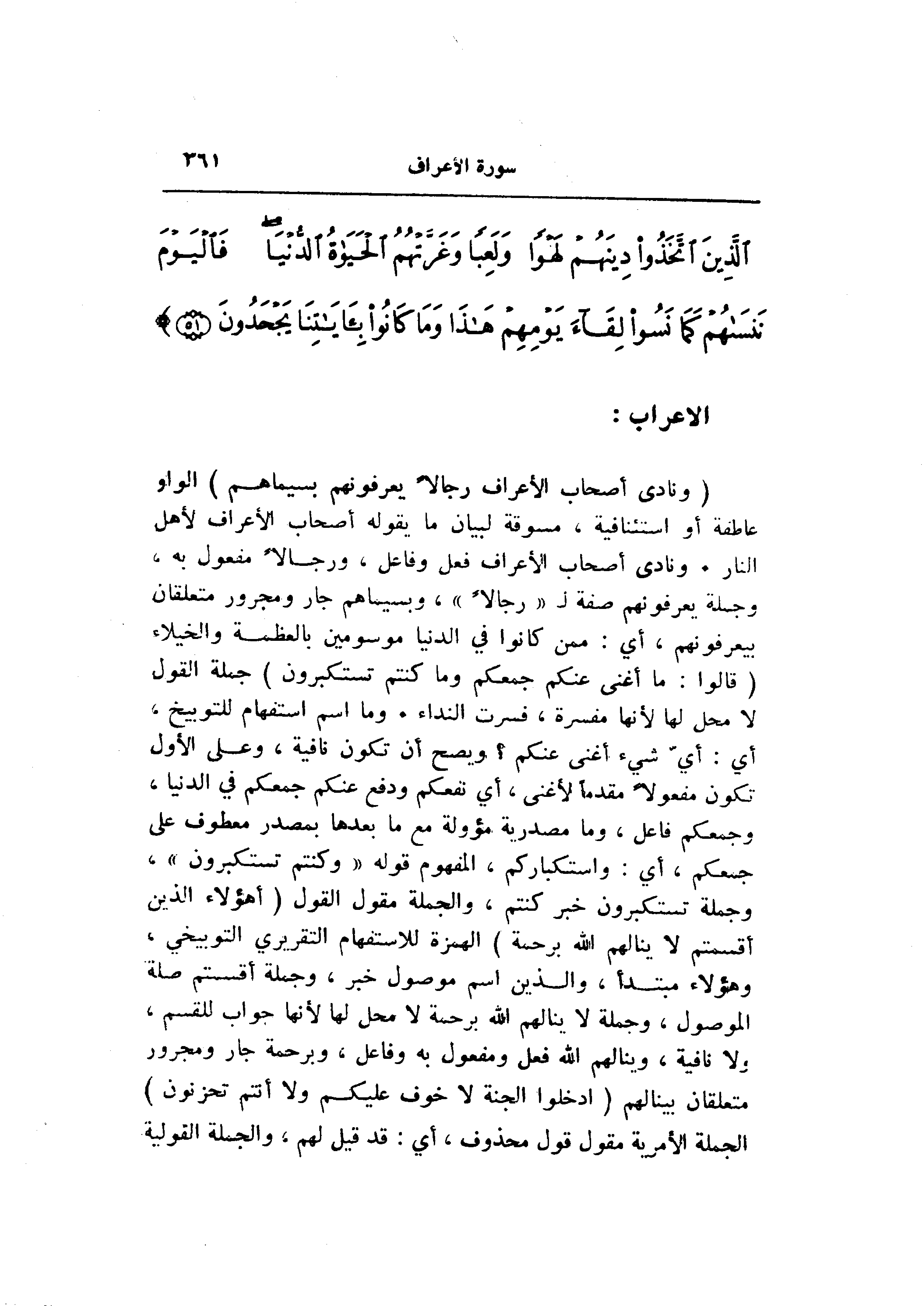(وَنادى أَصْحابُ الْأَعْرافِ رِجالًا يَعْرِفُونَهُمْ بِسِيماهُمْ) الواو عاطفة أو استئنافية، مسوقة لبيان ما يقوله أصحاب الأعراف لأهل النار. ونادى أصحاب الأعراف فعل وفاعل، ورجالا مفعول به، وجملة يعرفونهم صفة ل «رجالا» ، وبسيماهم جار ومجرور متعلقان بيعرفونهم، أي: ممن كانوا في الدنيا موسومين بالعظمة والخيلاء (قالُوا: ما أَغْنى عَنْكُمْ جَمْعُكُمْ وَما كُنْتُمْ تَسْتَكْبِرُونَ) جملة القول لا محل لها لأنها مفسرة، فسرت النداء. وما اسم استفهام للتوبيخ، أي: أيّ شيء أغنى عنكم؟ ويصح أن تكون نافية، وعلى الأول تكون مفعولا مقدما لأغنى، أي نفعكم ودفع عنكم جمعكم في الدنيا، وجمعكم فاعل، وما مصدرية مؤولة مع ما بعدها بمصدر معطوف على جمعكم، أي: واستكباركم، المفهوم قوله «وكنتم تستكبرون» ، وجملة تستكبرون خبر كنتم، والجملة مقول القول (أَهؤُلاءِ الَّذِينَ أَقْسَمْتُمْ لا يَنالُهُمُ اللَّهُ بِرَحْمَةٍ) الهمزة للاستفهام التقريري التوبيخي، وهؤلاء مبتدأ، والذين اسم موصول خبر، وجملة أقستم صلة الموصول، وجملة لا ينالهم الله برحمة لا محل لها لأنها جواب للقسم، ولا نافية، وينالهم الله فعل ومفعول به وفاعل، وبرحمة جار ومجرور متعلقان بينالهم (ادْخُلُوا الْجَنَّةَ لا خَوْفٌ عَلَيْكُمْ وَلا أَنْتُمْ تَحْزَنُونَ) الجملة الأمرية مقول قول محذوف، أي: قد قيل لهم، والجملة القولية