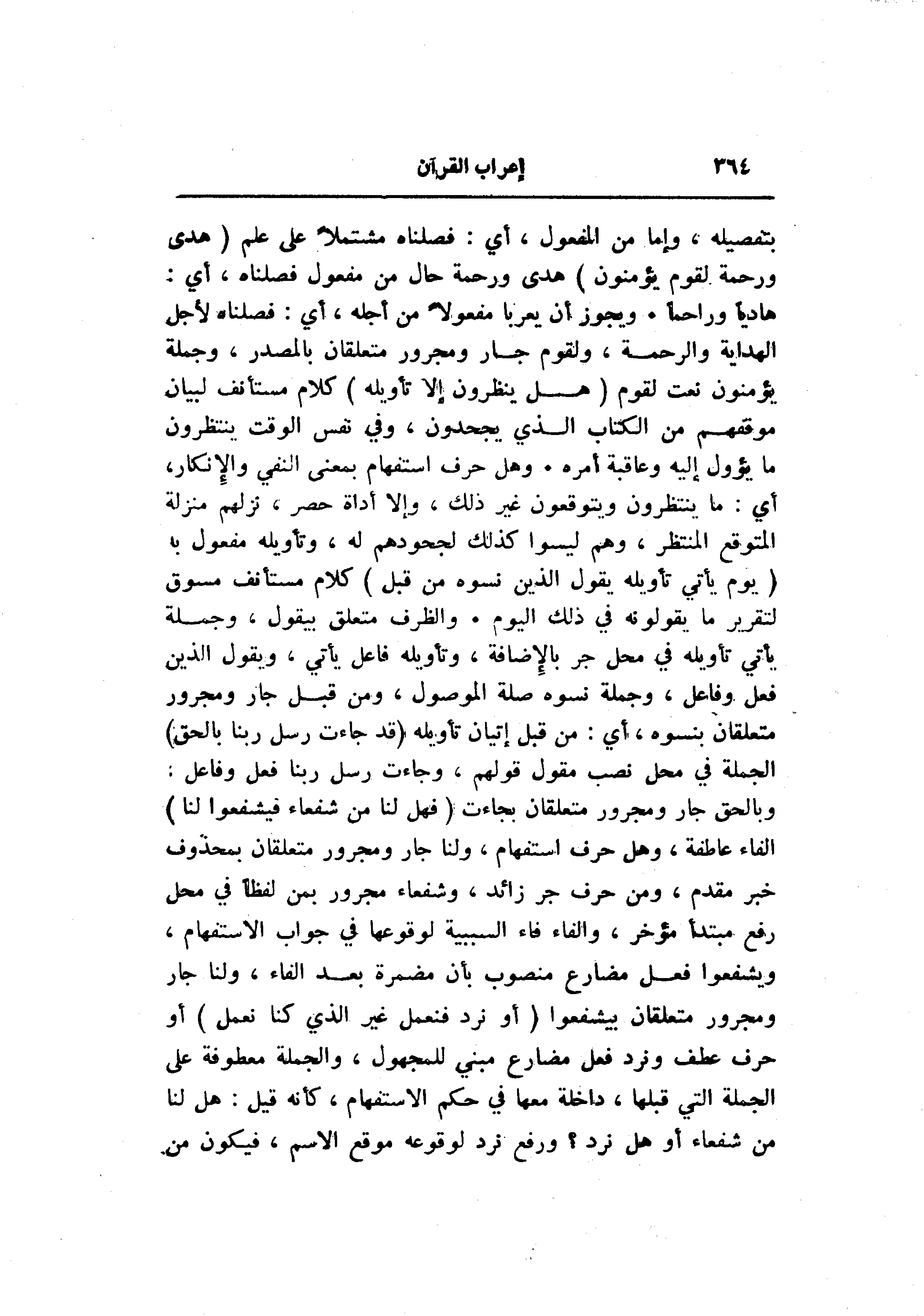 هاديا وراحما. ويجوز أن يعربا مفعولا من أجله، أي: فصلناه لأجل الهداية والرحمة، ولقوم جار ومجرور متعلقان بالمصدر، وجملة يؤمنون نعت لقوم (هَلْ يَنْظُرُونَ إِلَّا تَأْوِيلَهُ) كلام مستأنف لبيان موقفهم من الكتاب الذي يجحدون، وفي نفس الوقت ينتظرون ما يؤول إليه وعاقبة أمره. وهل حرف استفهام بمعنى النفي والإنكار، أي: ما ينتظرون ويتوقعون غير ذلك، وإلا أداة حصر، نزلهم منزلة المتوقع المنتظر، وهم ليسوا كذلك لجحودهم له، وتأويله مفعول به (يَوْمَ يَأْتِي تَأْوِيلُهُ يَقُولُ الَّذِينَ نَسُوهُ مِنْ قَبْلُ) كلام مستأنف مسوق لتقرير ما يقولونه في ذلك اليوم. والظرف متعلق بيقول، وجملة يأتي تأويله في محل جر بالإضافة، وتأويله فاعل يأتي، ويقول الذين فعل وفاعل، وجملة نسوه صلة الموصول، ومن قبل جار ومجرور متعلقان بنسوة، أي: من قبل إتيان تأويله (قَدْ جاءَتْ رُسُلُ رَبِّنا بِالْحَقِّ) الجملة في محل نصب مقول قولهم، وجاءت رسل ربنا فعل وفاعل: