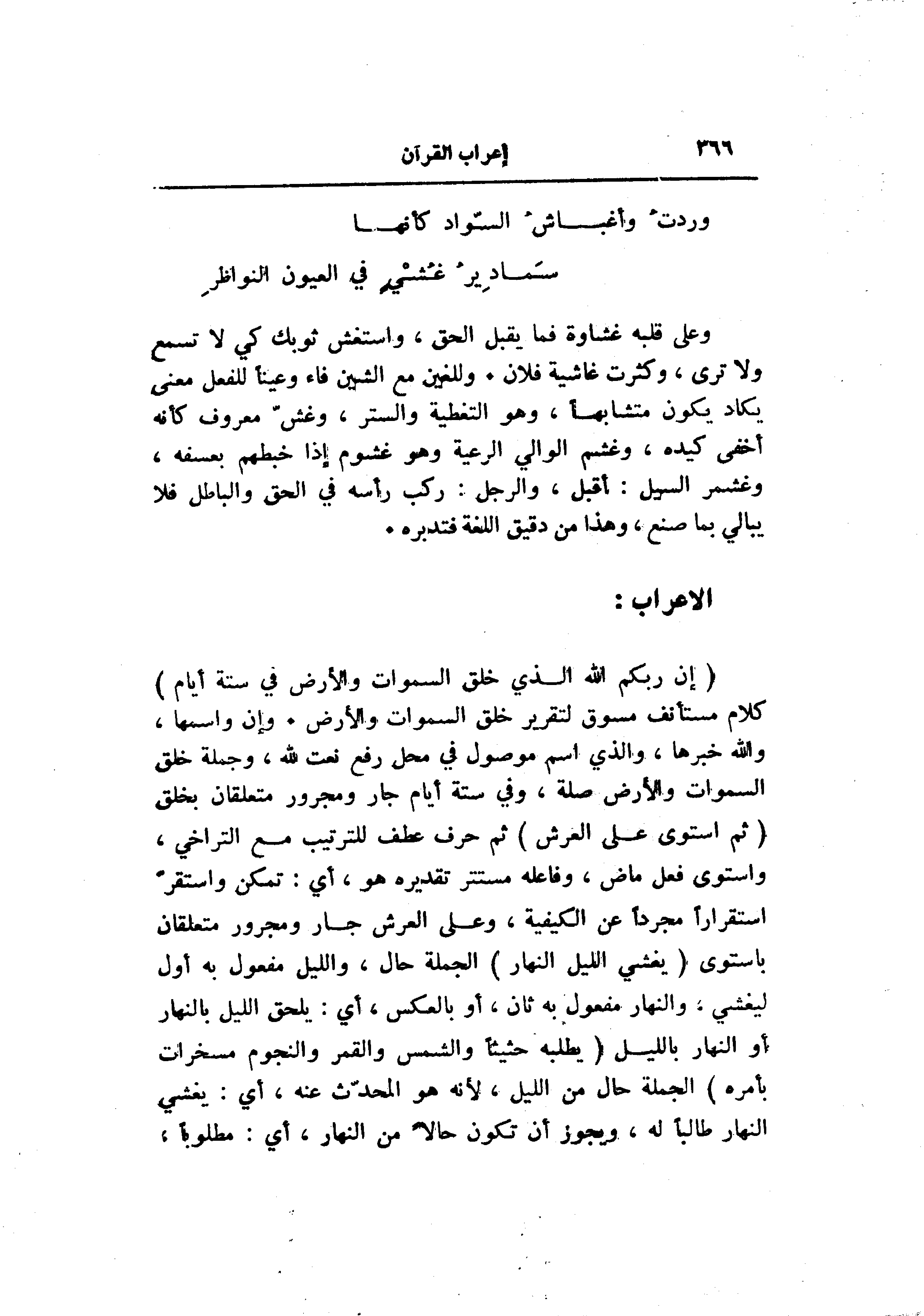 (إِنَّ رَبَّكُمُ اللَّهُ الَّذِي خَلَقَ السَّماواتِ وَالْأَرْضَ فِي سِتَّةِ أَيَّامٍ) كلام مستأنف مسوق لتقرير خلق السموات والأرض. وإن واسمها، والله خبرها، والذي اسم موصول في محل رفع نعت الله، وجملة خلق السموات والأرض صلة، وفي ستة أيام جار ومجرور متعلقان بخلق (ثُمَّ اسْتَوى عَلَى الْعَرْشِ) ثم حرف عطف للترتيب مع التراخي، واستوى فعل ماض، وفاعله مستتر تقديره هو، أي: تمكن واستقرّ استقرارا مجردا عن الكيفية، وعلى العرش جار ومجرور متعلقان باستوى (يُغْشِي اللَّيْلَ النَّهارَ) الجملة حال، والليل مفعول به أول ليغشي، والنهار مفعول به ثان، أو بالعكس، أي: يلحق الليل بالنهار أو النهار بالليل (يَطْلُبُهُ حَثِيثاً وَالشَّمْسَ وَالْقَمَرَ وَالنُّجُومَ مُسَخَّراتٍ بِأَمْرِهِ) الجملة حال من الليل، لأنه هو المحدّث عنه، أي: يغشي النهار طالبا له، ويجوز أن تكون حالا من النهار، أي: مطلوبا،