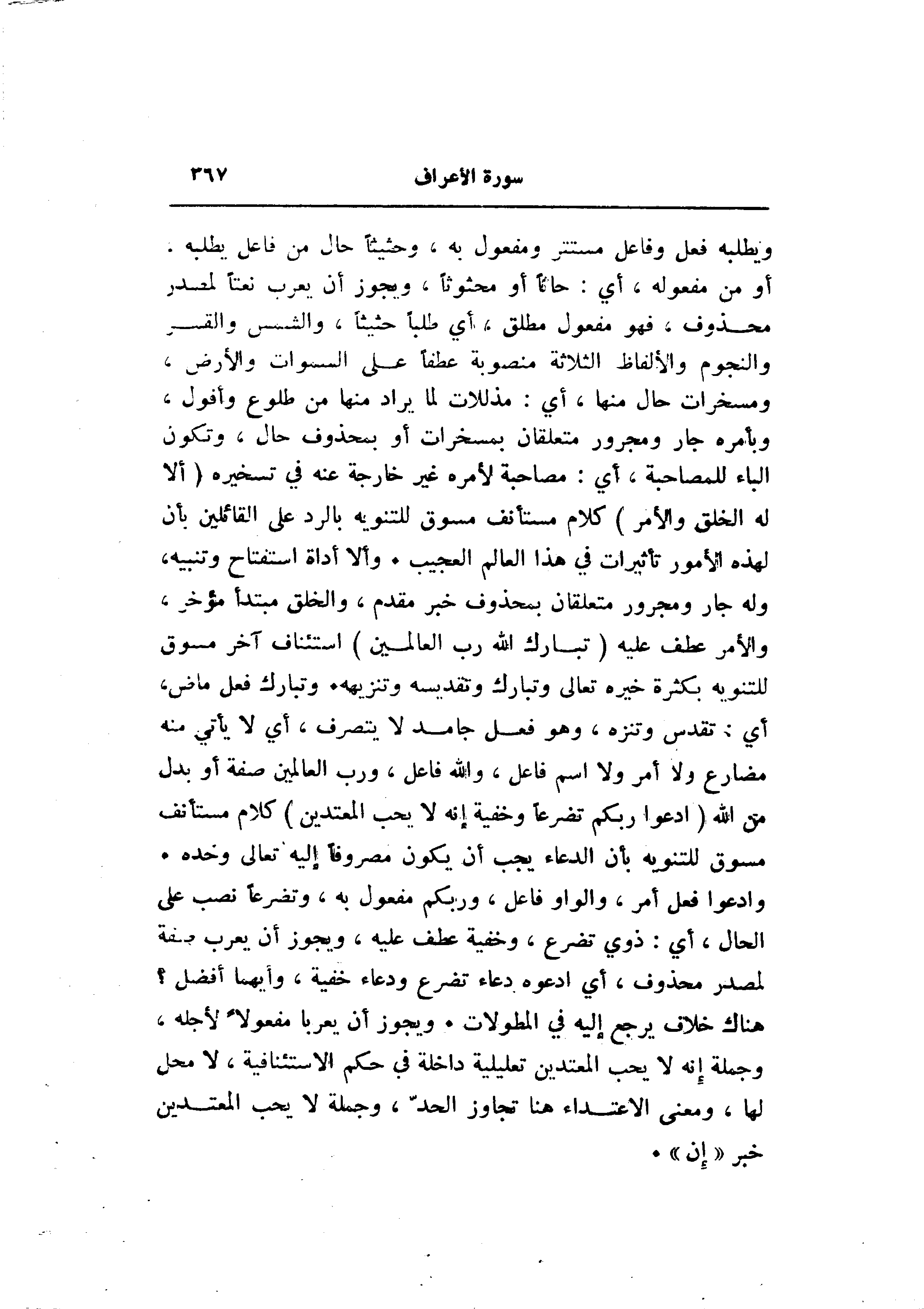 أو من مفعوله، أي: حاثا أو محثوثا، ويجوز أن يعرب نعتا لمصدر محذوف، فهو مفعول مطلق، أي طلبا حثيثا، والشمس والقمر والنجوم والألفاظ الثلاثة منصوبة عطفا على السموات والأرض، ومسخرات حال منها، أي: مذللات لما يراد منها من طلوع وأفول، وبأمره جار ومجرور متعلقان بمسخرات أو بمحذوف حال، وتكون الباء للمصاحبة، أي: مصاحبة لأمره غير خارجة عنه في تسخيره (أَلا لَهُ الْخَلْقُ وَالْأَمْرُ) كلام مستأنف مسوق للتنويه بالرد على القائلين بأن لهذه الأمور تأثيرات في هذا العالم العجيب. وألا أداة استفتاح وتنبيه، وله جار ومجرور متعلقان بمحذوف خبر مقدم، والخلق مبتدأ مؤخر، والأمر عطف عليه (تَبارَكَ اللَّهُ رَبُّ الْعالَمِينَ) استئناف آخر مسوق للتنويه بكثرة خيره تعالى وتبارك وتقديسه وتنزيهه. وتبارك فعل ماض، أي: تقدس وتنزه، وهو فعل جامد لا يتصرف، أي لا يأتي منه مضارع ولا أمر ولا اسم فاعل، والله فاعل، ورب العالمين صفة أو بدل من الله (ادْعُوا رَبَّكُمْ تَضَرُّعاً وَخُفْيَةً إِنَّهُ لا يُحِبُّ الْمُعْتَدِينَ) كلام مستأنف مسوق للتنويه بأن الدعاء يجب أن يكون مصروفا إليه تعالى وحده.