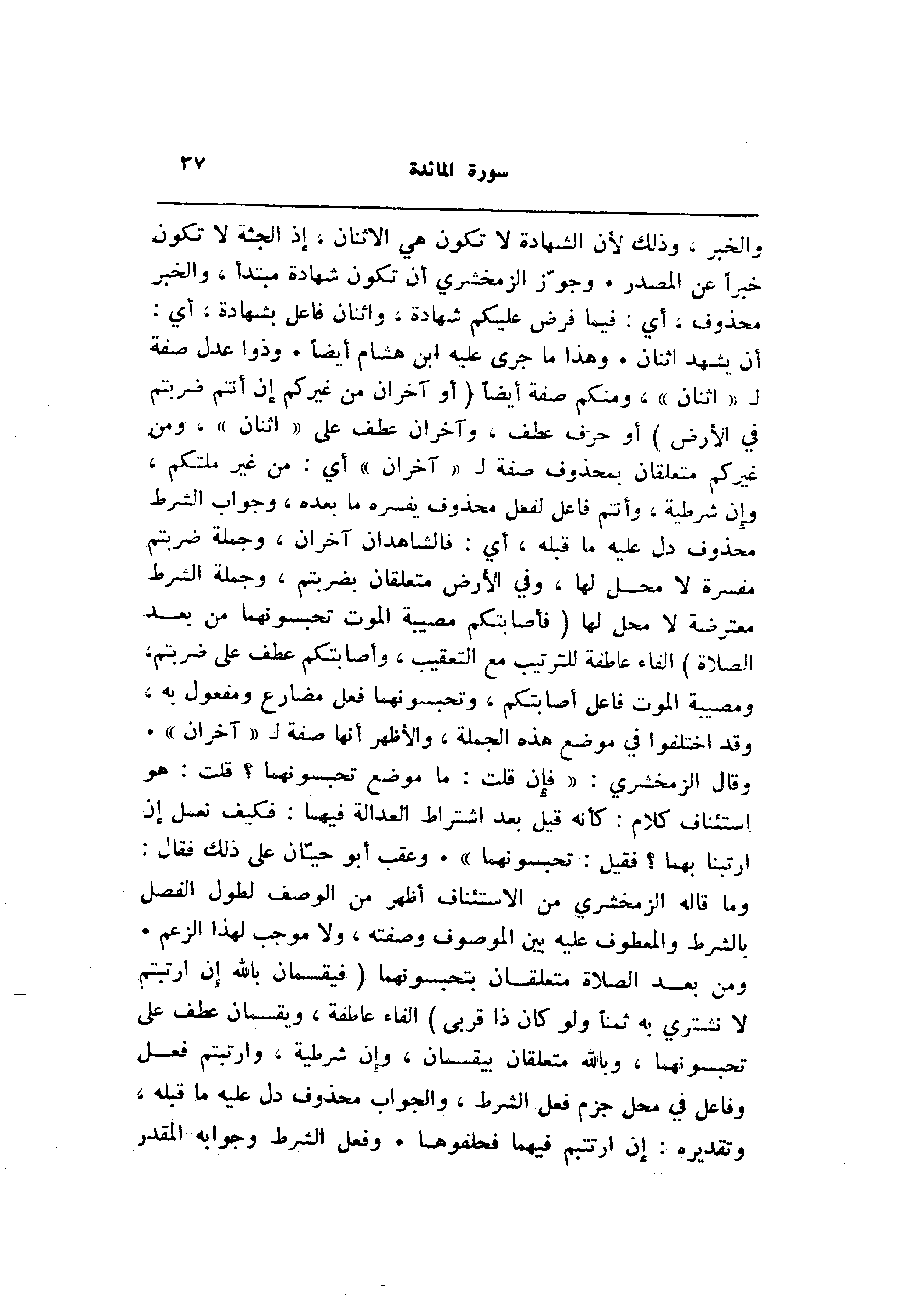 أن يشهد اثنان. وهذا ما جرى عليه ابن هشام أيضا. وذوا عدل صفة ل «اثنان» ، ومنكم صفة أيضا (أَوْ آخَرانِ مِنْ غَيْرِكُمْ إِنْ أَنْتُمْ ضَرَبْتُمْ فِي الْأَرْضِ) أو حرف عطف، وآخران عطف على «اثنان» ، ومن غيركم متعلقان بمحذوف صفة ل «آخران» أي: من غير ملتكم، وإن شرطية، وأنتم فاعل لفعل محذوف يفسره ما بعده، وجواب الشرط محذوف دل عليه ما قبله، أي: فالشاهدان آخران، وجملة ضربتم مفسرة لا محل لها، وفي الأرض متعلقان بضربتم، وجملة الشرط معترضة لا محل لها (فَأَصابَتْكُمْ مُصِيبَةُ الْمَوْتِ تَحْبِسُونَهُما مِنْ بَعْدِ الصَّلاةِ) الفاء عاطفة للترتيب مع التعقيب، وأصابتكم عطف على ضربتم، ومصيبة الموت فاعل أصابتكم، وتحبسونهما فعل مضارع ومفعول به، وقد اختلفوا في موضع هذه الجملة، والأظهر أنها صفة ل «آخران» .