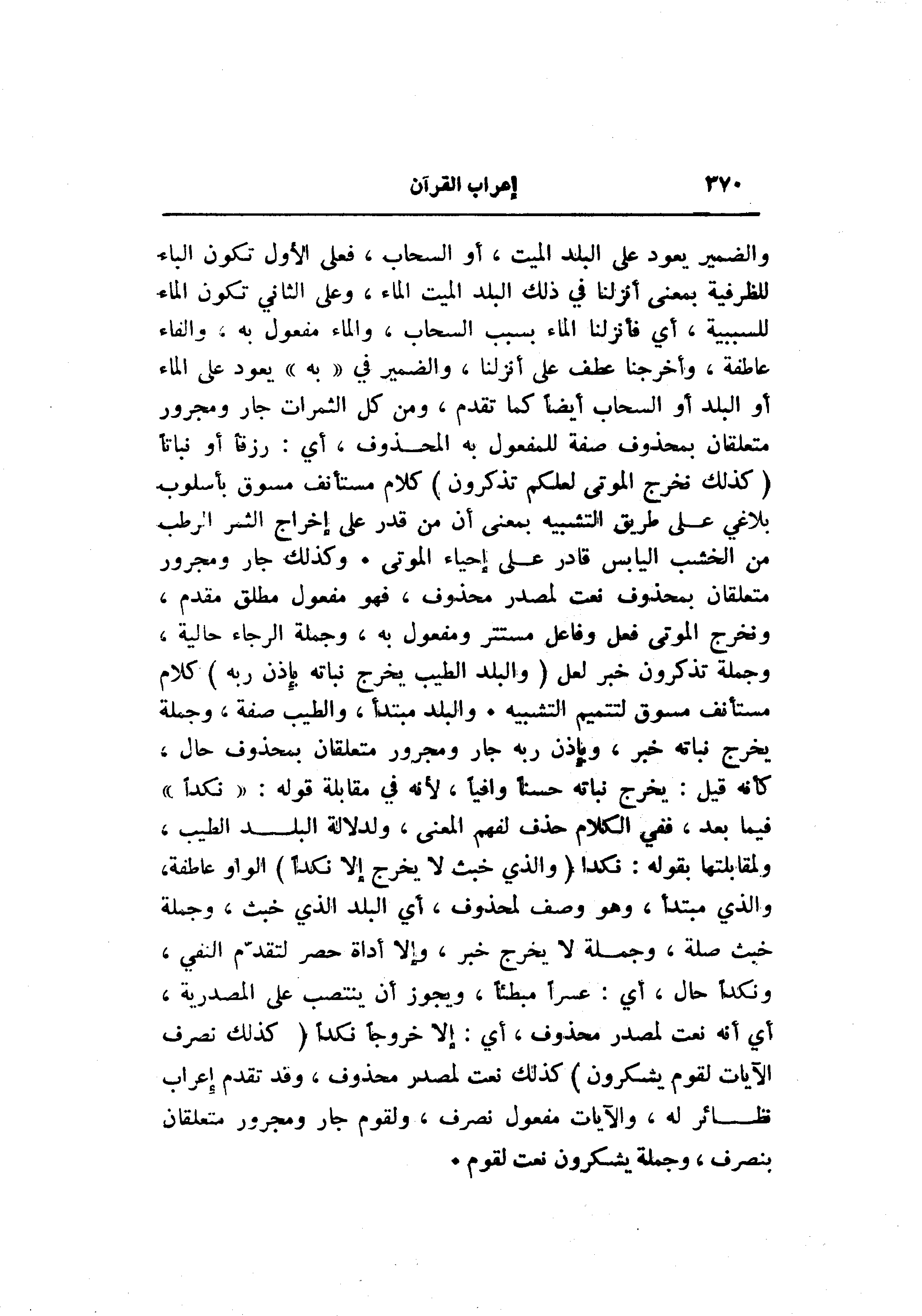 والضمير يعود على البلد الميت، أو السحاب، فعلى الأول تكون الباء للظرفية بمعنى أنزلنا في ذلك البلد الميت الماء، وعلى الثاني تكون الماء للسببية، أي فأنزلنا الماء بسبب السحاب، والماء مفعول به، والفاء عاطفة، وأخرجنا عطف على أنزلنا، والضمير في «به» يعود على الماء أو البلد أو السحاب أيضا كما تقدم، ومن كل الثمرات جار ومجرور متعلقان بمحذوف صفة للمفعول به المحذوف، أي: رزقا أو نباتا (كَذلِكَ نُخْرِجُ الْمَوْتى لَعَلَّكُمْ تَذَكَّرُونَ) كلام مستأنف مسوق بأسلوب بلاغي على طريق التشبيه بمعنى أن من قدر على إخراج الثمر الرطب من الخشب اليابس قادر على إحياء الموتى. وكذلك جار ومجرور متعلقان بمحذوف نعت لمصدر محذوف، فهو مفعول مطلق مقدم، ونخرج الموتى فعل وفاعل مستتر ومفعول به، وجملة الرجاء حالية، وجملة تذكرون خبر لعل (وَالْبَلَدُ الطَّيِّبُ يَخْرُجُ نَباتُهُ بِإِذْنِ رَبِّهِ) كلام مستأنف مسوق لتتميم التشبيه. والبلد مبتدأ، والطيب صفة، وجملة يخرج نباته خبر، وبإذن ربه جار ومجرور متعلقان بمحذوف حال، كأنه قيل: يخرج نباته حسنا وافيا، لأنه في مقابلة قوله: «نكدا» فيما بعد، ففي الكلام حذف لفهم المعنى، ولدلالة البلد الطيب، ولمقابلتها بقوله: نكدا (وَالَّذِي خَبُثَ لا يَخْرُجُ إِلَّا نَكِداً) الواو عاطفة، والذي مبتدأ، وهو وصف لمحذوف، أي البلد الذي خبث، وجملة خبث صلة، وجملة لا يخرج خبر، وإلا أداة حصر لتقدّم النفي، ونكدا حال، أي: عسرا مبطئا، ويجوز أن ينتصب على المصدرية، أي أنه نعت لمصدر محذوف، أي: إلا خروجا نكدا (كَذلِكَ نُصَرِّفُ الْآياتِ لِقَوْمٍ يَشْكُرُونَ) كذلك نعت لمصدر محذوف، وقد تقدم إعراب نظائر له، والآيات مفعول نصرف، ولقوم جار ومجرور متعلقان بنصرف، وجملة يشكرون نعت لقوم.