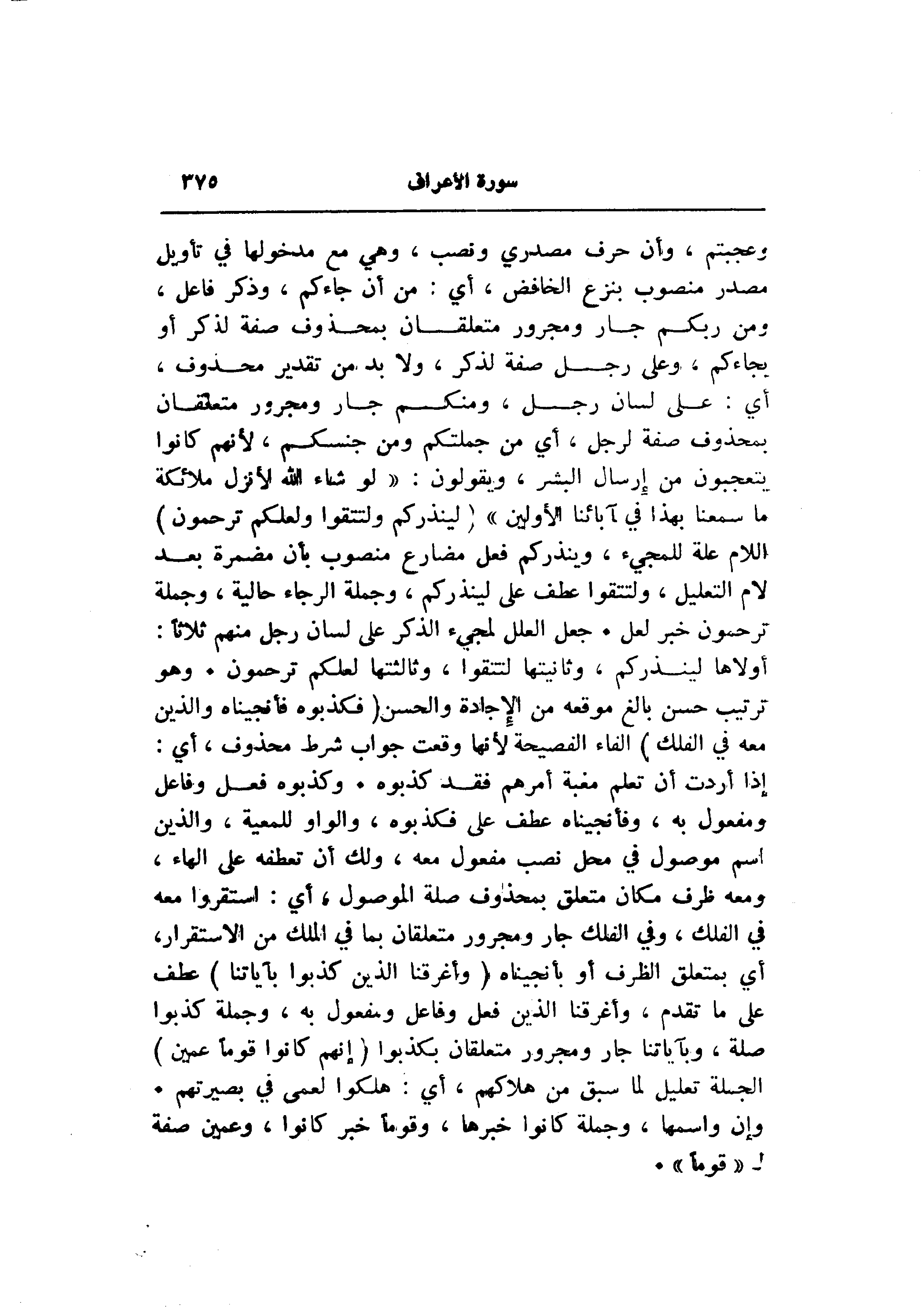 وعجبتم، وأن حرف مصدري ونصب، وهي مع مدخولها في تأويل مصدر منصوب بنزع الخافض، أي: من أن جاءكم، وذكر فاعل، ومن ربكم جار ومجرور متعلقان بمحذوف صفة لذكر أو بجاءكم، وعلى رجل صفة لذكر، ولا بد من تقدير محذوف، أي: على لسان رجل، ومنكم جار ومجرور متعلقان بمحذوف صفة لرجل، أي من جملتكم ومن جنسكم، لأنهم كانوا يتعجبون من إرسال البشر، ويقولون: «لو شاء الله لأنزل ملائكة ما سمعنا بهذا في آبائنا الأولين» (لِيُنْذِرَكُمْ وَلِتَتَّقُوا وَلَعَلَّكُمْ تُرْحَمُونَ) اللام علة للمجيء، وينذركم فعل مضارع منصوب بأن مضمرة بعد لام التعليل، ولتتقوا عطف على لينذركم، وجملة الرجاء حالية، وجملة ترحمون خبر لعل. جعل العلل لمجيء الذكر على لسان رجل منهم ثلاثا: