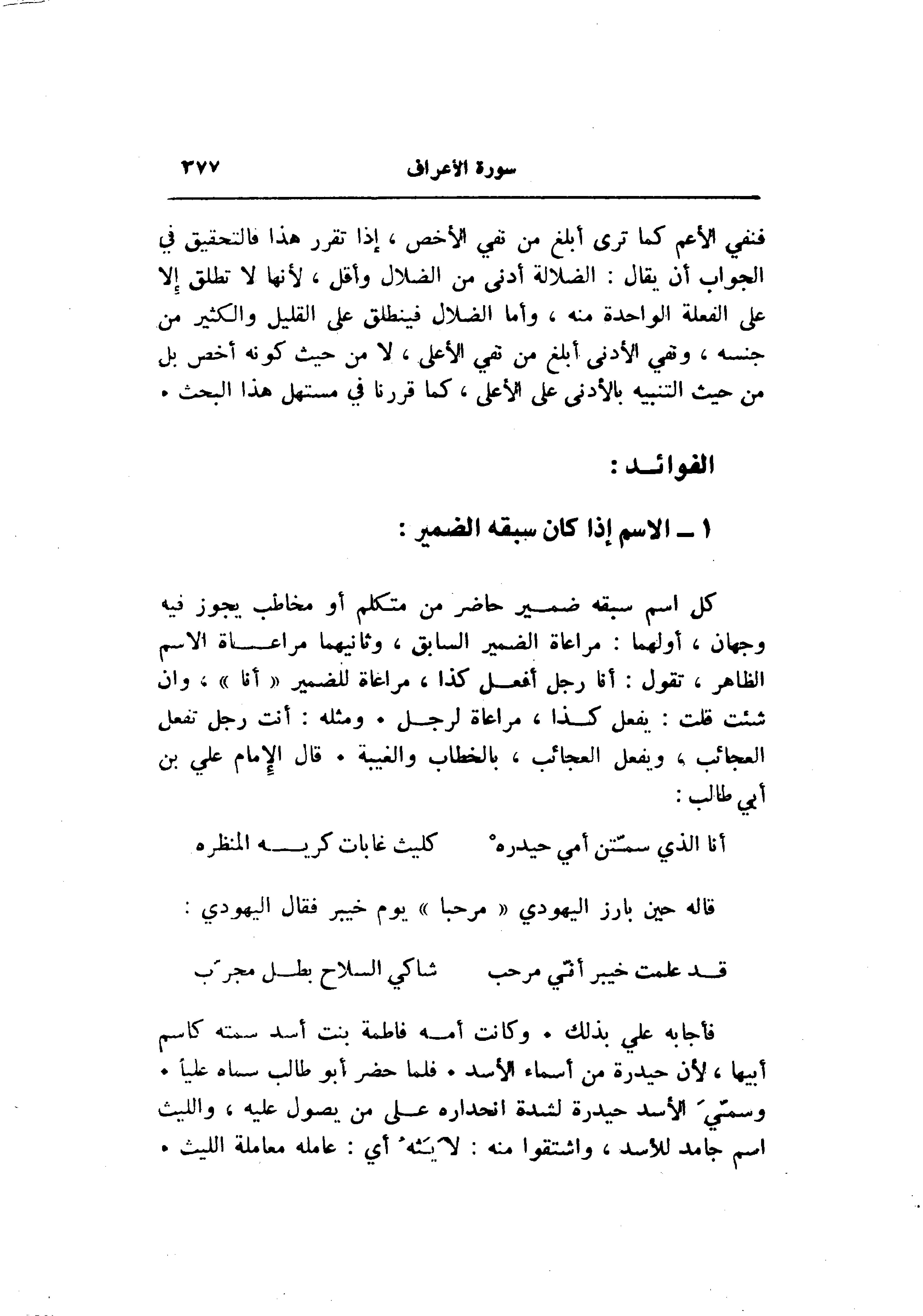 كل اسم سبقه ضمير حاضر من متكلم أو مخاطب يجوز فيه وجهان، أولهما: مراعاة الضمير السابق، وثانيهما مراعاة الاسم الظاهر، تقول: أنا رجل أفعل كذا، مراعاة للضمير «أنا» ، وان شئت قلت: يفعل كذا، مراعاة لرجل. ومثله: أنت رجل تفعل العجائب، ويفعل العجائب، بالخطاب والغيبة. قال الإمام علي بن أبي طالب: