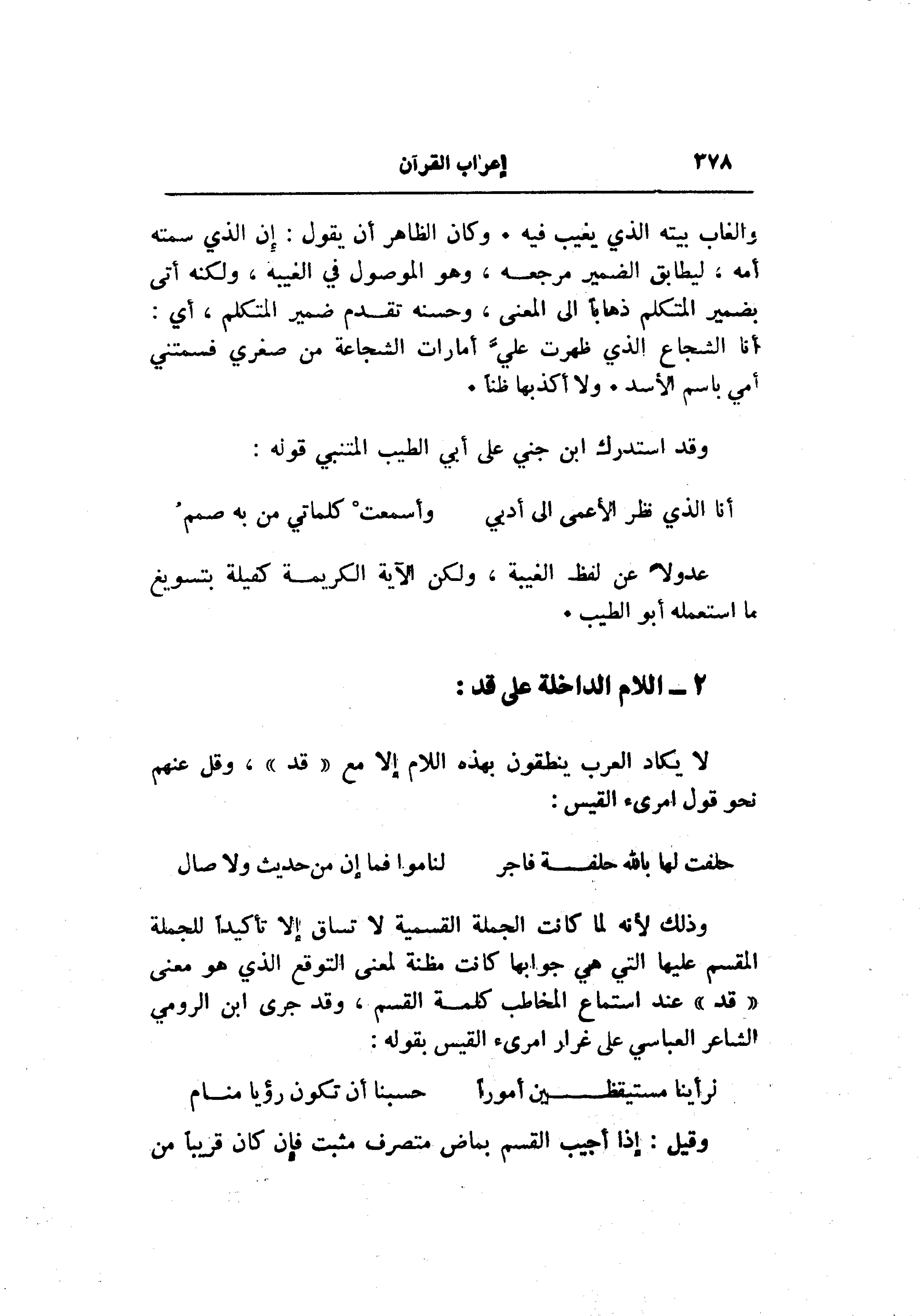 وذلك لأنه لما كانت الجملة القسمية لا تساق إلا تأكيدا للجملة المقسم عليها التي هي جوابها كانت مظنة لمعنى التوقع الذي هو معنى «قد» عند استماع المخاطب كلمة القسم، وقد جرى ابن الرومي الشاعر العباسي على غرار امرئ القيس بقوله: