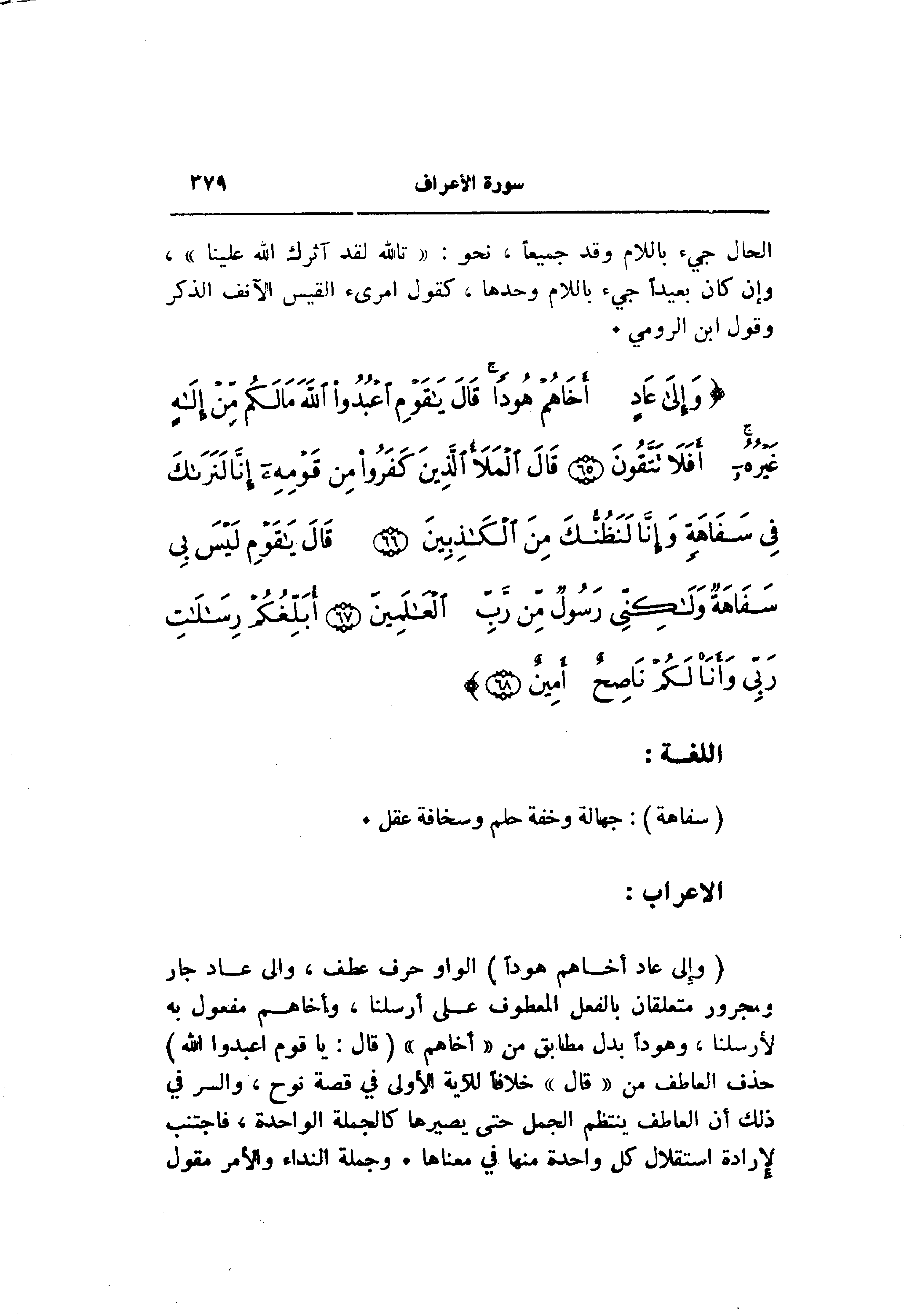 (وَإِلى عادٍ أَخاهُمْ هُوداً) الواو حرف عطف، والى عاد جار ومجرور متعلقان بالفعل المعطوف على أرسلنا، وأخاهم مفعول به لأرسلنا، وهودا بدل مطابق من «أخاهم» (قالَ: يا قَوْمِ اعْبُدُوا اللَّهَ) حذف العاطف من «قال» خلافا للآية الأولى في قصة نوح، والسر في ذلك أن العاطف ينتظم الجمل حتى يصيرها كالجملة الواحدة، فاجتنب لإرادة استقلال كل واحدة منها في معناها. وجملة النداء والأمر مقول