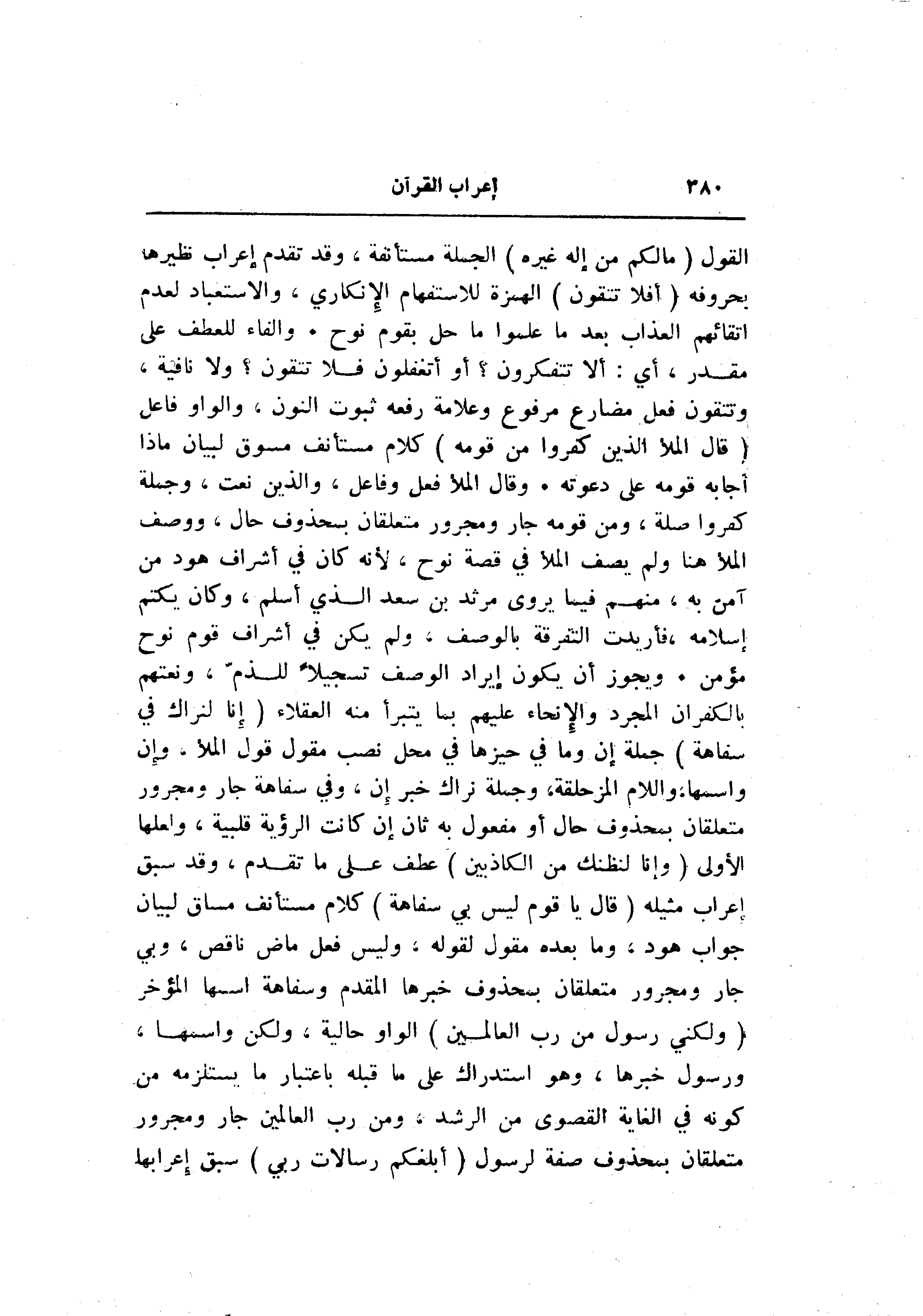 القول (ما لَكُمْ مِنْ إِلهٍ غَيْرُهُ) الجملة مستأنفة، وقد تقدم إعراب نظيرها بحروفه (أَفَلا تَتَّقُونَ) الهمزة للاستفهام الإنكاري، والاستعباد لعدم اتقائهم العذاب بعد ما علموا ما حل بقوم نوح. والفاء للعطف على مقدر، أي: ألا تتفكرون؟ أو أتغفلون فلا تتقون؟ ولا نافية، وتتقون فعل مضارع مرفوع وعلامة رفعه ثبوت النون، والواو فاعل (قالَ الْمَلَأُ الَّذِينَ كَفَرُوا مِنْ قَوْمِهِ) كلام مستأنف مسوق لبيان ماذا أجابه قومه على دعوته. وقال الملأ فعل وفاعل، والذين نعت، وجملة كفروا صلة، ومن قومه جار ومجرور متعلقان بمحذوف حال، ووصف الملأ هنا ولم يصف الملأ في قصة نوح، لأنه كان في أشراف هود من آمن به، منهم فيما يروى مرثد بن سعد الذي أسلم، وكان يكتم إسلامه، فأريدت التفرقة بالوصف، ولم يكن في أشراف قوم نوح مؤمن. ويجوز أن يكون إيراد الوصف تسجيلا للذمّ، ونعتهم بالكفران المجرد والإنحاء عليهم بما يتبرأ منه العقلاء (إِنَّا لَنَراكَ فِي سَفاهَةٍ) جملة إن وما في حيزها في محل نصب مقول قول الملأ، وإن واسمها، واللام المزحلقة، وجملة نراك خبر إن، وفي سفاهة جار ومجرور متعلقان بمحذوف حال أو مفعول به ثان إن كانت الرؤية قلبية، ولعلها الأولى (وَإِنَّا لَنَظُنُّكَ مِنَ الْكاذِبِينَ) عطف على ما تقدم، وقد سبق إعراب مثيله (قالَ يا قَوْمِ لَيْسَ بِي سَفاهَةٌ) كلام مستأنف مساق لبيان جواب هود، وما بعده مقول لقوله، وليس فعل ماض ناقص، وبي جار ومجرور متعلقان بمحذوف خبرها المقدم وسفاهة اسمها المؤخر (وَلكِنِّي رَسُولٌ مِنْ رَبِّ الْعالَمِينَ) الواو حالية، ولكن واسمها، ورسول خبرها، وهو استدراك على ما قبله باعتبار ما يستلزمه من كونه في الغاية القصوى من الرشد، ومن رب العالمين جار ومجرور متعلقان بمحذوف صفة لرسول (أُبَلِّغُكُمْ رِسالاتِ رَبِّي) سبق إعرابها