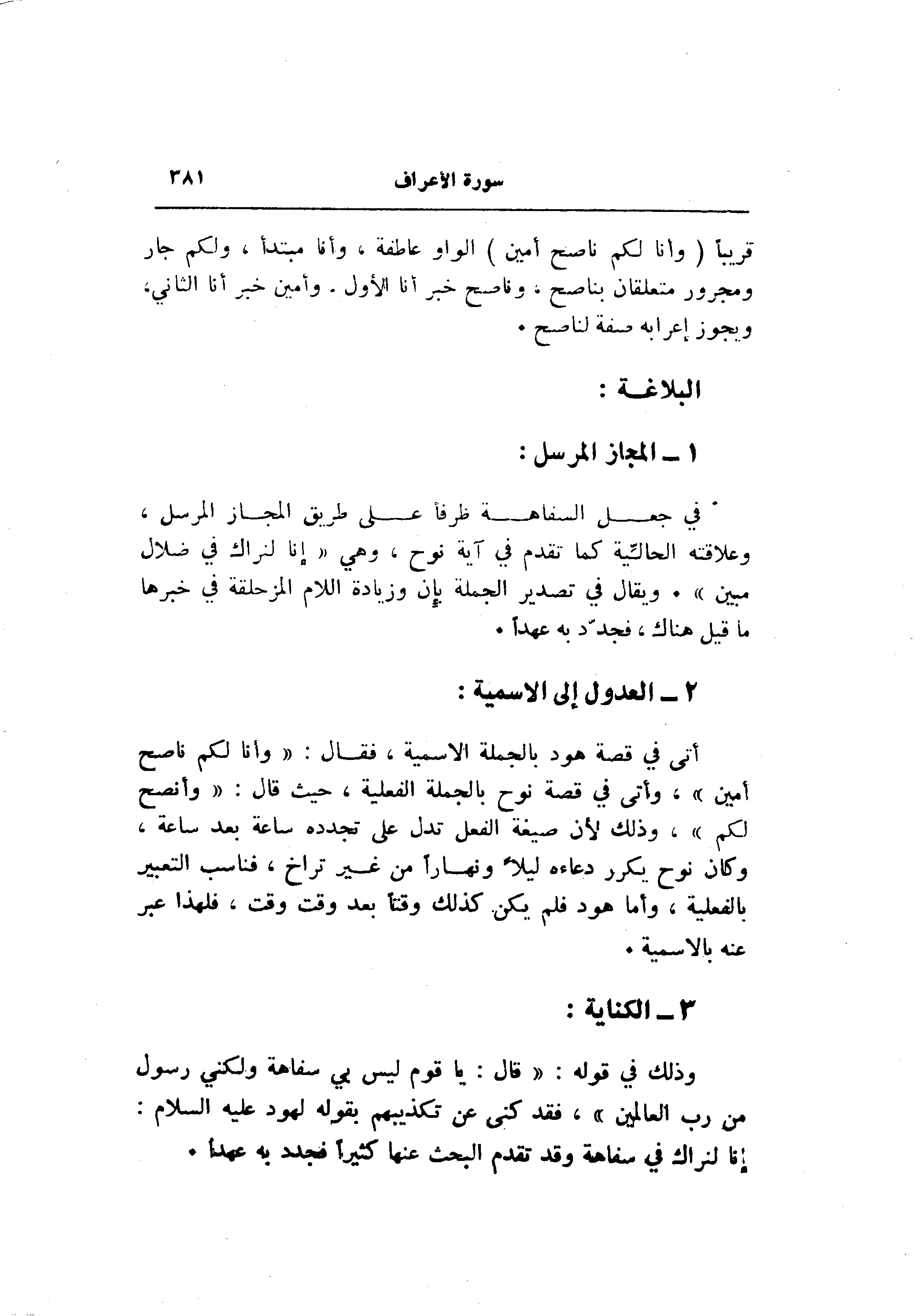 أتى في قصة هود بالجملة الاسمية، فقال: «وأنا لكم ناصح أمين» ، وأتى في قصة نوح بالجملة الفعلية، حيث قال: «وأنصح لكم» ، وذلك لأن صيغة الفعل تدل على تجدده ساعة بعد ساعة، وكان نوح يكرر دعاءه ليلا ونهارا من غير تراخ، فناسب التعبير بالفعلية، وأما هود فلم يكن كذلك وقتا بعد وقت وقت، فلهذا عبر عنه بالاسمية.
