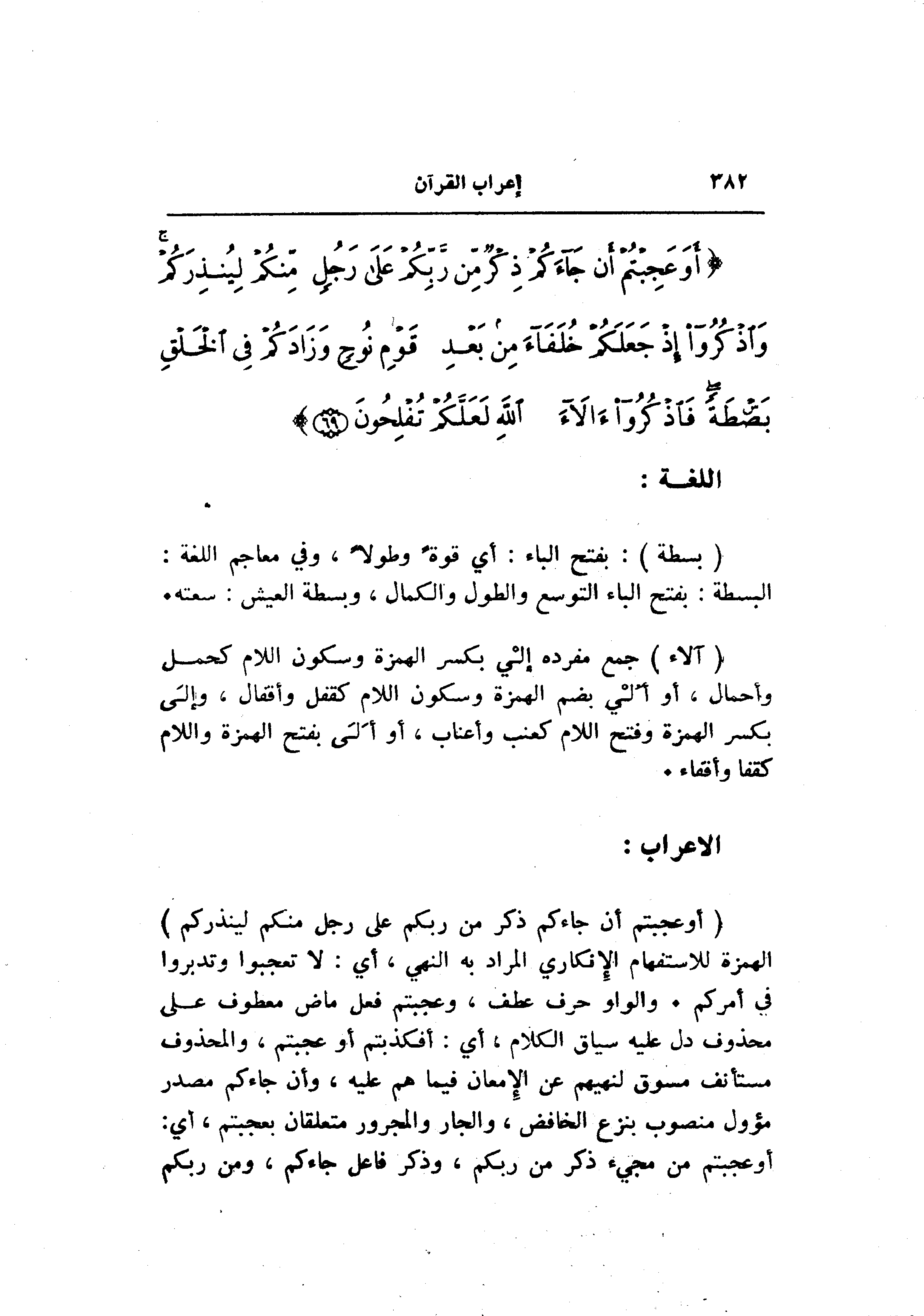 (أَوَعَجِبْتُمْ أَنْ جاءَكُمْ ذِكْرٌ مِنْ رَبِّكُمْ عَلى رَجُلٍ مِنْكُمْ لِيُنْذِرَكُمْ) الهمزة للاستفهام الإنكاري المراد به النهي، أي: لا تعجبوا وتدبروا في أمركم. والواو حرف عطف، وعجبتم فعل ماض معطوف على محذوف دل عليه سياق الكلام، أي: أفكذبتم أو عجبتم، والمحذوف مستأنف مسوق لنهيهم عن الإمعان فيما هم عليه، وأن جاءكم مصدر مؤول منصوب بنزع الخافض، والجار والمجرور متعلقان بعجبتم، أي: