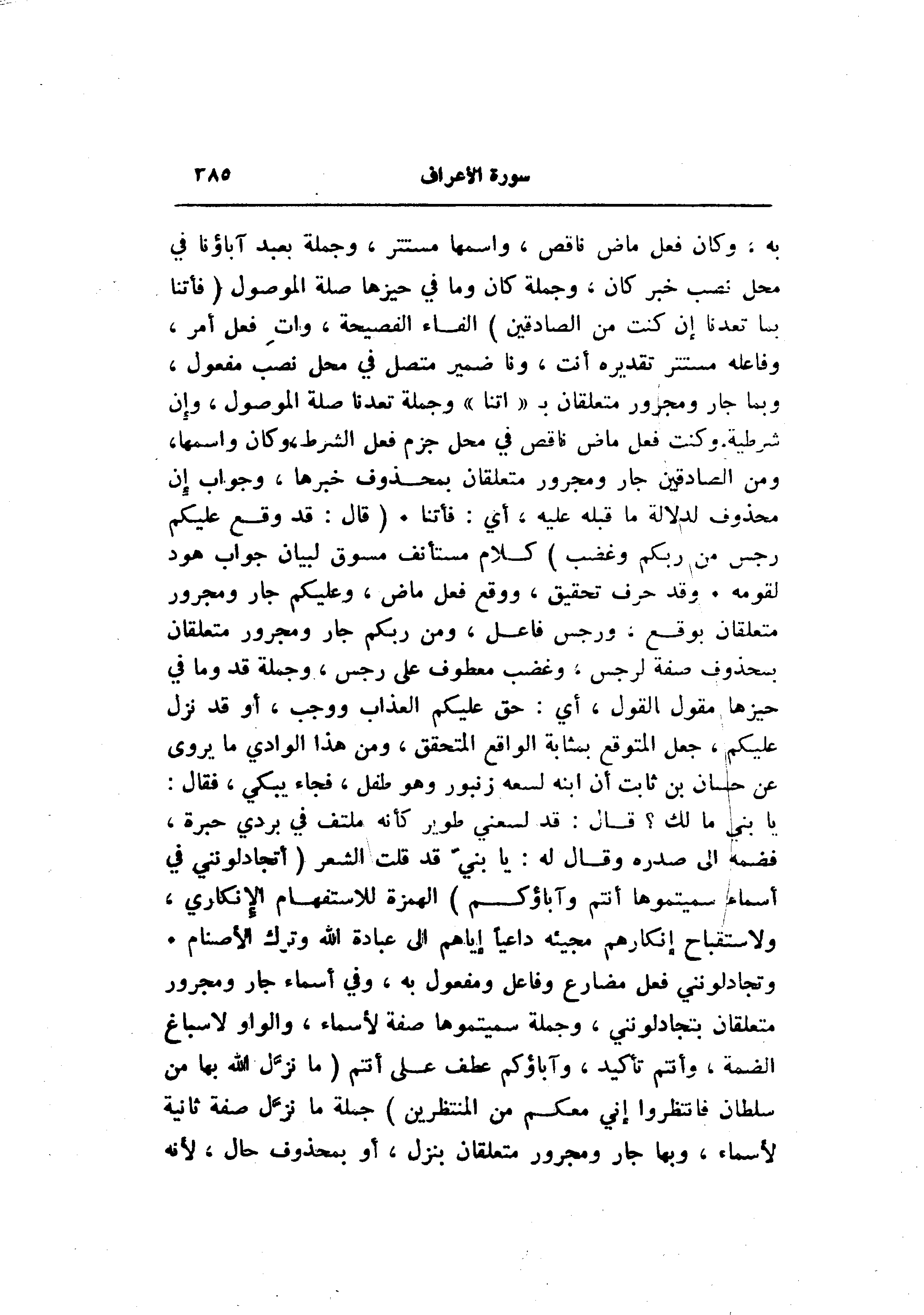 به، وكان فعل ماض ناقص، واسمها مستتر، وجملة بعبد آباؤنا في محل نصب خبر كان، وجملة كان وما في حيزها صلة الموصول (فَأْتِنا بِما تَعِدُنا إِنْ كُنْتَ مِنَ الصَّادِقِينَ) الفاء الفصيحة، وات فعل أمر، وفاعله مستتر تقديره أنت، ونا ضمير متصل في محل نصب مفعول، وبما جار ومجرور متعلقان ب «اتنا» وجملة تعدنا صلة الموصول، وإن شرطية. وكنت فعل ماض ناقص في محل جزم فعل الشرط، وكان واسمها، ومن الصادقين جار ومجرور متعلقان بمحذوف خبرها، وجواب إن محذوف لدلالة ما قبله عليه، أي: فأتنا. (قال: قد وقع عليكم رجس من ربكم وغضب) كلام مستأنف مسوق لبيان جواب هود لقومه. وقد حرف تحقيق، ووقع فعل ماض، وعليكم جار ومجرور متعلقان بوقع، ورجس فاعل، ومن ربكم جار ومجرور متعلقان بمحذوف صفة لرجس، وغضب معطوف على رجس، وجملة قد وما في حيزها مقول القول، أي: حق عليكم العذاب ووجب، أو قد نزل عليكم، جعل المتوقع بمثابة الواقع المتحقق، ومن هذا الوادي ما يروى عن حسان بن ثابت أن ابنه لسعه زنبور وهو طفل، فجاء يبكي، فقال: