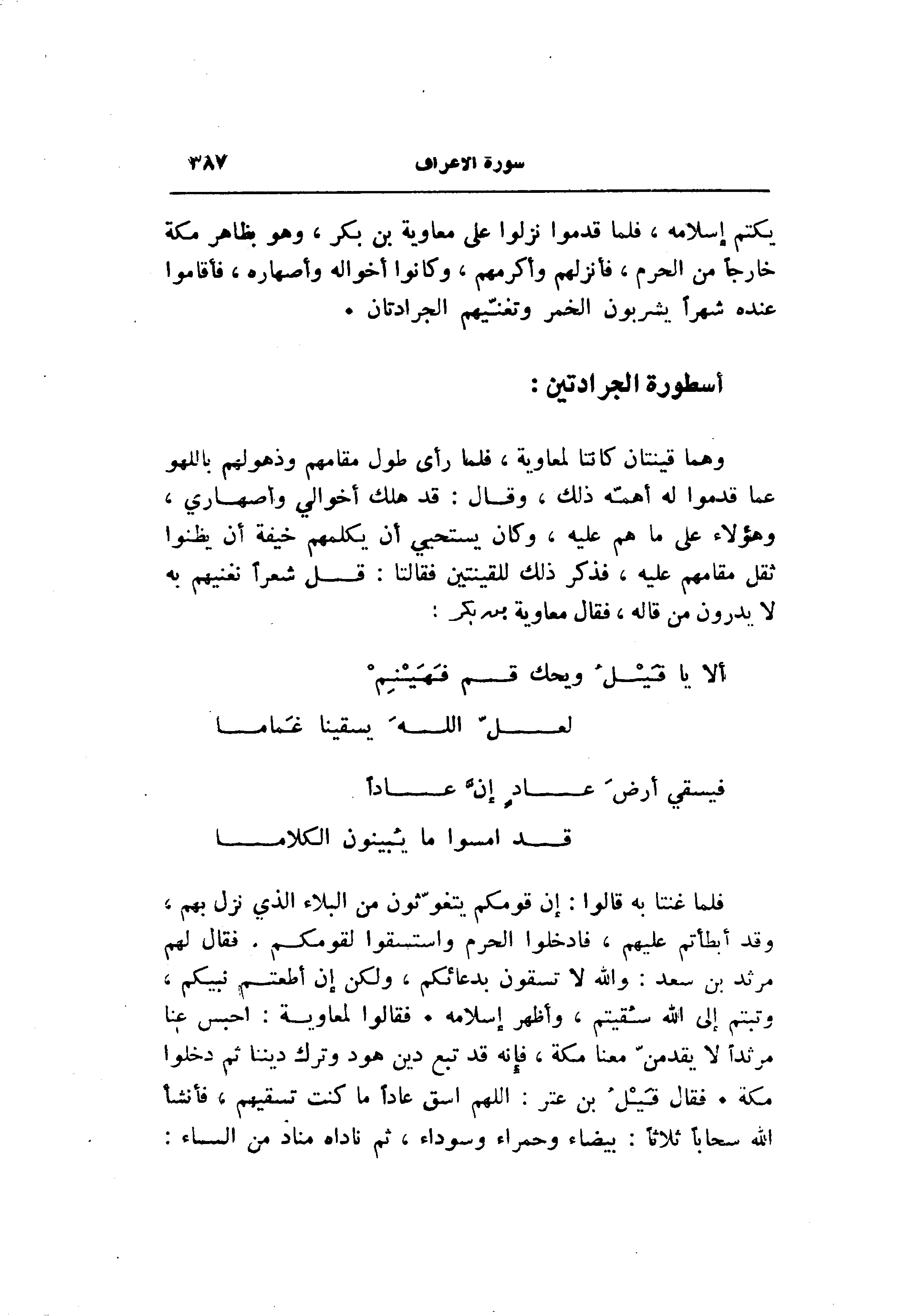 فلما غنتا به قالوا: إن قومكم يتغوّثون من البلاء الذي نزل بهم، وقد أبطأتم عليهم، فادخلوا الحرم واستسقوا لقومكم. فقال لهم مرثد بن سعد: والله لا تسقون بدعائكم، ولكن إن أطعتم نبيكم، وتبتم إلى الله سقيتم، وأظهر إسلامه. فقالوا لمعاوية: احبس عنا مرثدا لا يقدمنّ معنا مكة، فإنه قد تبع دين هود وترك ديننا ثم دخلوا مكة. فقال قيل بن عتر: اللهم اسق عادا ما كنت تسقيهم، فأنشأ الله سحابا ثلاثا: بيضاء وحمراء وسوداء، ثم ناداه مناد من السماء: