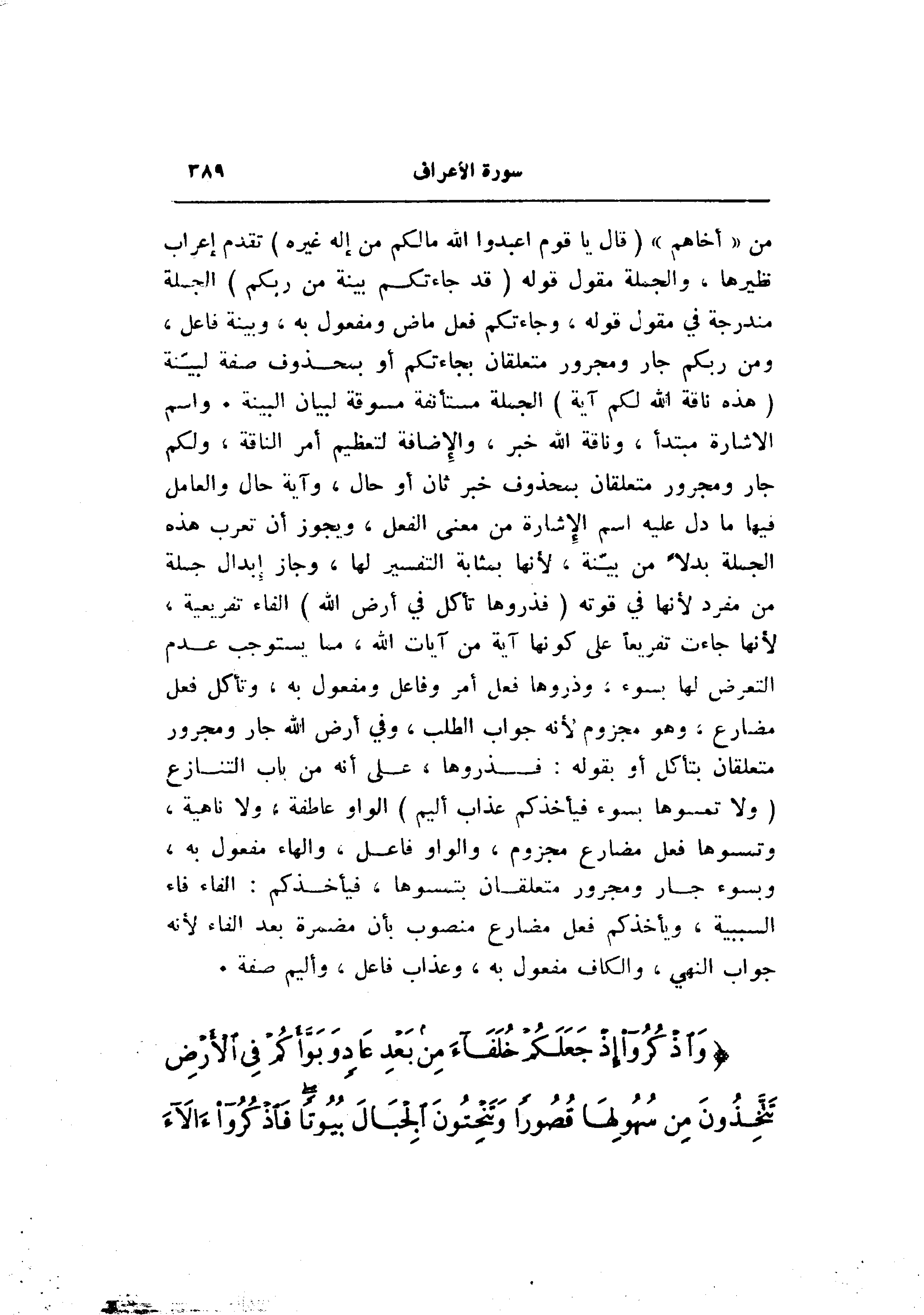 من «أخاهم» (قالَ يا قَوْمِ اعْبُدُوا اللَّهَ ما لَكُمْ مِنْ إِلهٍ غَيْرُهُ) تقدم إعراب نظيرها، والجملة مقول قوله (قَدْ جاءَتْكُمْ بَيِّنَةٌ مِنْ رَبِّكُمْ) الجملة مندرجة في مقول قوله، وجاءتكم فعل ماض ومفعول به، وبينة فاعل، ومن ربكم جار ومجرور متعلقان بجاءتكم أو بمحذوف صفة لبيّنة (هذِهِ ناقَةُ اللَّهِ لَكُمْ آيَةً) الجملة مستأنفة مسوقة لبيان البينة. واسم الاشارة مبتدأ، وناقة الله خبر، والإضافة لتعظيم أمر الناقة، ولكم جار ومجرور متعلقان بمحذوف خبر ثان أو حال، وآية حال والعامل فيها ما دل عليه اسم الإشارة من معنى الفعل، ويجوز أن تعرب هذه الجملة بدلا من بيّنة، لأنها بمثابة التفسير لها، وجاز إبدال جملة من مفرد لأنها في قوته (فَذَرُوها تَأْكُلْ فِي أَرْضِ اللَّهِ) الفاء تفريعية، لأنها جاءت تفريعا على كونها آية من آيات الله، مما يستوجب عدم التعرض لها بسوء، وذروها فعل أمر وفاعل ومفعول به، وتأكل فعل مضارع، وهو مجزوم لأنه جواب الطلب، وفي أرض الله جار ومجرور متعلقان بتأكل أو بقوله: فذروها، على أنه من باب التنازع (وَلا تَمَسُّوها بِسُوءٍ فَيَأْخُذَكُمْ عَذابٌ أَلِيمٌ) الواو عاطفة، ولا ناهية، وتمسوها فعل مضارع مجزوم، والواو فاعل، والهاء مفعول به، وبسوء جار ومجرور متعلقان بتمسوها، فيأخذكم: الفاء فاء السببية، ويأخذكم فعل مضارع منصوب بأن مضمرة بعد الفاء لأنه جواب النهي، والكاف مفعول به، وعذاب فاعل، وأليم صفة.