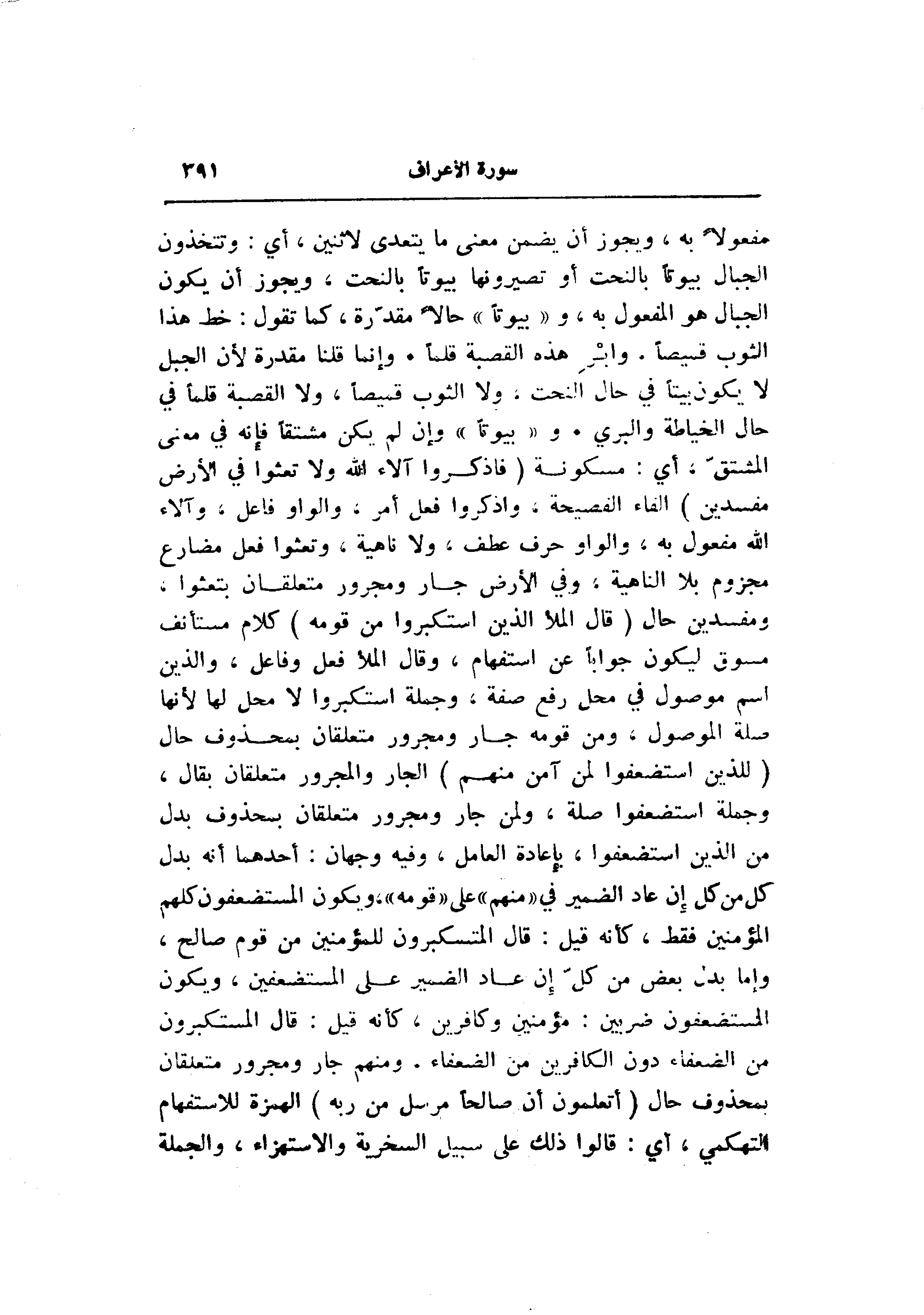 مفعولا به، ويجوز أن يضمن معنى ما يتعدى لاثنين، أي: وتتخذون الجبال بيوتا بالنحت أو تصيرونها بيوتا بالنحت، ويجوز أن يكون الجبال هو المفعول به، و «بيوتا» حالا مقدّرة، كما تقول: خط هذا الثوب قميصا. وابر هذه القصبة قلما. وإنما قلنا مقدرة لأن الجبل لا يكون بيتا في حال النحت، ولا الثوب قميصا، ولا القصبة قلما في حال الخياطة والبري. و «بيوتا» وإن لم يكن مشتقا فإنه في معنى المشتقّ، أي: مسكونة (فَاذْكُرُوا آلاءَ اللَّهِ وَلا تَعْثَوْا فِي الْأَرْضِ مُفْسِدِينَ) الفاء الفصيحة، واذكروا فعل أمر، والواو فاعل، وآلاء الله مفعول به، والواو حرف عطف، ولا ناهية، وتعثوا فعل مضارع مجزوم بلا الناهية، وفي الأرض جار ومجرور متعلقان بتعثوا، ومفسدين حال (قالَ الْمَلَأُ الَّذِينَ اسْتَكْبَرُوا مِنْ قَوْمِهِ) كلام مستأنف مسوق ليكون جوابا عن استفهام، وقال الملأ فعل وفاعل، والذين اسم موصول في محل رفع صفة، وجملة استكبروا لا محل لها لأنها صلة الموصول، ومن قومه جار ومجرور متعلقان بمحذوف حال (لِلَّذِينَ اسْتُضْعِفُوا لِمَنْ آمَنَ مِنْهُمْ) الجار والمجرور متعلقان بقال، وجملة استضعفوا صلة، ولمن جار ومجرور متعلقان بمحذوف بدل من الذين استضعفوا، بإعادة العامل، وفيه وجهان: أحدهما أنه بدل كل من كل إن عاد الضمير في «منهم» على «قومه» ، ويكون المستضعفون كلهم المؤمنين فقط، كأنه قيل: قال المستكبرون للمؤمنين من قوم صالح، وإما بدل بعض من كلّ إن عاد الضمير على المستضعفين، ويكون المستضعفون ضربين: مؤمنين وكافرين، كأنه قيل: قال المستكبرون من الضعفاء دون الكافرين من الضعفاء، ومنهم جار ومجرور متعلقان بمحذوف حال (أَتَعْلَمُونَ أَنَّ صالِحاً مُرْسَلٌ مِنْ رَبِّهِ) الهمزة للاستفهام التهكمي، أي: قالوا ذلك على سبيل السخرية والاستهزاء، والجملة