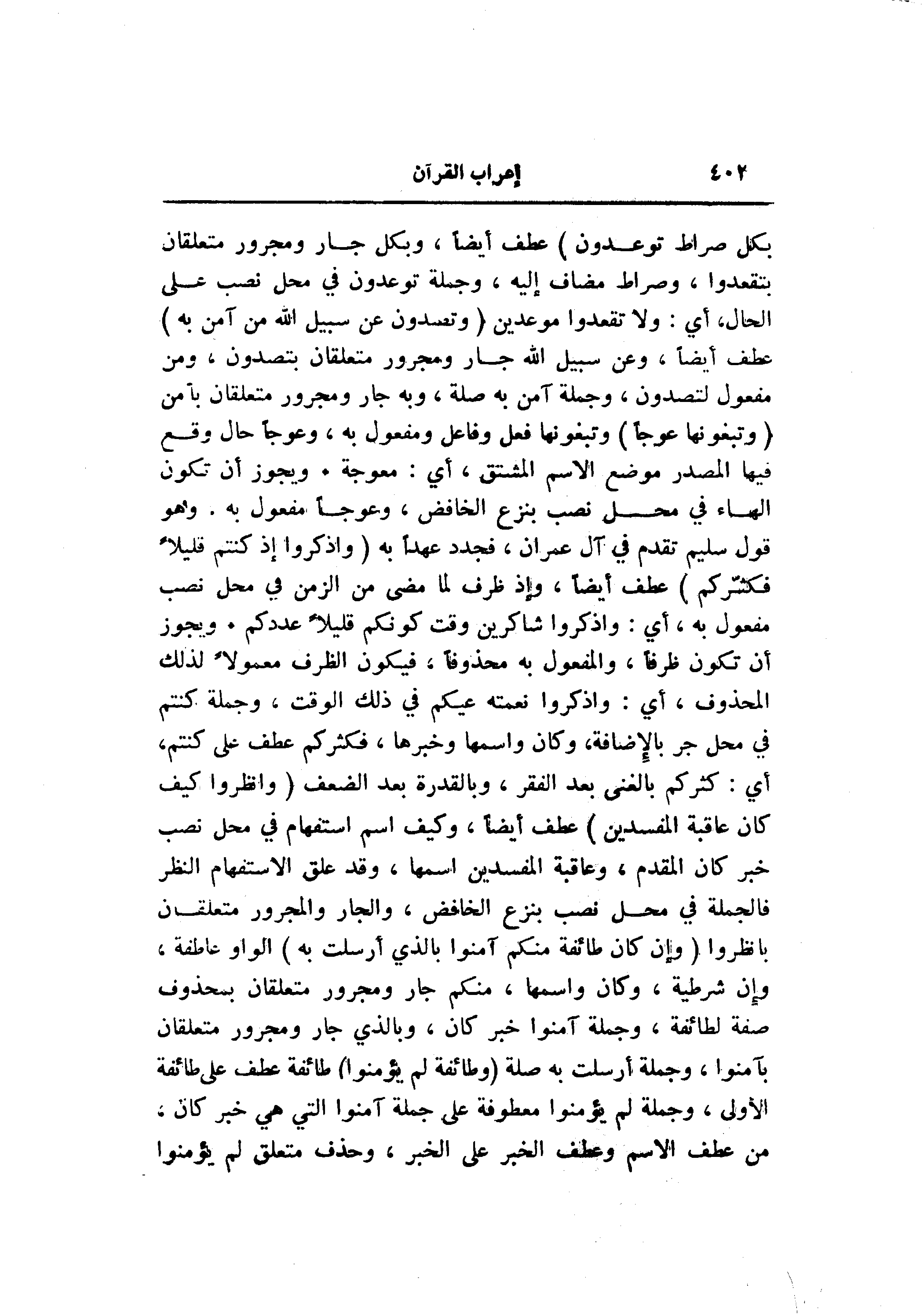 عطف أيضا، وبكل جار ومجرور متعلقان بتقعدوا، وصراط مضاف إليه، وجملة توعدون في محل نصب على الحال، أي: ولا تقعدوا موعدين (وَتَصُدُّونَ عَنْ سَبِيلِ اللَّهِ مَنْ آمَنَ بِهِ) عطف أيضا، وعن سبيل الله جار ومجرور متعلقان بتصدون، ومن مفعول لتصدون، وجملة آمن به صلة، وبه جار ومجرور متعلقان بآمن (وَتَبْغُونَها عِوَجاً) وتبغونها فعل وفاعل ومفعول به، وعوجا حال وقع فيها المصدر موضع الاسم المشتق، أي: معوجة. ويجوز أن تكون الهاء في محل نصب بنزع الخافض، وعوجا مفعول به. وهو قول سليم تقدم في آل عمران، فجدد عهدا به (وَاذْكُرُوا إِذْ كُنْتُمْ قَلِيلًا فَكَثَّرَكُمْ) عطف أيضا، وإذ ظرف لما مضى من الزمن في محل نصب مفعول به، أي: واذكروا شاكرين وقت كونكم قليلا عددكم. ويجوز أن تكون ظرفا، والمفعول به محذوفا، فيكون الظرف معمولا لذلك المحذوف، أي: واذكروا نعمته عليكم في ذلك الوقت، وجملة كنتم في محل جر بالإضافة، وكان واسمها وخبرها، فكثركم عطف على كنتم، أي: كثركم بالغنى بعد الفقر، وبالقدرة بعد الضعف (وَانْظُرُوا كَيْفَ كانَ عاقِبَةُ الْمُفْسِدِينَ) عطف أيضا، وكيف اسم استفهام في محل نصب خبر كان المقدم، وعاقبة المفسدين اسمها، وقد علق الاستفهام النظر فالجملة في محل نصب بنزع الخافض، والجار والمجرور متعلقان بانظروا (وَإِنْ كانَ طائِفَةٌ مِنْكُمْ آمَنُوا بِالَّذِي أُرْسِلْتُ بِهِ) الواو عاطفة، وإن شرطية، وكان واسمها، منكم جار ومجرور متعلقان بمحذوف صفة لطائفة، وجملة آمنوا خبر كان، وبالذي جار ومجرور متعلقان بآمنوا، وجملة أرسلت به صلة (وَطائِفَةٌ لَمْ يُؤْمِنُوا) طائفة عطف على طائفة الأولى، وجملة لم يؤمنوا معطوفة على جملة آمنوا التي هي خبر كان، من عطف الاسم وعطف الخبر على الخبر، وحذف متعلق لم يؤمنوا