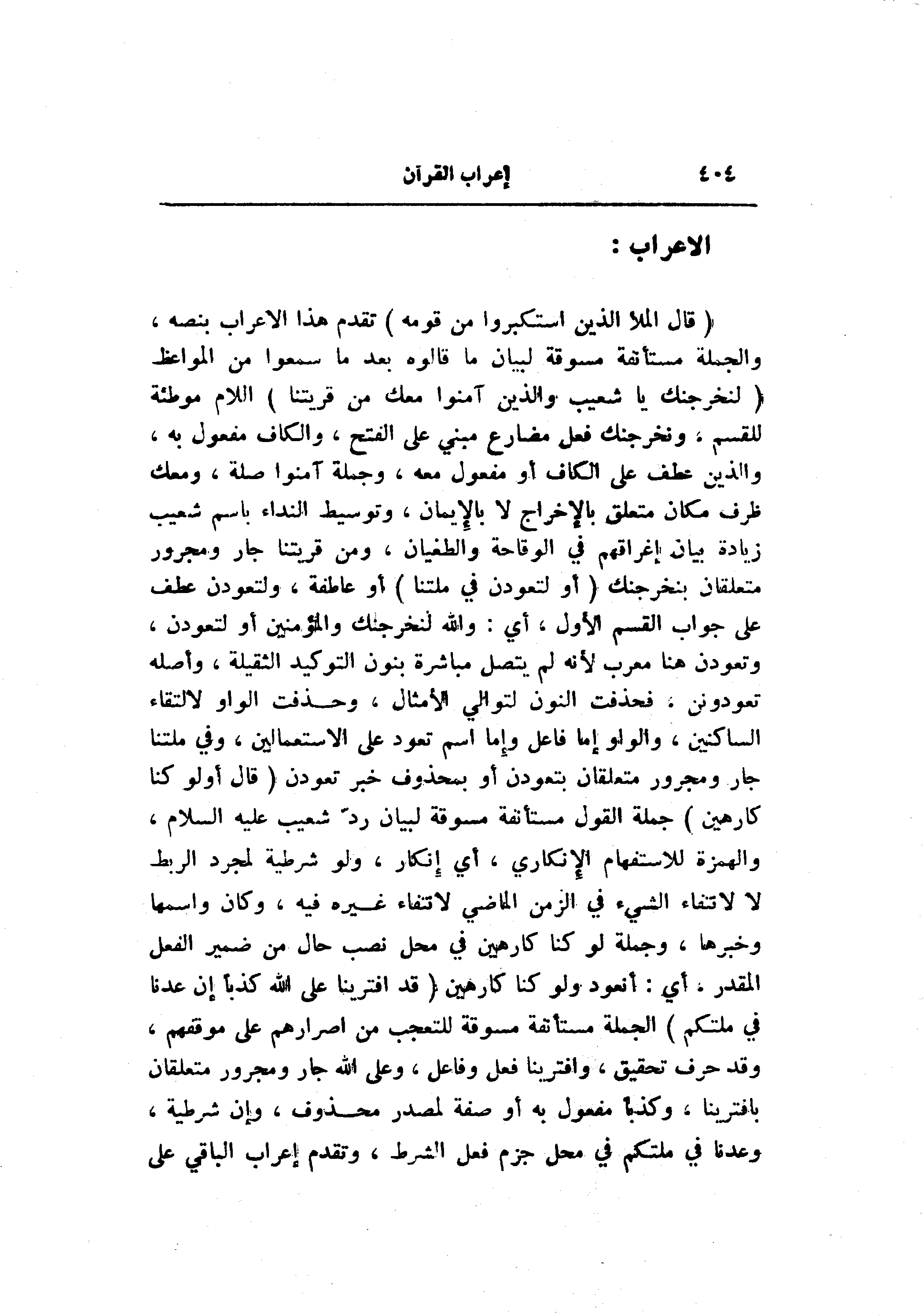(قالَ الْمَلَأُ الَّذِينَ اسْتَكْبَرُوا مِنْ قَوْمِهِ) تقدم هذا الإعراب بنصه، والجملة مستأنفة مسوقة لبيان ما قالوه بعد ما سمعوا من المواعظ (لَنُخْرِجَنَّكَ يا شُعَيْبُ وَالَّذِينَ آمَنُوا مَعَكَ مِنْ قَرْيَتِنا) اللام موطئة للقسم، ونخرجنك فعل مضارع مبني على الفتح، والكاف مفعول به، والذين عطف على الكاف أو مفعول معه، وجملة آمنوا صلة، ومعك ظرف مكان متعلق بالإخراج لا بالإيمان، وتوسيط النداء باسم شعيب زيادة بيان إغراقهم في الوقاحة والطغيان، ومن قريتنا جار ومجرور متعلقان بنخرجنك (أَوْ لَتَعُودُنَّ فِي مِلَّتِنا) أو عاطفة، ولتعودن عطف على جواب القسم الأول، أي: والله لنخرجنك والمؤمنين أو لتعودن، وتعودن هنا معرب لأنه لم يتصل مباشرة بنون التوكيد الثقيلة، وأصله تعودونن، فحذفت النون لتوالي الأمثال، وحذفت الواو لالتقاء الساكنين، والواو إما فاعل وإما اسم تعود على الاستعمالين، وفي ملتنا جار ومجرور متعلقان بتعودن أو بمحذوف خبر تعودن (قالَ أَوَلَوْ كُنَّا كارِهِينَ) جملة القول مستأنفة مسوقة لبيان ردّ شعيب عليه السلام، والهمزة للاستفهام الإنكاري، أي إنكار، ولو شرطية لمجرد الربط لا لانتفاء الشيء في الزمن الماضي لانتفاء غيره فيه، وكان واسمها وخبرها، وجملة لو كنا كارهين في محل نصب حال من ضمير الفعل المقدر، أي: أنعود ولو كنا كارهين (قَدِ افْتَرَيْنا عَلَى اللَّهِ كَذِباً إِنْ عُدْنا فِي مِلَّتِكُمْ) الجملة مستأنفة مسوقة للتعجب من إصرارهم على موقفهم، وقد حرف تحقيق، وافترينا فعل وفاعل، وعلى الله جار ومجرور متعلقان بافترينا، وكذبا مفعول به أو صفة لمصدر محذوف، وإن شرطية، وعدنا في ملتكم في محل جزم فعل الشرط، وتقدم إعراب الباقي على