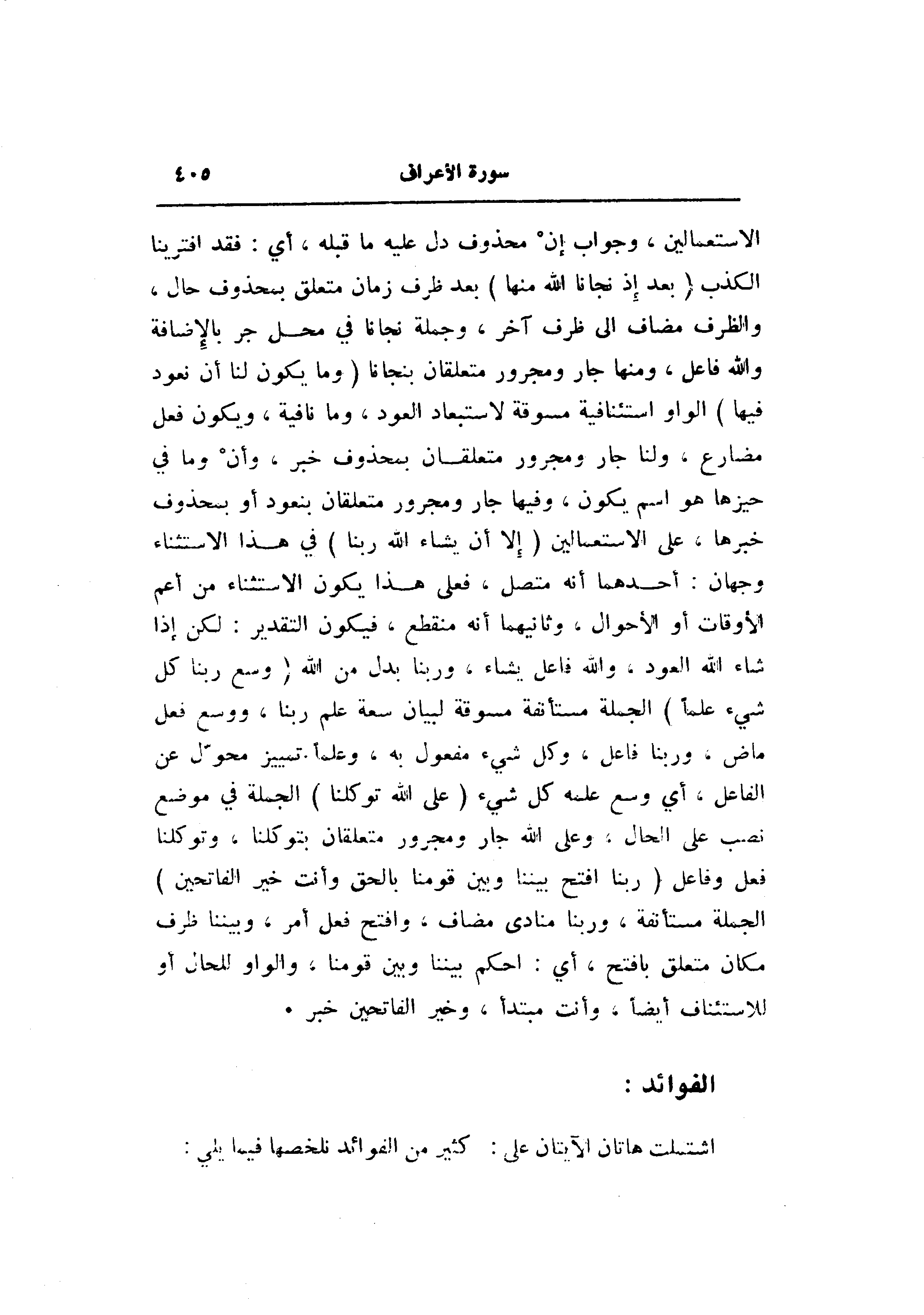 الاستعمالين، وجواب إن محذوف دل عليه ما قبله، أي: فقد افترينا الكذب (بَعْدَ إِذْ نَجَّانَا اللَّهُ مِنْها) بعد ظرف زمان متعلق بمحذوف حال، والظرف مضاف الى ظرف آخر، وجملة نجانا في محل جر بالإضافة والله فاعل، ومنها جار ومجرور متعلقان بنجانا (وَما يَكُونُ لَنا أَنْ نَعُودَ فِيها) الواو استئنافية مسوقة لاستبعاد العود، وما نافية، ويكون فعل مضارع، ولنا جار ومجرور متعلقان بمحذوف خبر، وأن وما في حيزها هو اسم يكون، وفيها جار ومجرور متعلقان بنعود أو بمحذوف خبرها، على الاستعمالين (إِلَّا أَنْ يَشاءَ اللَّهُ رَبُّنا) في هذا الاستثناء وجهان: أحدهما أنه متصل، فعلى هذا يكون الاستثناء من أعم الأوقات أو الأحوال، وثانيهما أنه منقطع، فيكون التقدير: لكن إذا شاء الله العود، والله فاعل يشاء، وربنا بدل من الله (وَسِعَ رَبُّنا كُلَّ شَيْءٍ عِلْماً) الجملة مستأنفة مسوقة لبيان سعة علم ربنا، ووسع فعل ماض، وربنا فاعل، وكل شيء مفعول به، وعلما تمييز محوّل عن الفاعل، أي وسع علمه كل شيء (عَلَى اللَّهِ تَوَكَّلْنا) الجملة في موضع نصب على الحال، وعلى الله جار ومجرور متعلقان بتوكلنا، وتوكلنا فعل وفاعل (رَبَّنَا افْتَحْ بَيْنَنا وَبَيْنَ قَوْمِنا بِالْحَقِّ وَأَنْتَ خَيْرُ الْفاتِحِينَ) الجملة مستأنفة، وربنا منادى مضاف، وافتح فعل أمر، وبيننا ظرف مكان متعلق بافتح، أي: احكم بيننا وبين قومنا، والواو للحال أو للاستئناف أيضا، وأنت مبتدأ، وخير الفاتحين خبر.
