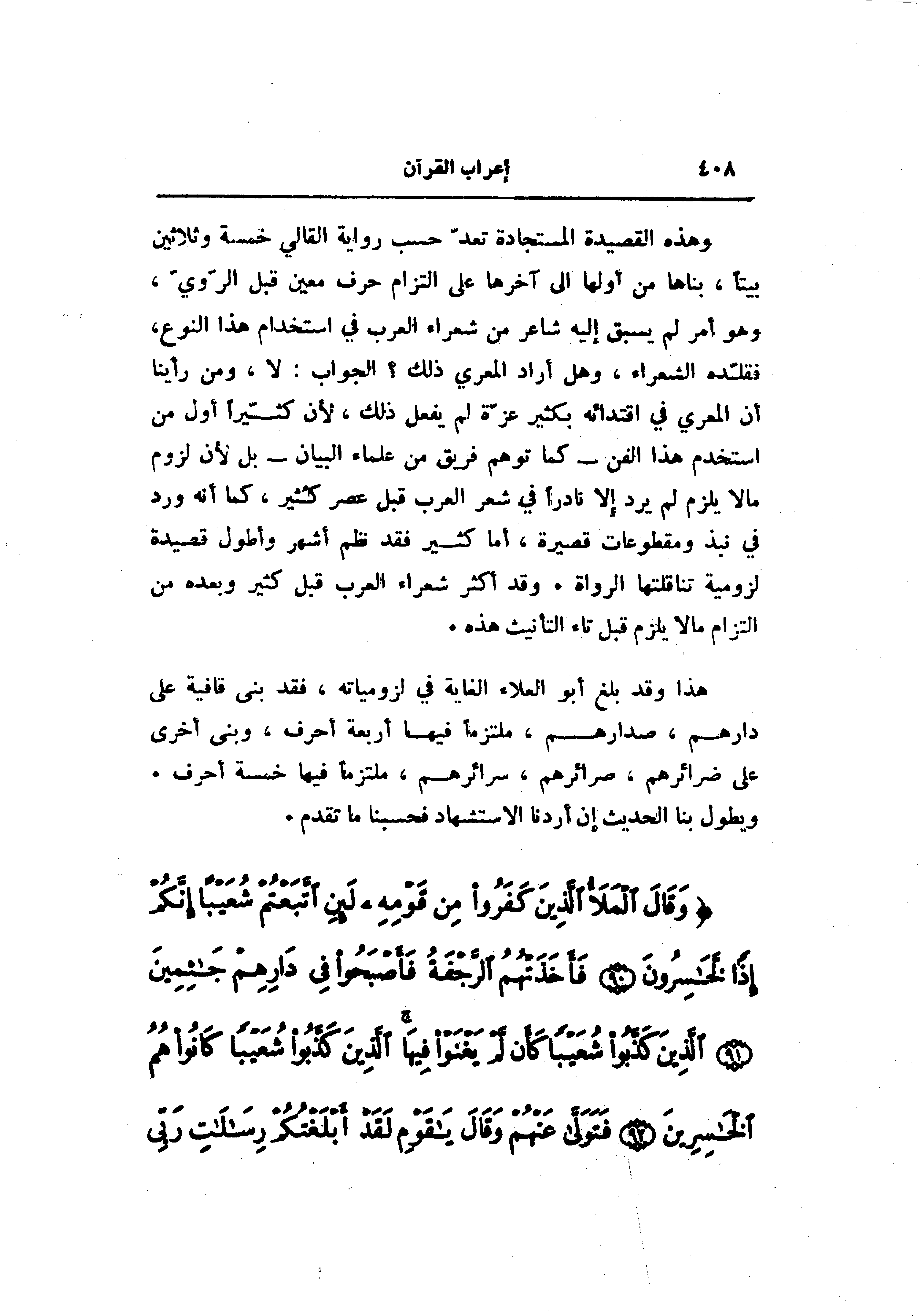 هذا وقد بلغ أبو العلاء الغاية في لزومياته، فقد بنى قافية على دارهم، صدارهم، ملتزما فيها أربعة أحرف، وبنى أخرى على ضرائرهم، صرائرهم، سرائرهم، ملتزما فيها خمسة أحرف.