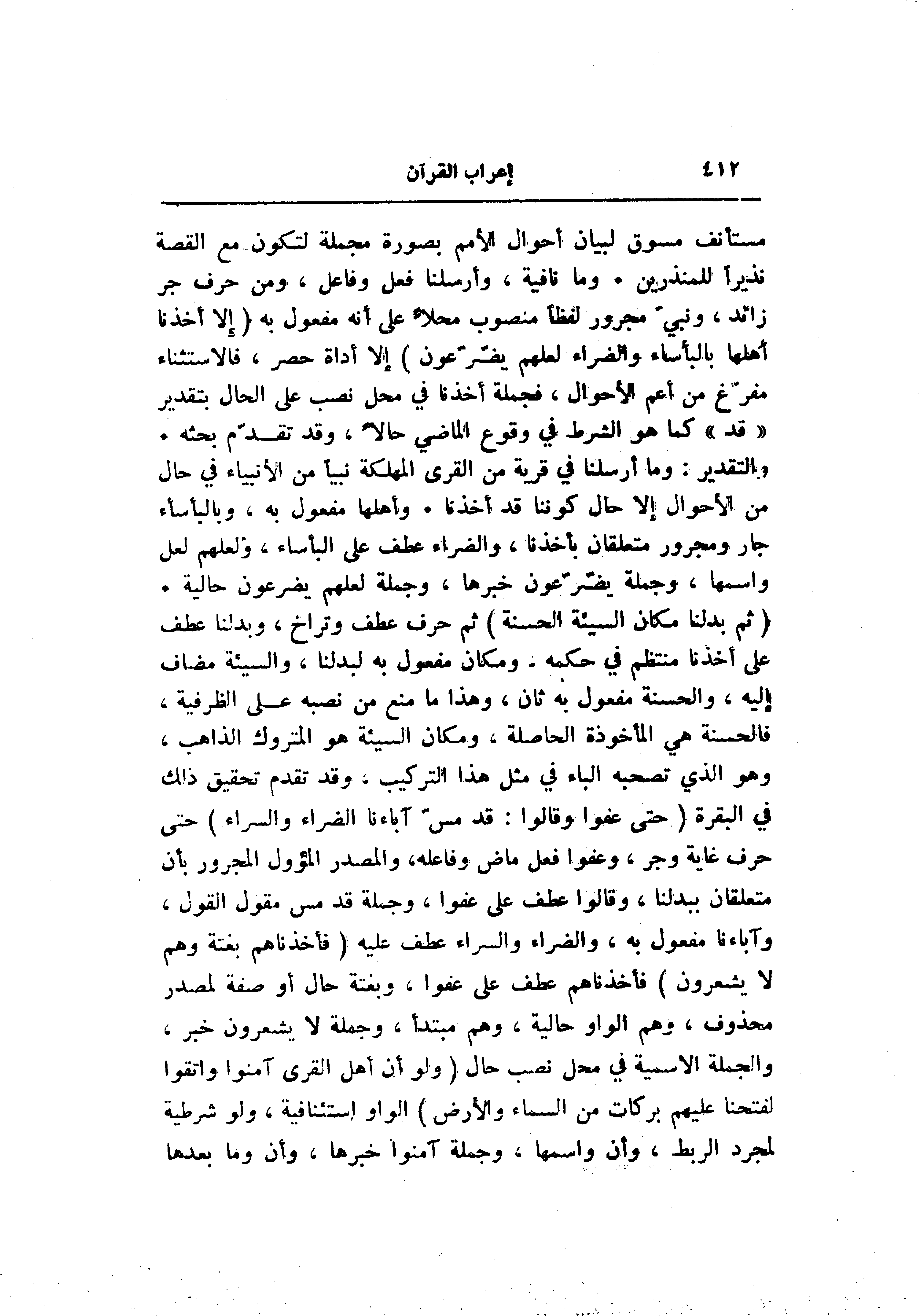 مستأنف مسوق لبيان أحوال الأمم بصورة مجملة لتكون مع القصة نذيرا للمنذرين. وما نافية، وأرسلنا فعل وفاعل، ومن حرف جر زائد، ونبيّ مجرور لفظا منصوب محلّا على أنه مفعول به (إِلَّا أَخَذْنا أَهْلَها بِالْبَأْساءِ وَالضَّرَّاءِ لَعَلَّهُمْ يَضَّرَّعُونَ) إلا أداة حصر، فالاستثناء مفرّغ من أعم الأحوال، فجملة أخذنا في محل نصب على الحال بتقدير «قد» كما هو الشرط في وقوع الماضي حالا، وقد تقدّم بحثه.
