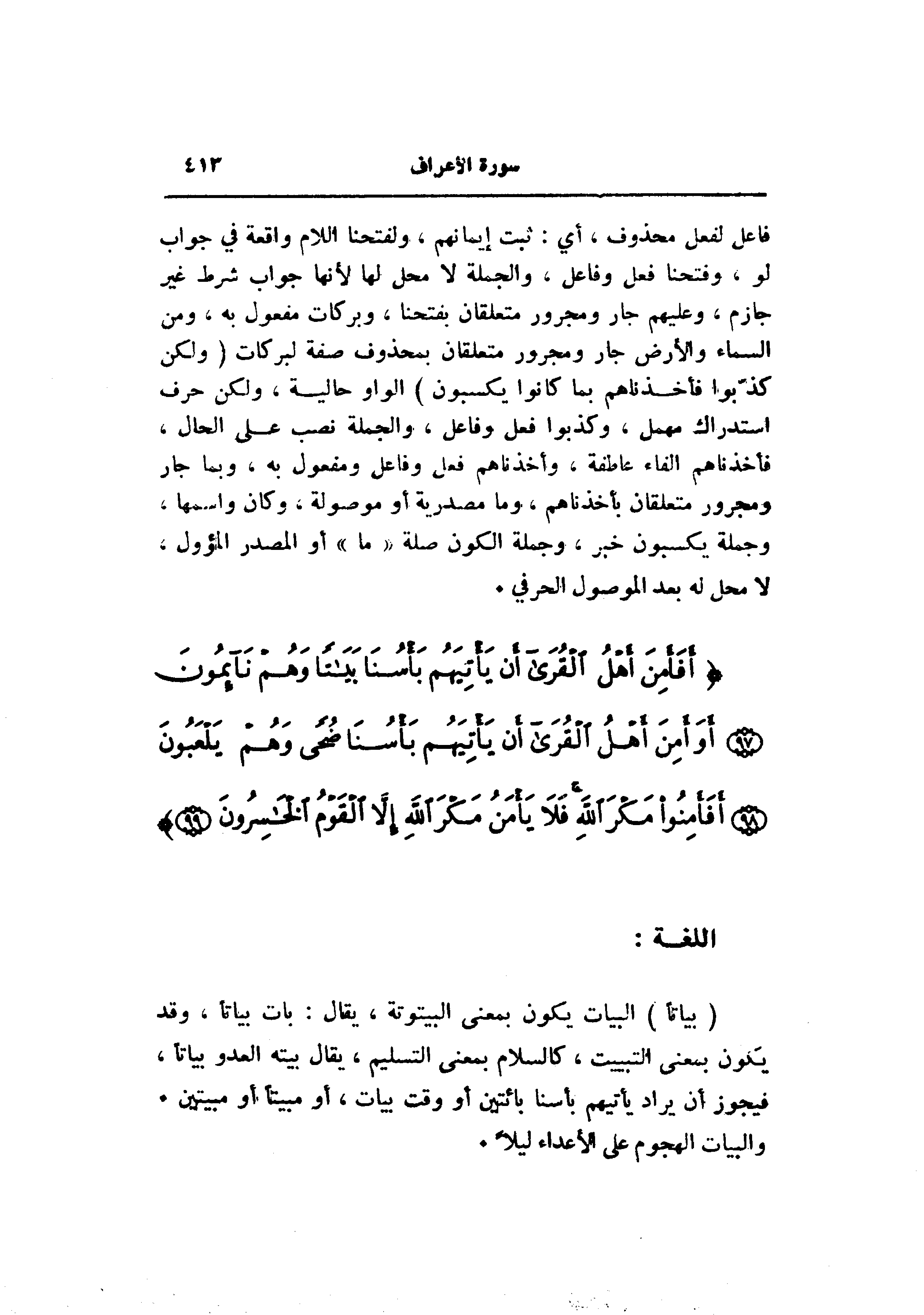 (بَياتاً) البيات يكون بمعنى البيتوتة، يقال: بات بياتا، وقد يكون بمعنى التبييت، كالسلام بمعنى التسليم، يقال بيته العدو بياتا، فيجوز أن يراد يأتيهم بأسنا بائتين أو وقت بيات، أو مبيتا أو مبيتين.