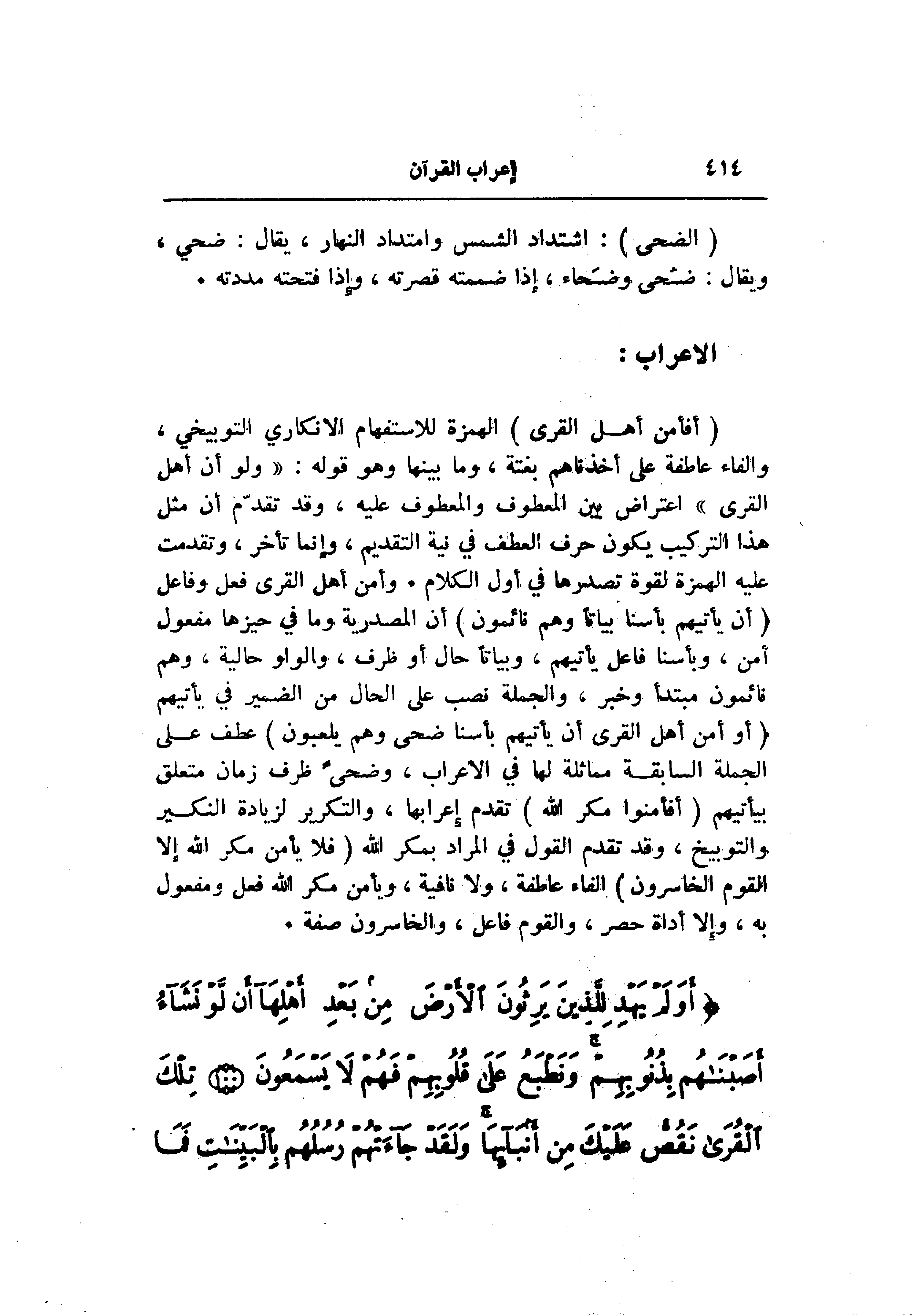 (أَفَأَمِنَ أَهْلُ الْقُرى) الهمزة للاستفهام الانكاري التوبيخي، والفاء عاطفة على أخذناهم بغتة، وما بينها وهو قوله: «ولو أن أهل القرى» اعتراض بين المعطوف والمعطوف عليه، وقد تقدّم أن مثل هذا التركيب يكون حرف العطف في نية التقديم، وإنما تأخر، وتقدمت عليه الهمزة لقوة تصدرها في أول الكلام. وأمن أهل القرى فعل وفاعل (أَنْ يَأْتِيَهُمْ بَأْسُنا بَياتاً وَهُمْ نائِمُونَ) أن المصدرية وما في حيزها مفعول أمن، وبأسنا فاعل يأتيهم، وبياتا حال أو ظرف، والواو حالية، وهم نائمون مبتدأ وخبر، والجملة نصب على الحال من الضمير في يأتيهم (أَوَأَمِنَ أَهْلُ الْقُرى أَنْ يَأْتِيَهُمْ بَأْسُنا ضُحًى وَهُمْ يَلْعَبُونَ) عطف على الجملة السابقة مماثلة لها في الإعراب، وضحى ظرف زمان متعلق بيأتيهم (أَفَأَمِنُوا مَكْرَ اللَّهِ) تقدم إعرابها، والتكرير لزيادة النكير والتوبيخ، وقد تقدم القول في المراد بمكر الله (فَلا يَأْمَنُ مَكْرَ اللَّهِ إِلَّا الْقَوْمُ الْخاسِرُونَ) الفاء عاطفة، ولا نافية، ويأمن مكر الله فعل ومفعول به، وإلا أداة حصر، والقوم فاعل، والخاسرون صفة.