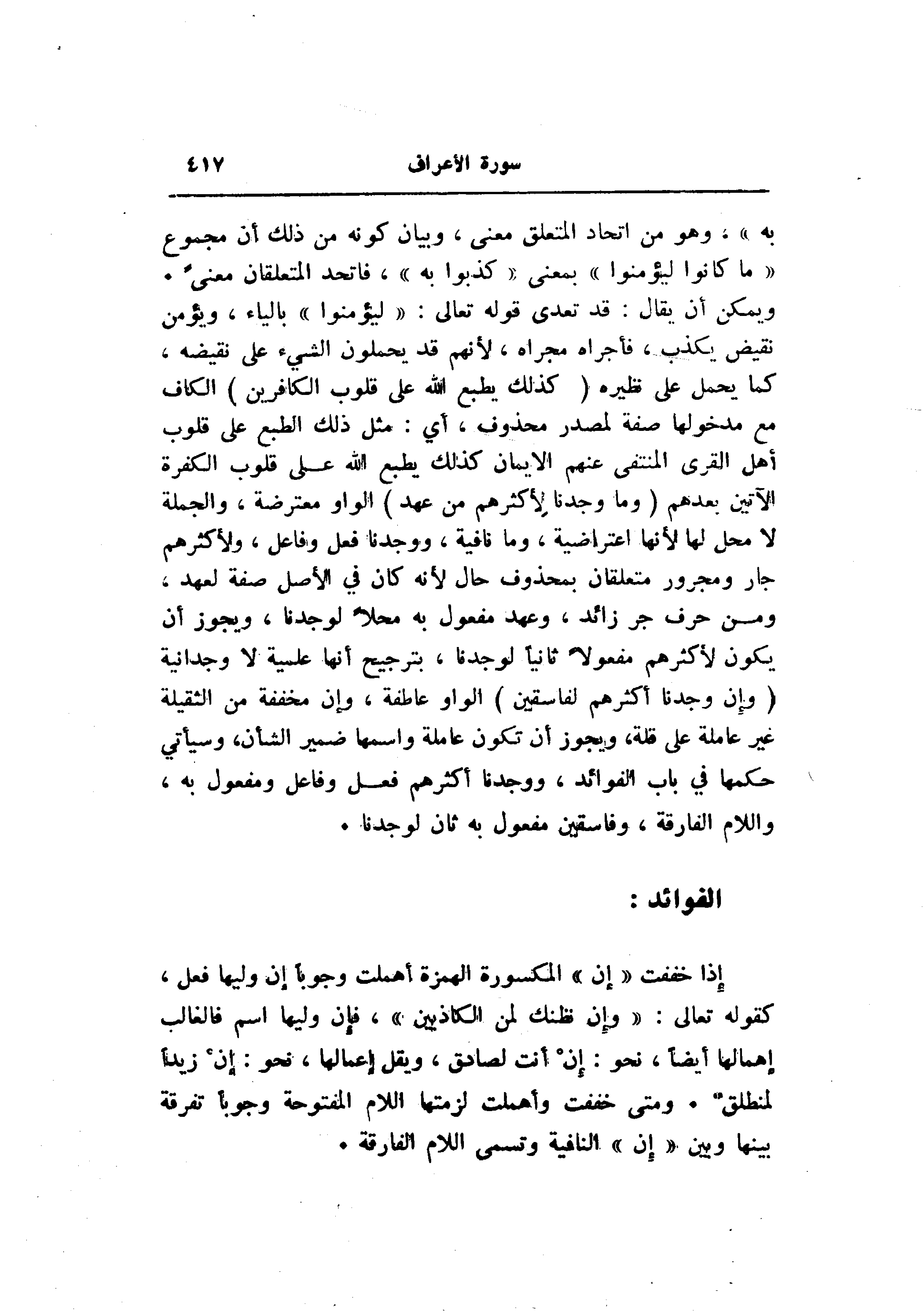 ويمكن أن يقال: قد تعدى قوله تعالى: «ليؤمنوا» بالياء، ويؤمن نقيض يكذب، فأجراه مجراه، لأنهم قد يحملون الشيء على نقيضه، كما يحمل على نظيره (كَذلِكَ يَطْبَعُ اللَّهُ عَلى قُلُوبِ الْكافِرِينَ) الكاف مع مدخولها صفة لمصدر محذوف، أي: مثل ذلك الطبع على قلوب أهل القرى المنتفى عنهم الايمان كذلك يطبع الله على قلوب الكفرة الآتين بعدهم (وَما وَجَدْنا لِأَكْثَرِهِمْ مِنْ عَهْدٍ) الواو معترضة، والجملة لا محل لها لأنها اعتراضية، وما نافية، ووجدنا فعل وفاعل، ولأكثرهم جار ومجرور متعلقان بمحذوف حال لأنه كان في الأصل صفة لعهد، ومن حرف جر زائد، وعهد مفعول به محلا لوجدنا، ويجوز أن يكون لأكثرهم مفعولا ثانيا لوجدنا، بترجيح أنها علمية لا وجدانية (وَإِنْ وَجَدْنا أَكْثَرَهُمْ لَفاسِقِينَ) الواو عاطفة، وإن مخففة من الثقيلة غير عاملة على قلة، ويجوز أن تكون عاملة واسمها ضمير الشأن، وسيأتي حكمها في باب الفوائد، ووجدنا أكثرهم فعل وفاعل ومفعول به، واللام الفارقة، وفاسقين مفعول به ثان لوجدنا.