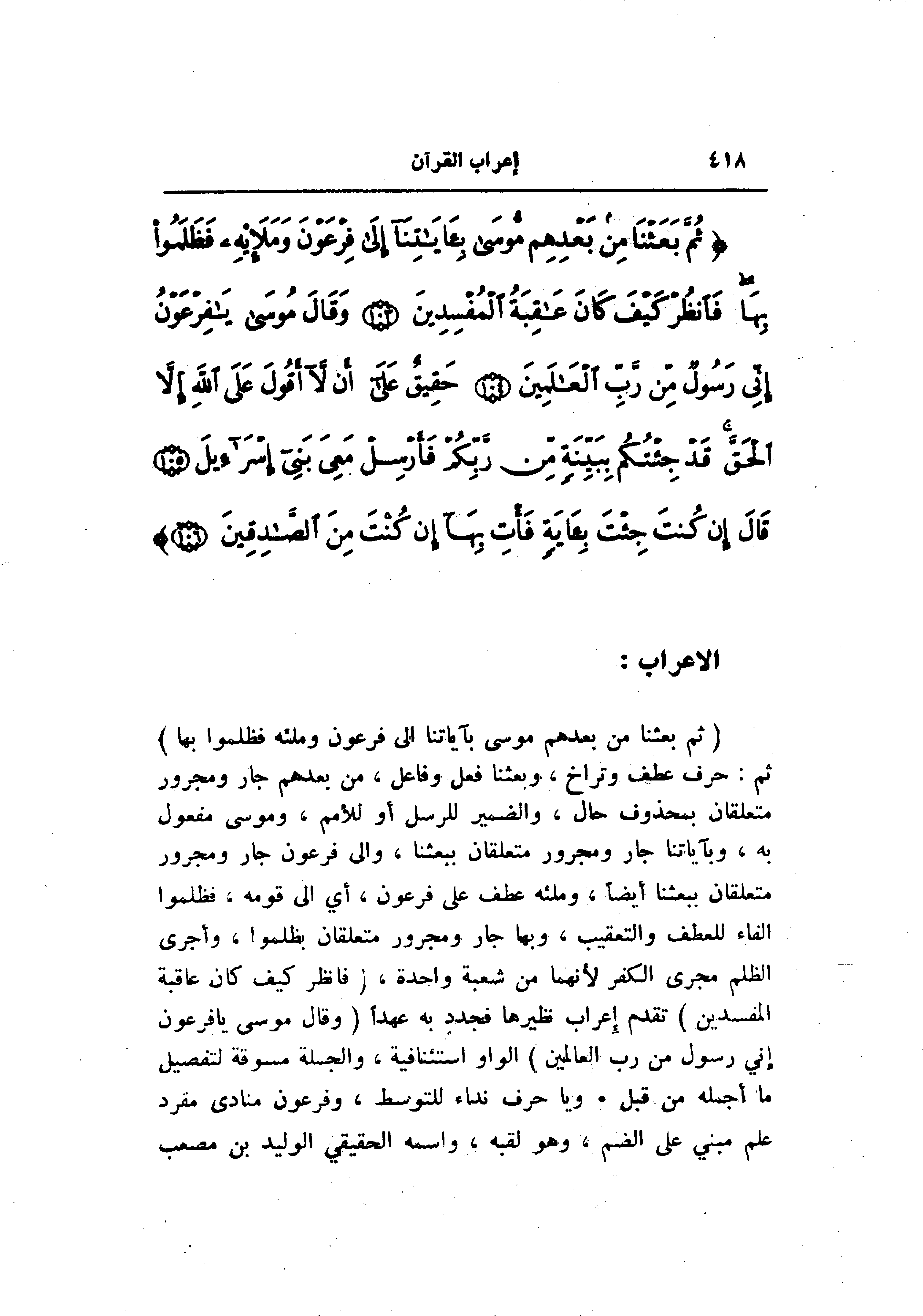 (ثُمَّ بَعَثْنا مِنْ بَعْدِهِمْ مُوسى بِآياتِنا إِلى فِرْعَوْنَ وَمَلَائِهِ فَظَلَمُوا بِها) ثم: حرف عطف وتراخ، وبعثنا فعل وفاعل، من بعدهم جار ومجرور متعلقان بمحذوف حال، والضمير للرسل أو للأمم، وموسى مفعول به، وبآياتنا جار ومجرور متعلقان ببعثنا، والى فرعون جار ومجرور متعلقان ببعثنا أيضا، وملئه عطف على فرعون، أي الى قومه، فظلموا الفاء للعطف والتعقيب، وبها جار ومجرور متعلقان بظلموا، وأجرى الظلم مجرى الكفر لأنهما من شعبة واحدة، (فَانْظُرْ كَيْفَ كانَ عاقِبَةُ الْمُفْسِدِينَ) تقدم إعراب نظيرها فجدد به عهدا (وَقالَ مُوسى يا فِرْعَوْنُ إِنِّي رَسُولٌ مِنْ رَبِّ الْعالَمِينَ) الواو استئنافية، والجملة مسوقة لتفصيل ما أجمله من قبل. ويا حرف نداء للتوسط، وفرعون منادى مفرد علم مبني على الضم، وهو لقبه، واسمه الحقيقي الوليد بن مصعب