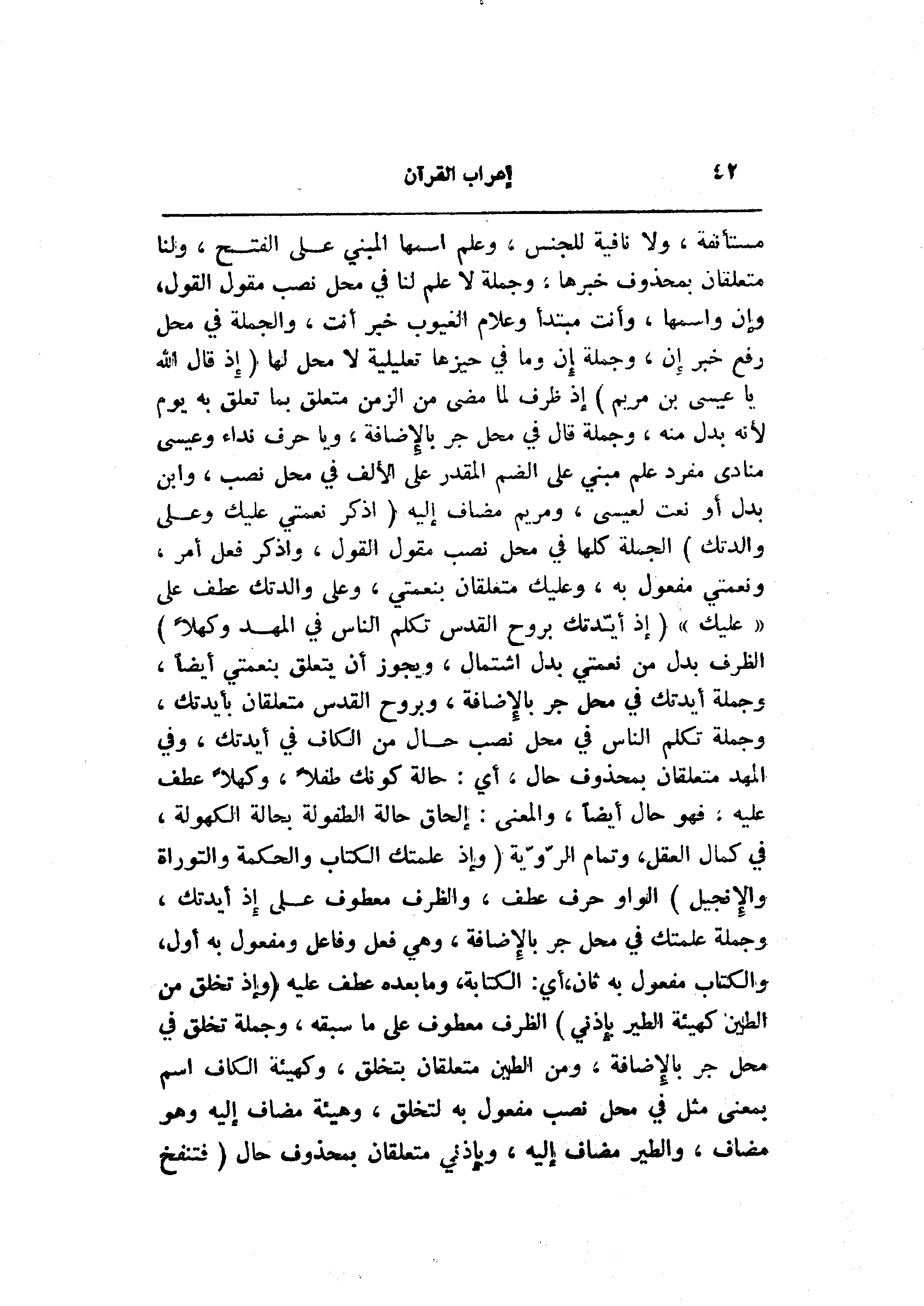 مستأنفة، ولا نافية للجنس، وعلم اسمها المبني على الفتح، ولنا متعلقان بمحذوف خبرها، وجملة لا علم لنا في محل نصب مقول القول، وإن واسمها، وأنت مبتدأ وعلام الغيوب خبر أنت، والجملة في محل رفع خبر إن، وجملة إن وما في حيزها تعليلية لا محل لها (إِذْ قالَ اللَّهُ يا عِيسَى ابْنَ مَرْيَمَ) إذ ظرف لما مضى من الزمن متعلق بما تعلق به يوم لأنه بدل منه، وجملة قال في محل جر بالإضافة، ويا حرف نداء وعيسى منادى مفرد علم مبني على الضم المقدر على الألف في محل نصب، وابن بدل أو نعت لعيسى، ومريم مضاف إليه (اذْكُرْ نِعْمَتِي عَلَيْكَ وَعَلى والِدَتِكَ) الجملة كلها في محل نصب مقول القول، واذكر فعل أمر، ونعمتي مفعول به، وعليك متعلقان بنعمتي، وعلى والدتك عطف على «عليك» (إِذْ أَيَّدْتُكَ بِرُوحِ الْقُدُسِ تُكَلِّمُ النَّاسَ فِي الْمَهْدِ وَكَهْلًا) الظرف بدل من نعمتي بدل اشتمال، ويجوز أن يتعلق بنعمتي أيضا، وجملة أيدتك في محل جر بالإضافة، وبروح القدس متعلقان بأيدتك، وجملة تكلم الناس في محل نصب حال من الكاف في أيدتك، وفي المهد متعلقان بمحذوف حال، أي: حالة كونك طفلا، وكهلا عطف عليه، فهو حال أيضا، والمعنى: إلحاق حالة الطفولة بحالة الكهولة، في كمال العقل، وتمام الرّويّة (وَإِذْ عَلَّمْتُكَ الْكِتابَ وَالْحِكْمَةَ وَالتَّوْراةَ وَالْإِنْجِيلَ) الواو حرف عطف، والظرف معطوف على إذ أيدتك، وجملة علمتك في محل جر بالإضافة، وهي فعل وفاعل ومفعول به أول، والكتاب مفعول به ثان، أي: الكتابة، وما بعده عطف عليه (وَإِذْ تَخْلُقُ مِنَ الطِّينِ كَهَيْئَةِ الطَّيْرِ بِإِذْنِي) الظرف معطوف على ما سبقه، وجملة تخلق في محل جر بالإضافة، ومن الطين متعلقان بتخلق، وكهيئة الكاف اسم بمعنى مثل في محل نصب مفعول به لتخلق، وهيئة مضاف إليه وهو مضاف، والطير مضاف إليه، وبإذني متعلقان بمحذوف حال (فَتَنْفُخُ