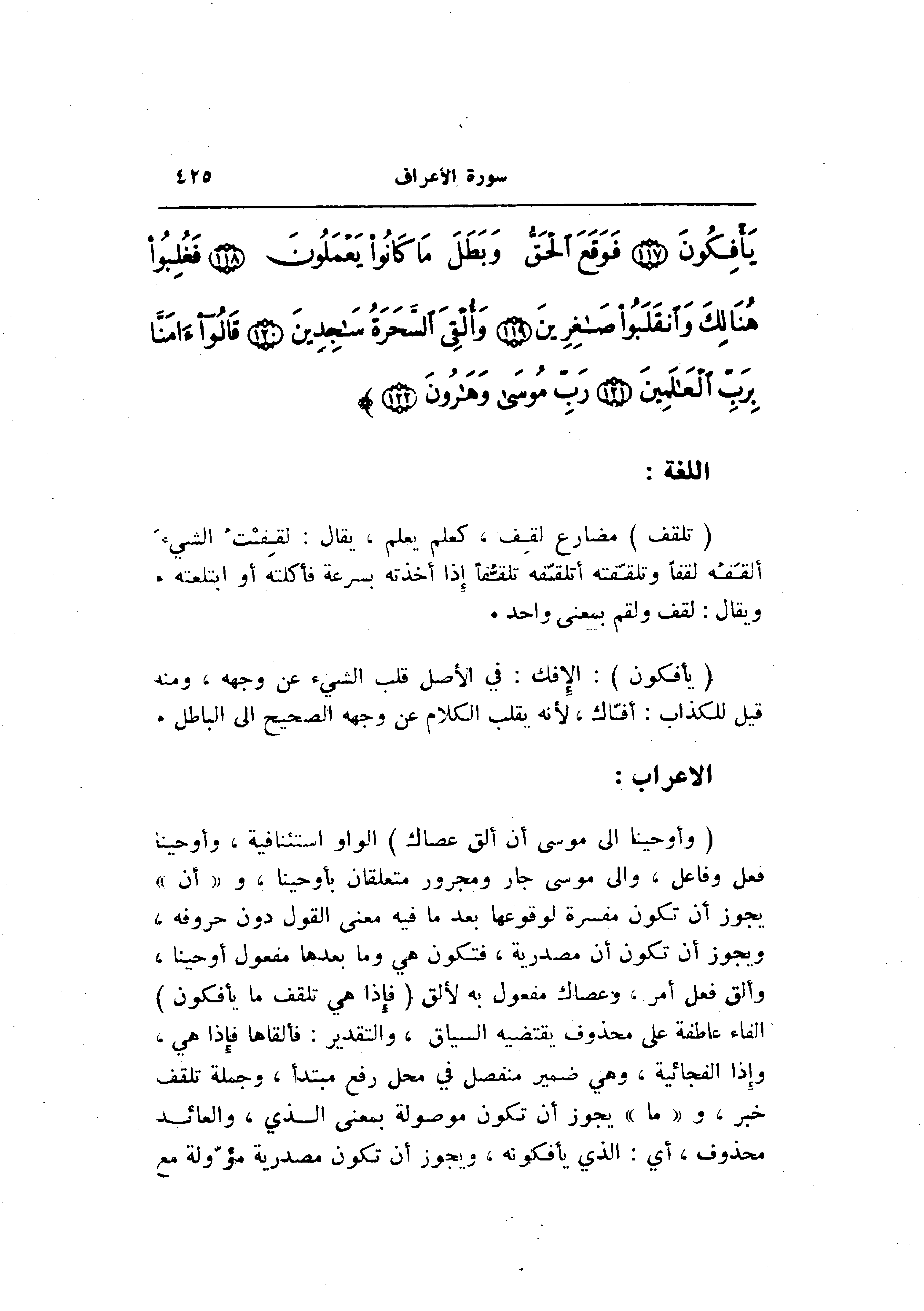 (وَأَوْحَيْنا إِلى مُوسى أَنْ أَلْقِ عَصاكَ) الواو استئنافية، وأوحينا فعل وفاعل، والى موسى جار ومجرور متعلقان بأوحينا، و «أن» يجوز أن تكون مفسرة لوقوعها بعد ما فيه معنى القول دون حروفه، ويجوز أن تكون أن مصدرية، فتكون هي وما بعدها مفعول أوحينا، وألق فعل أمر، وعصاك مفعول به لألق (فَإِذا هِيَ تَلْقَفُ ما يَأْفِكُونَ) الفاء عاطفة على محذوف يقتضيه السياق، والتقدير: فألقاها فإذا هي، وإذا الفجائية، وهي ضمير منفصل في محل رفع مبتدأ، وجملة تلقف خبر، و «ما» يجوز أن تكون موصولة بمعنى الذي، والعائد محذوف، أي: الذي يأفكونه، ويجوز أن تكون مصدرية مؤوّلة مع