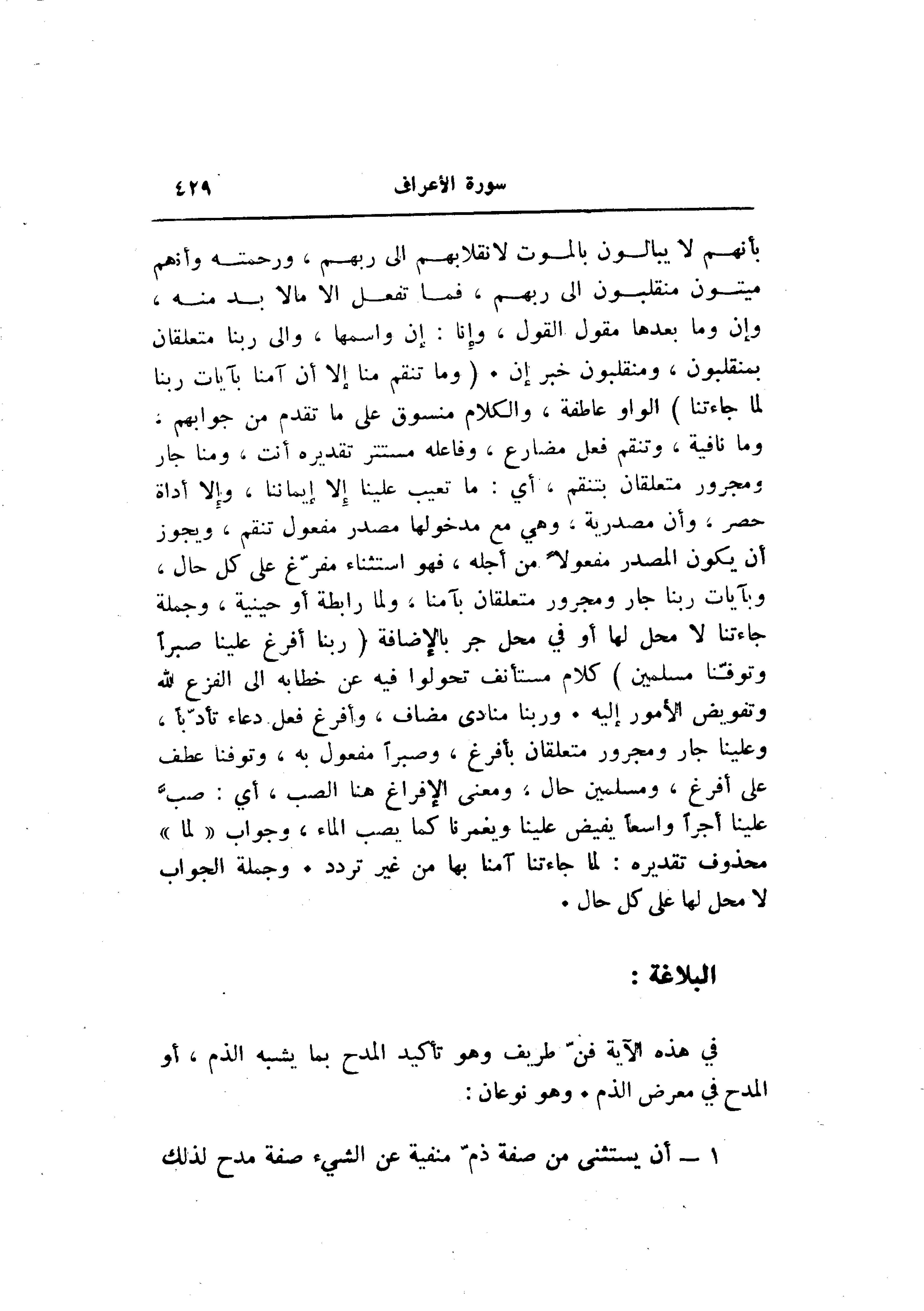 بأنهم لا يبالون بالموت لانقلابهم الى ربهم، ورحمته وأنهم ميتون منقلبون الى ربهم، فما تفعل الا مالا بد منه، وإن وما بعدها مقول القول، وإنا: إن واسمها، والى ربنا متعلقان بمنقلبون، ومنقلبون خبر إن. (وَما تَنْقِمُ مِنَّا إِلَّا أَنْ آمَنَّا بِآياتِ رَبِّنا لَمَّا جاءَتْنا) الواو عاطفة، والكلام منسوق على ما تقدم من جوابهم، وما نافية، وتنقم فعل مضارع، وفاعله مستتر تقديره أنت، ومنا جار ومجرور متعلقان بتنقم، أي: ما تعيب علينا إلا إيماننا، وإلا أداة حصر، وأن مصدرية، وهي مع مدخولها مصدر مفعول تنقم، ويجوز أن يكون المصدر مفعولا من أجله، فهو استثناء مفرّغ على كل حال، وبآيات ربنا جار ومجرور متعلقان بآمنا، ولما رابطة أو حينية، وجملة جاءتنا لا محل لها أو في محل جر بالإضافة (رَبَّنا أَفْرِغْ عَلَيْنا صَبْراً وَتَوَفَّنا مُسْلِمِينَ) كلام مستأنف تحولوا فيه عن خطابه الى الفزع لله وتفويض الأمور إليه. وربنا منادى مضاف، وأفرغ فعل دعاء تأدّبا، وعلينا جار ومجرور متعلقان بأفرغ، وصبرا مفعول به، وتوفنا عطف على أفرغ، ومسلمين حال، ومعنى الإفراغ هنا الصب، أي: صبّ علينا أجرا واسعا يفيض علينا ويغمرنا كما يصب الماء، وجواب «لما» محذوف تقديره: لما جاءتنا آمنا بها من غير تردد. وجملة الجواب لا محل لها على كل حال.